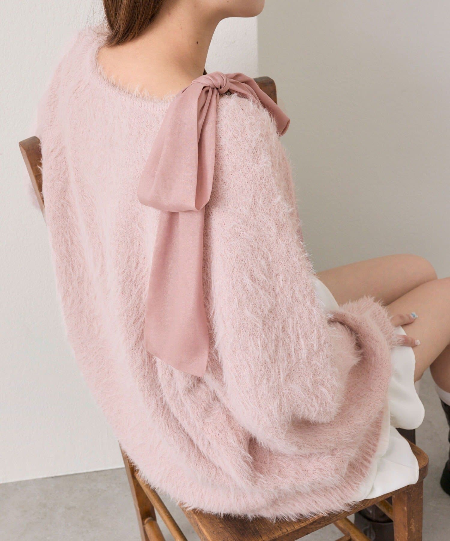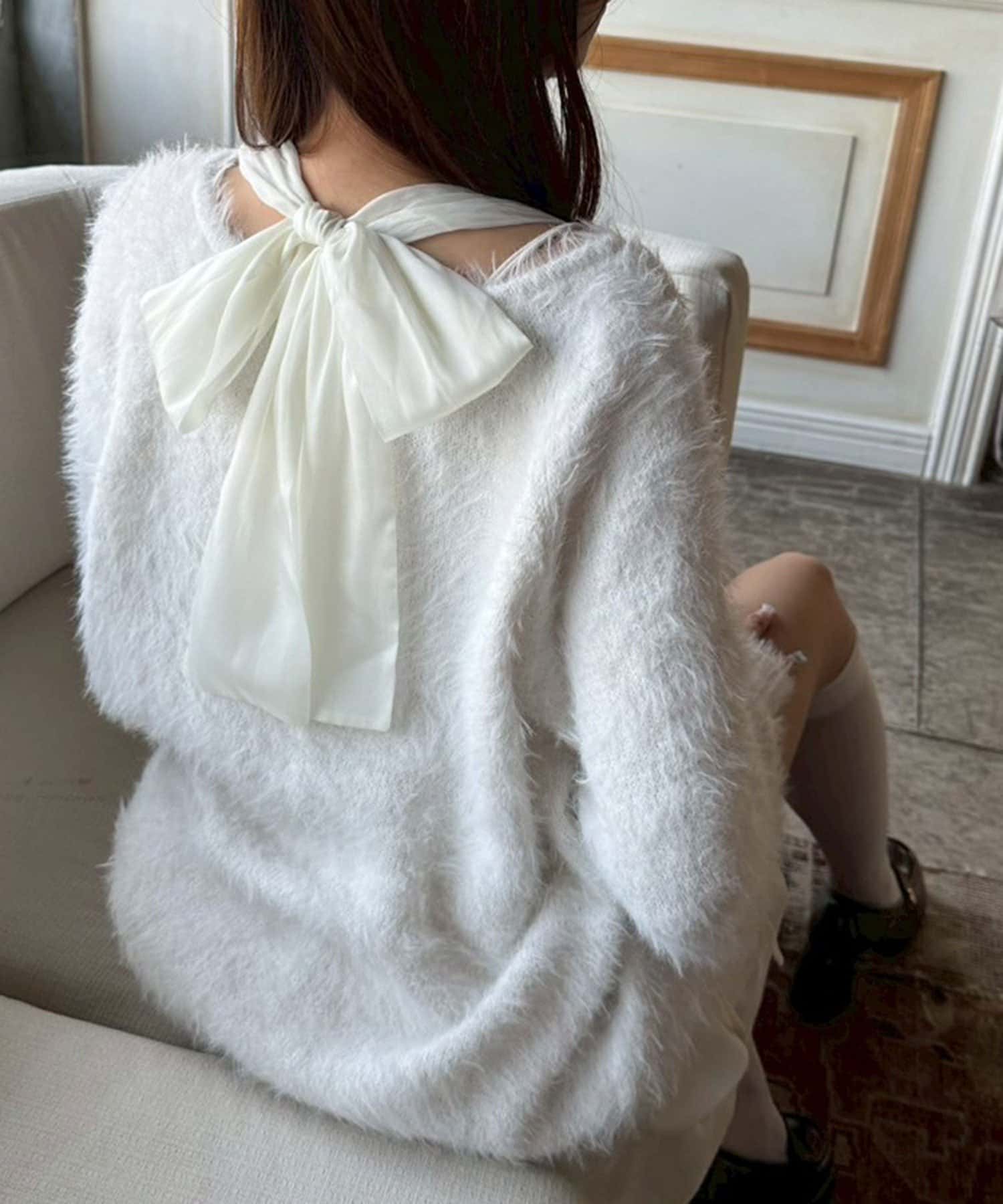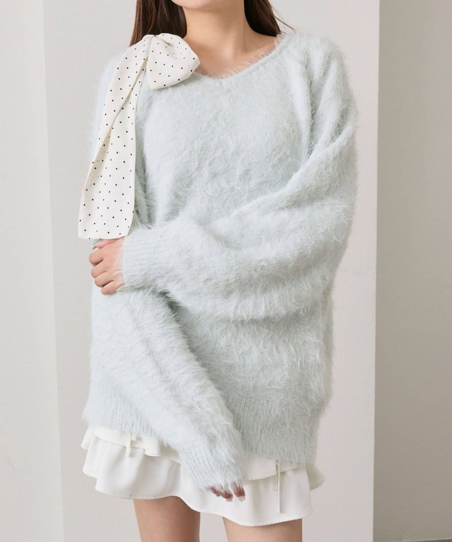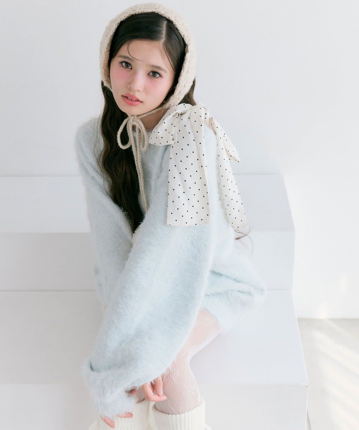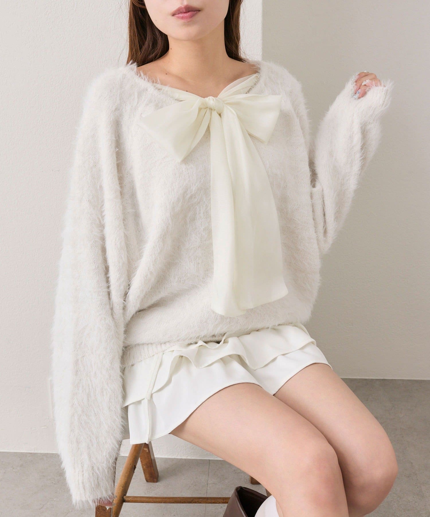 ・ふわふわシャギーニットに、大きなリボンをあしらったガーリーデザイン。