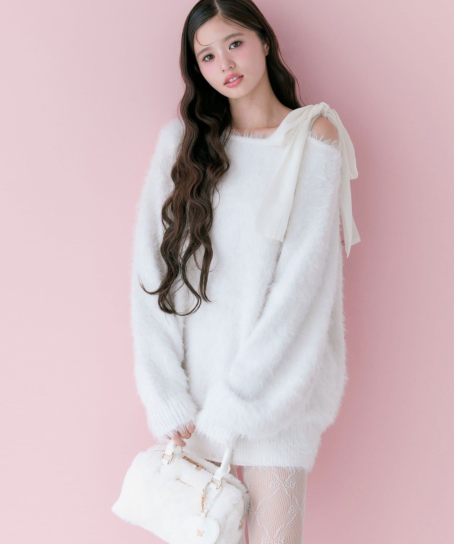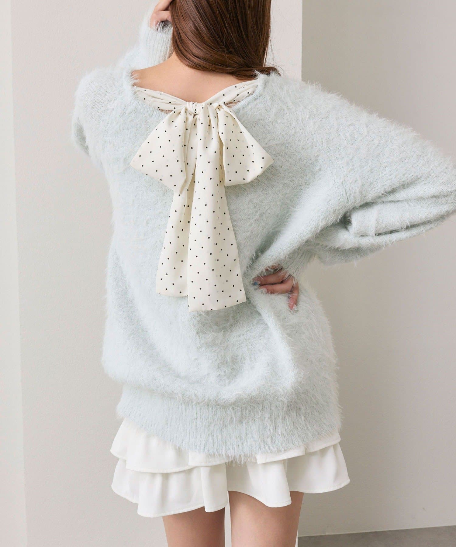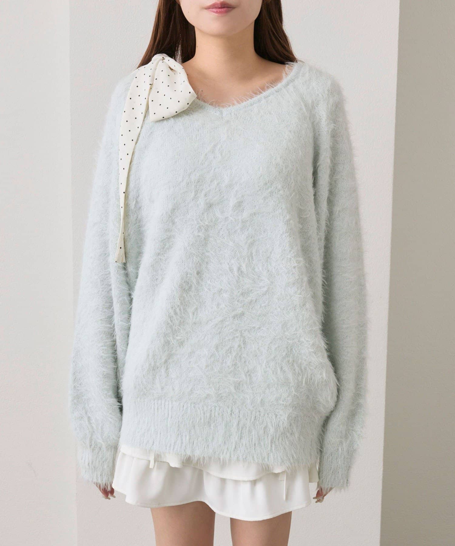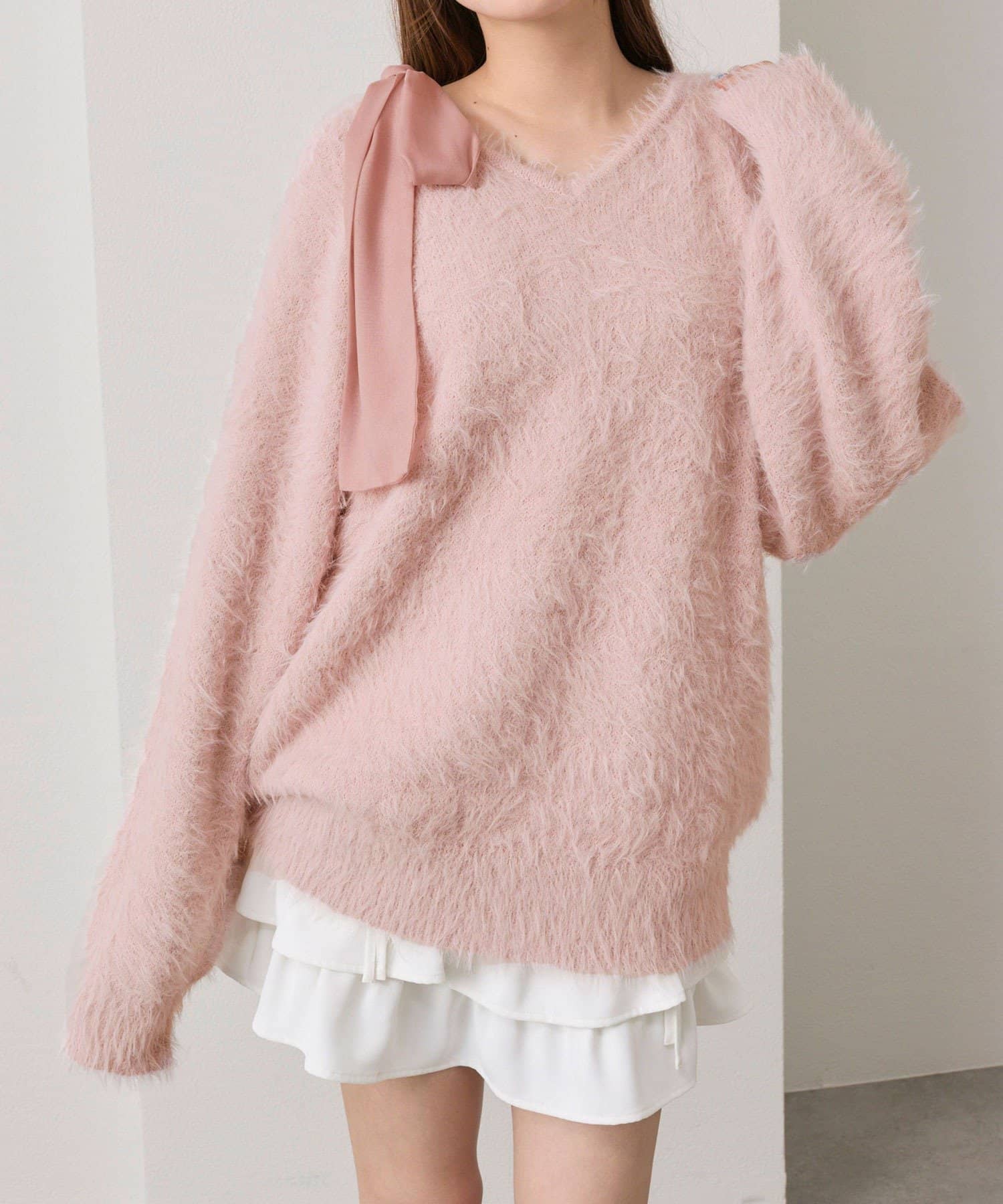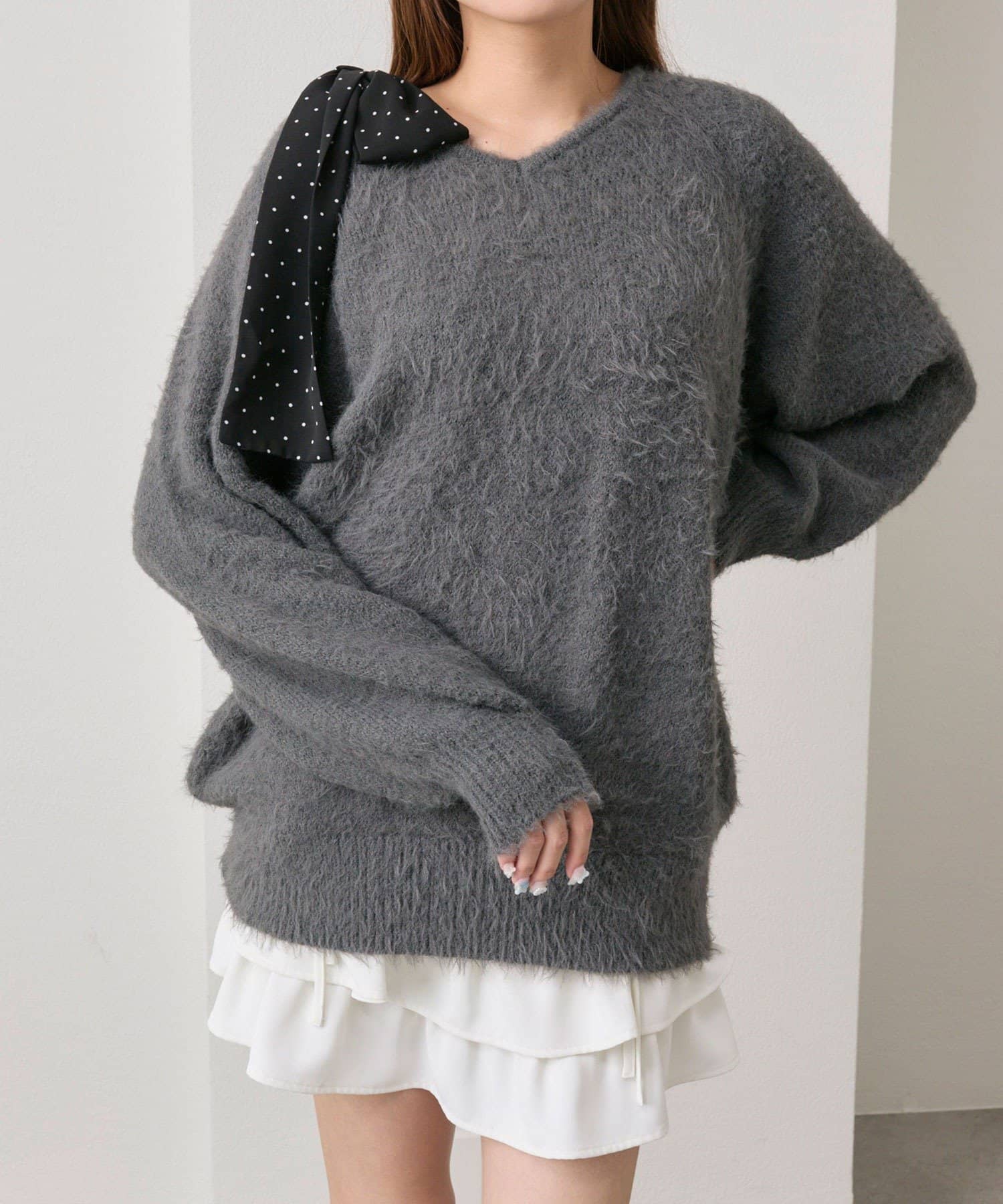 ・ふわふわシャギーニットに、大きなリボンをあしらったガーリーデザイン。