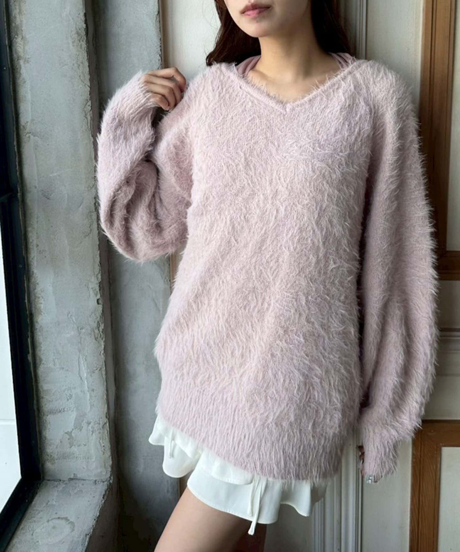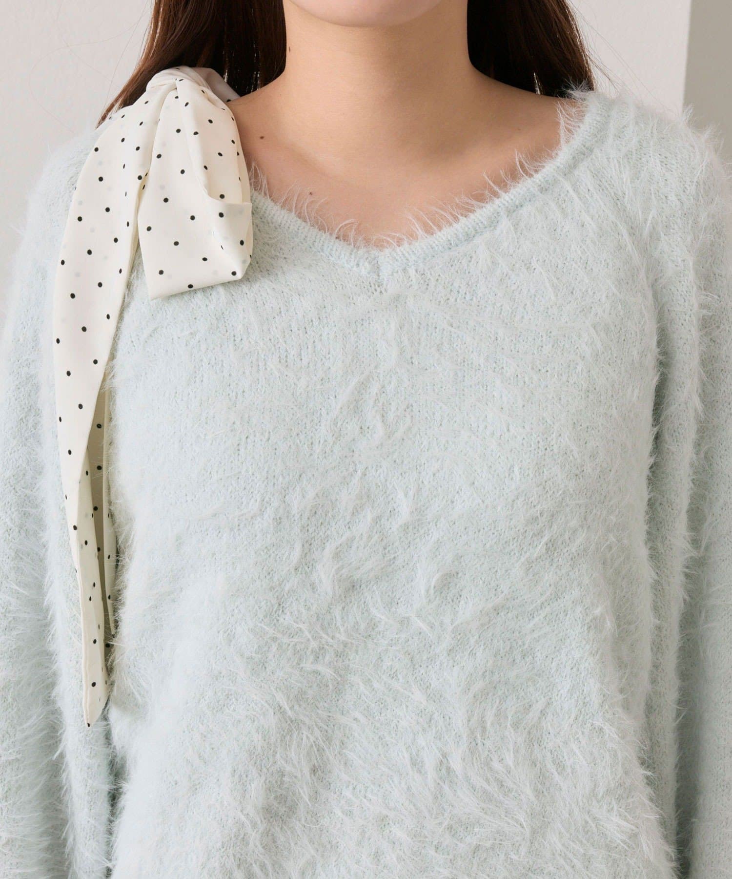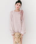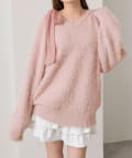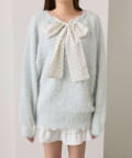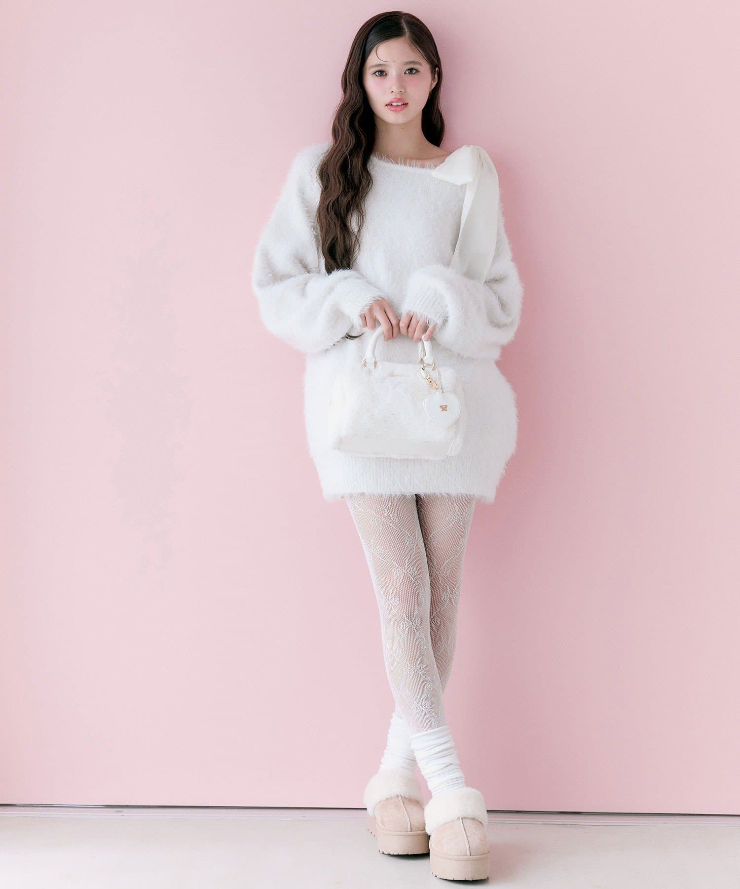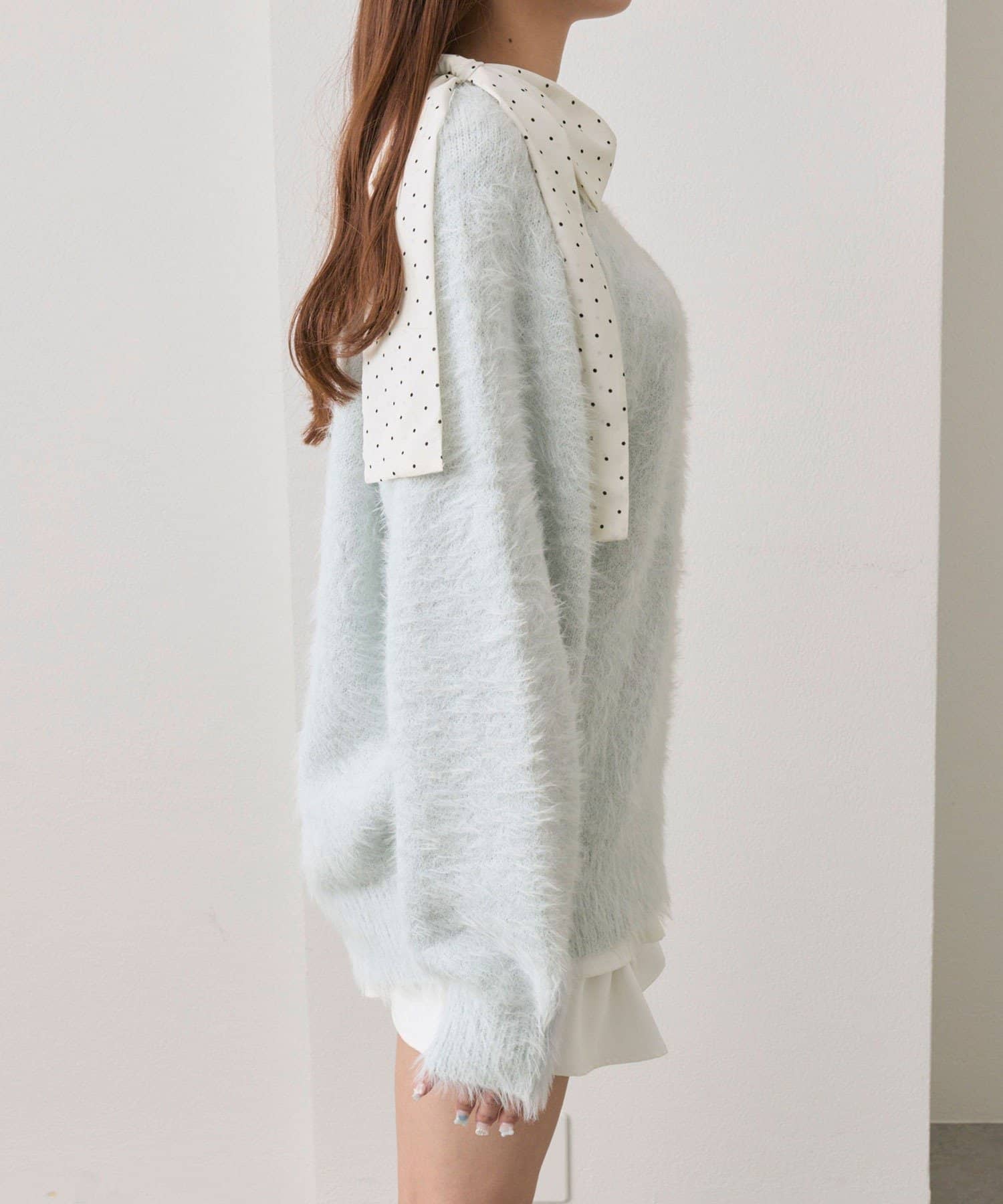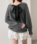 ・ふわふわシャギーニットに、大きなリボンをあしらったガーリーデザイン。