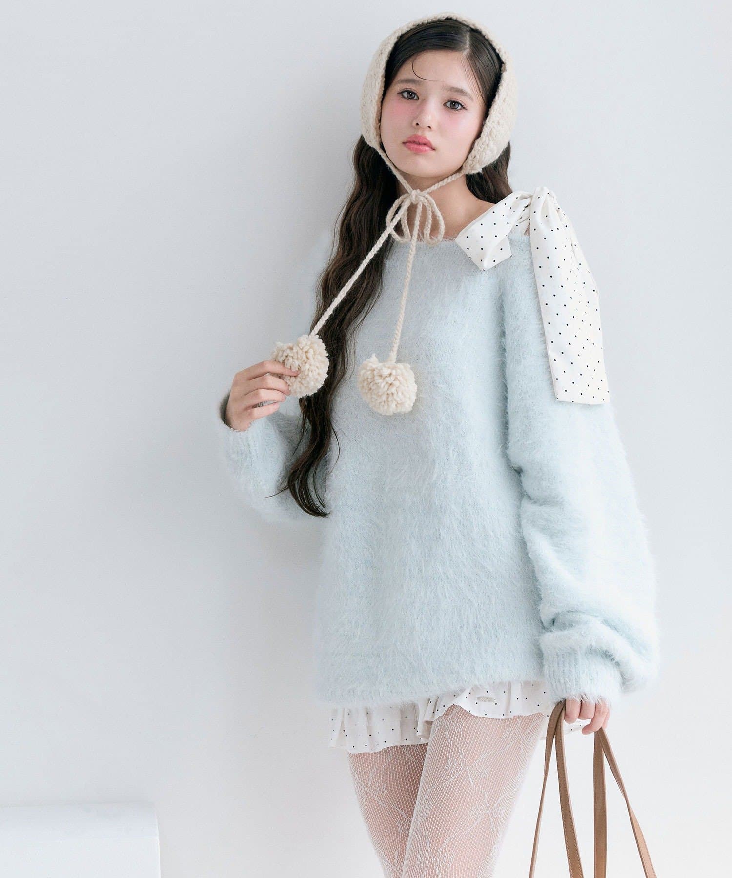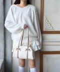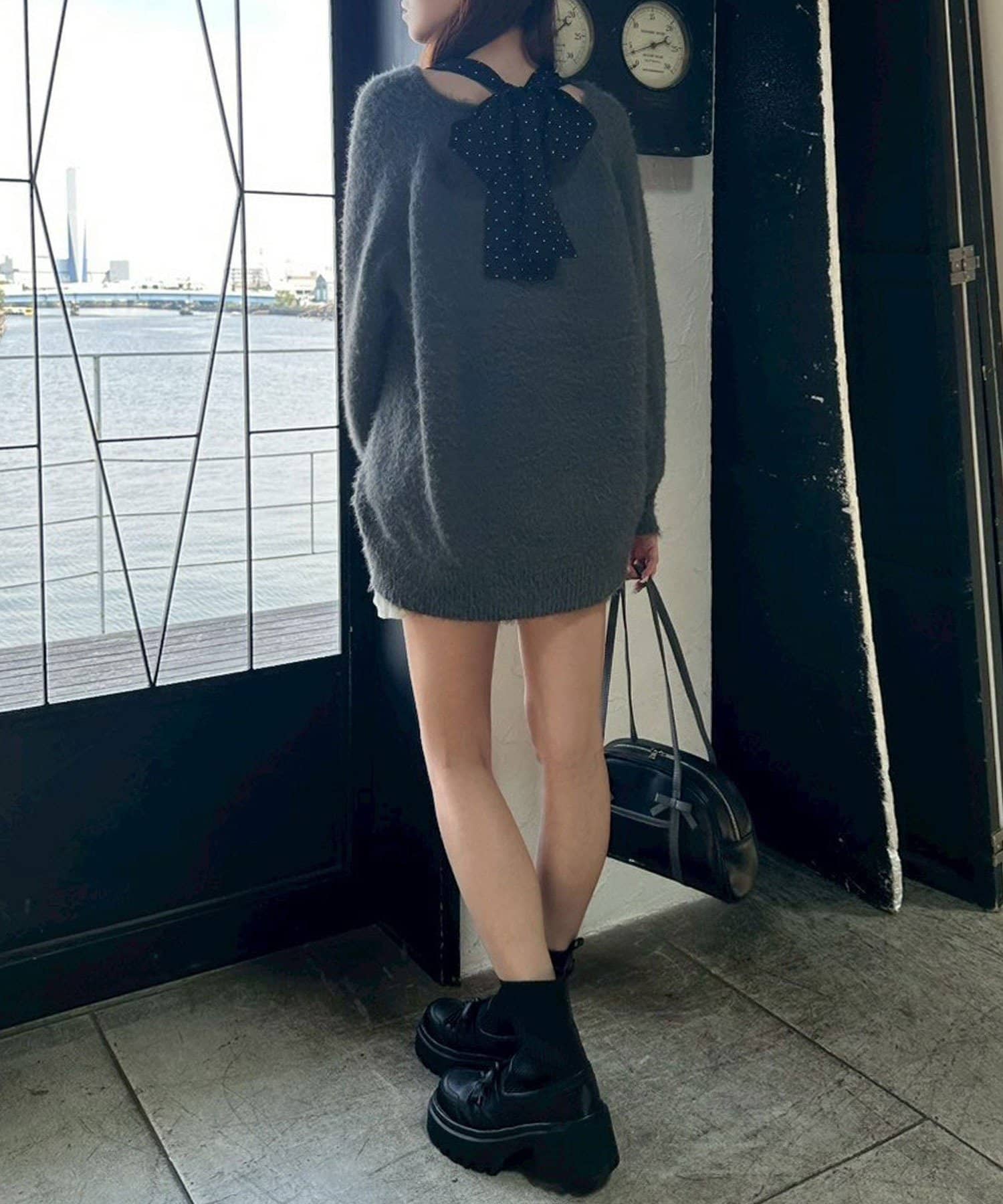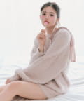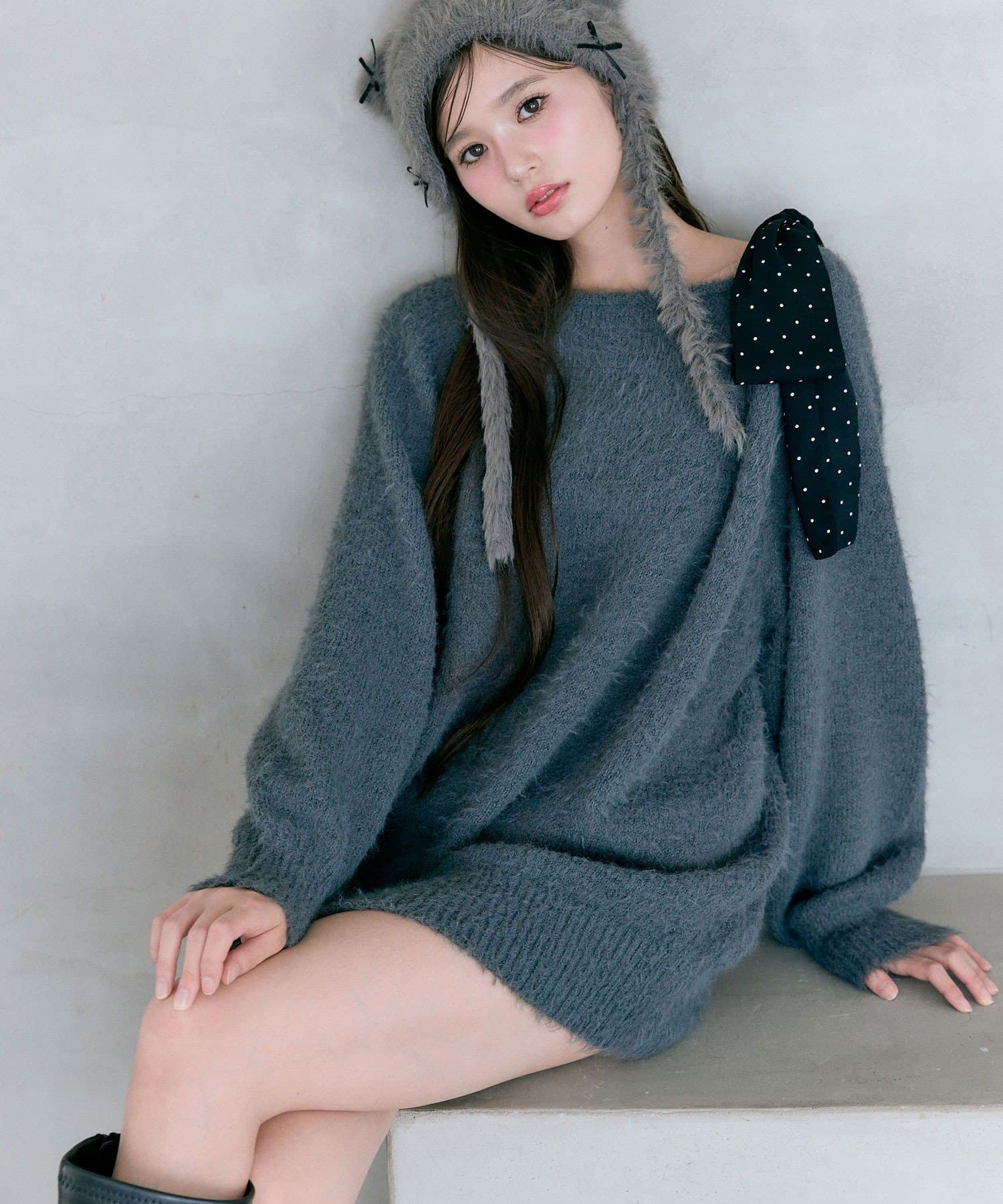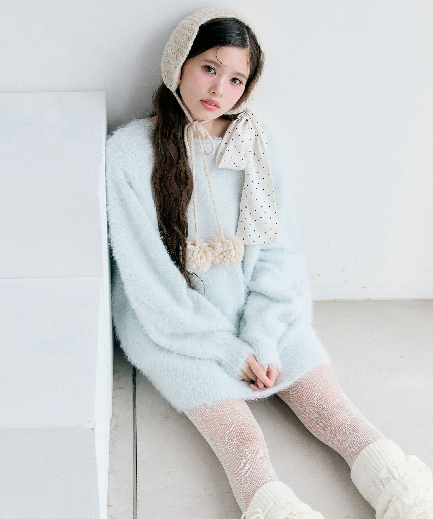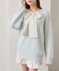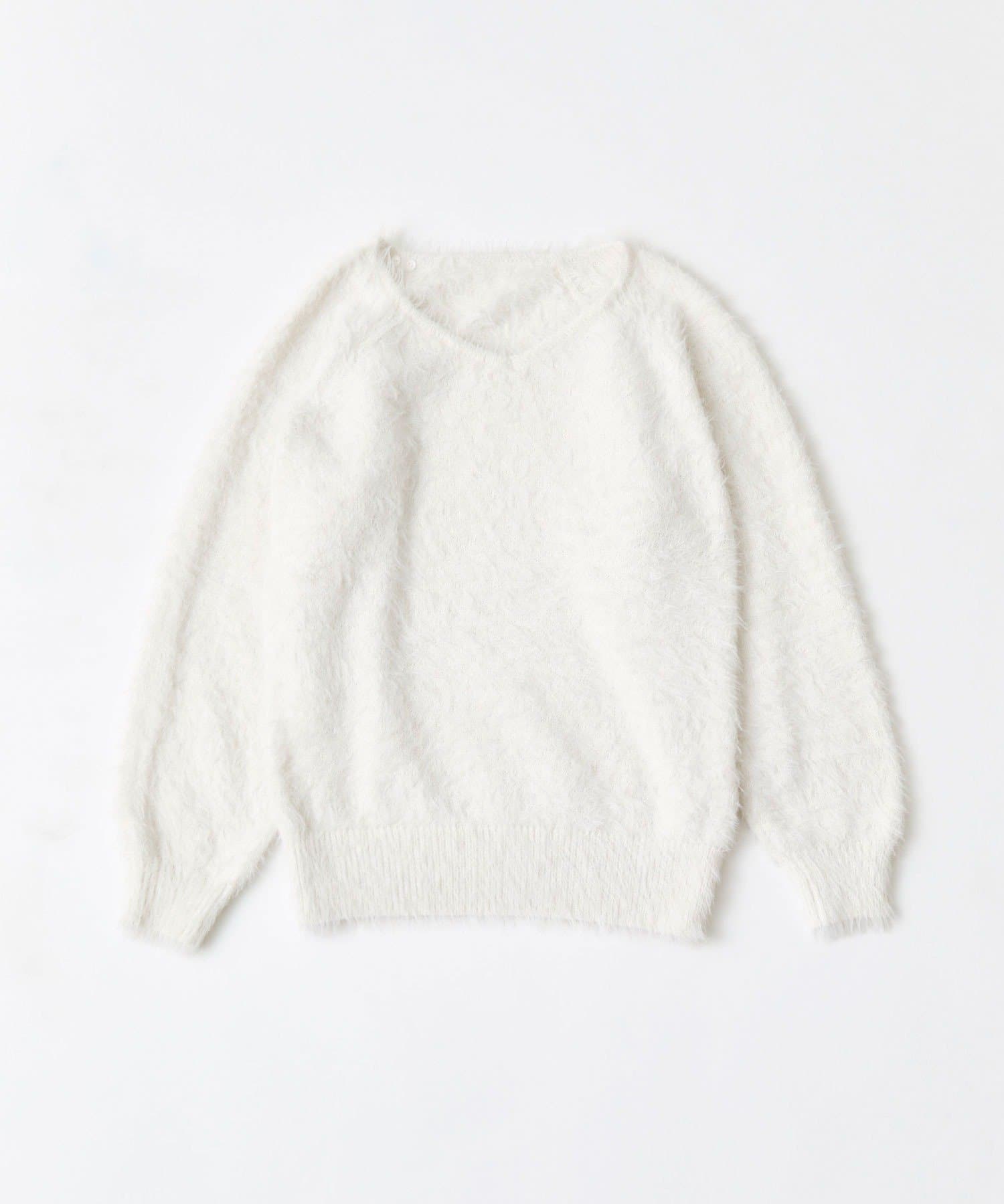 ・ふわふわシャギーニットに、大きなリボンをあしらったガーリーデザイン。