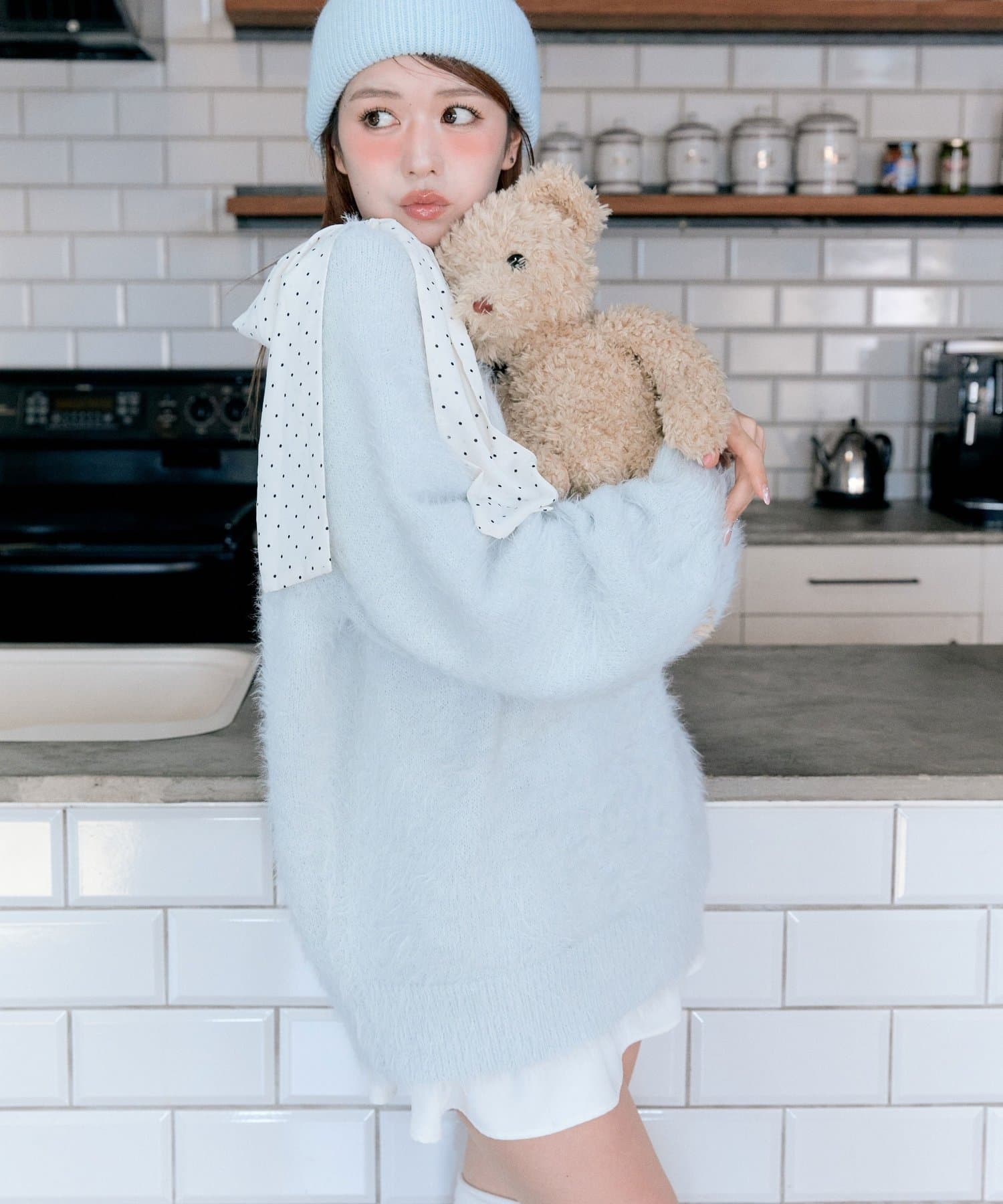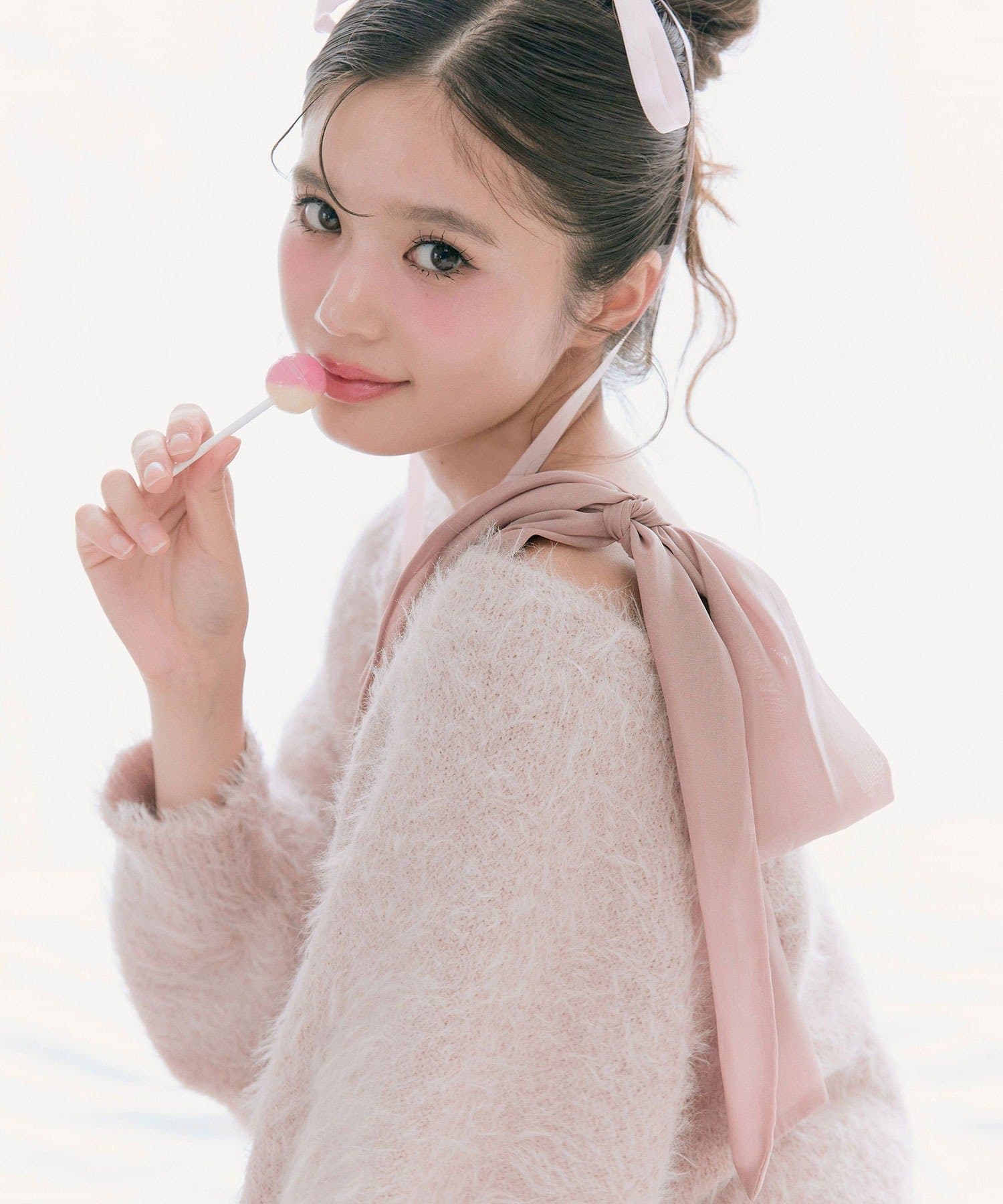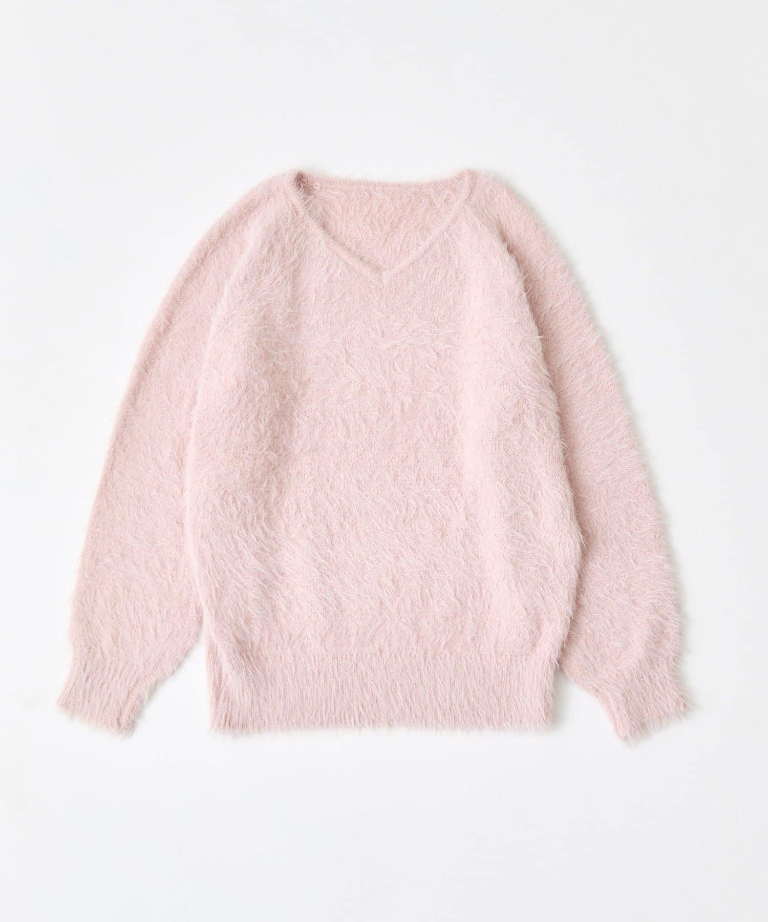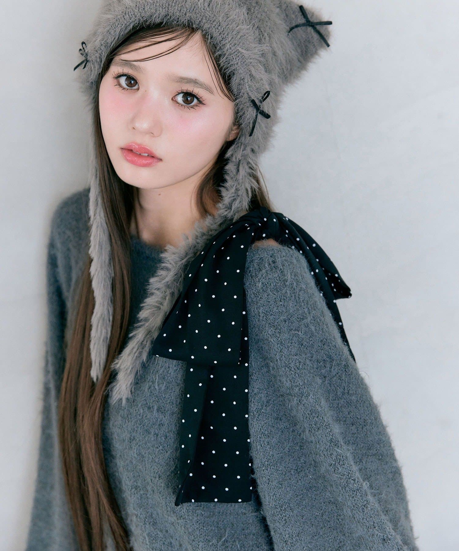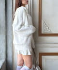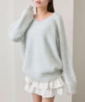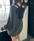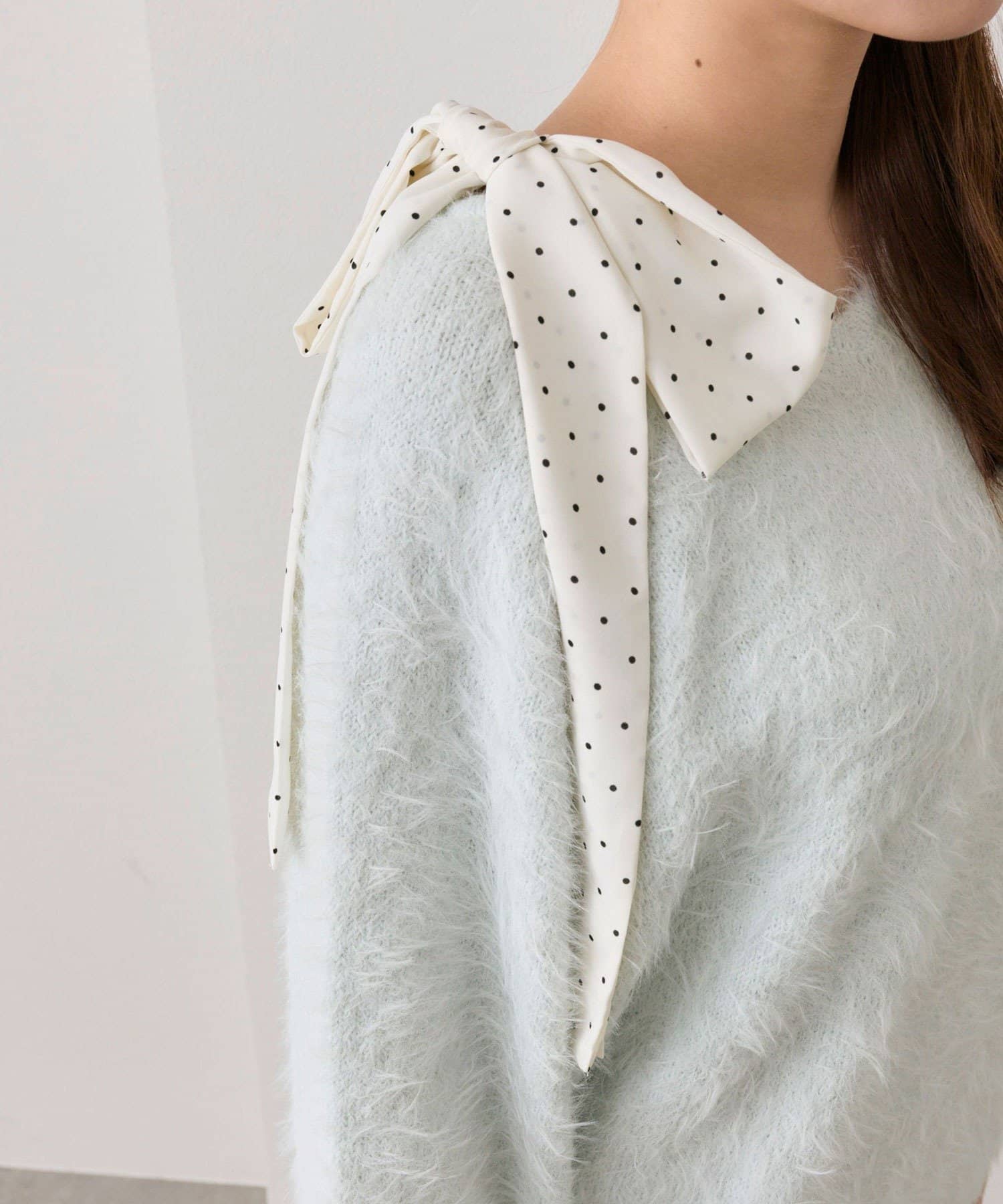 ・ふわふわシャギーニットに、大きなリボンをあしらったガーリーデザイン。