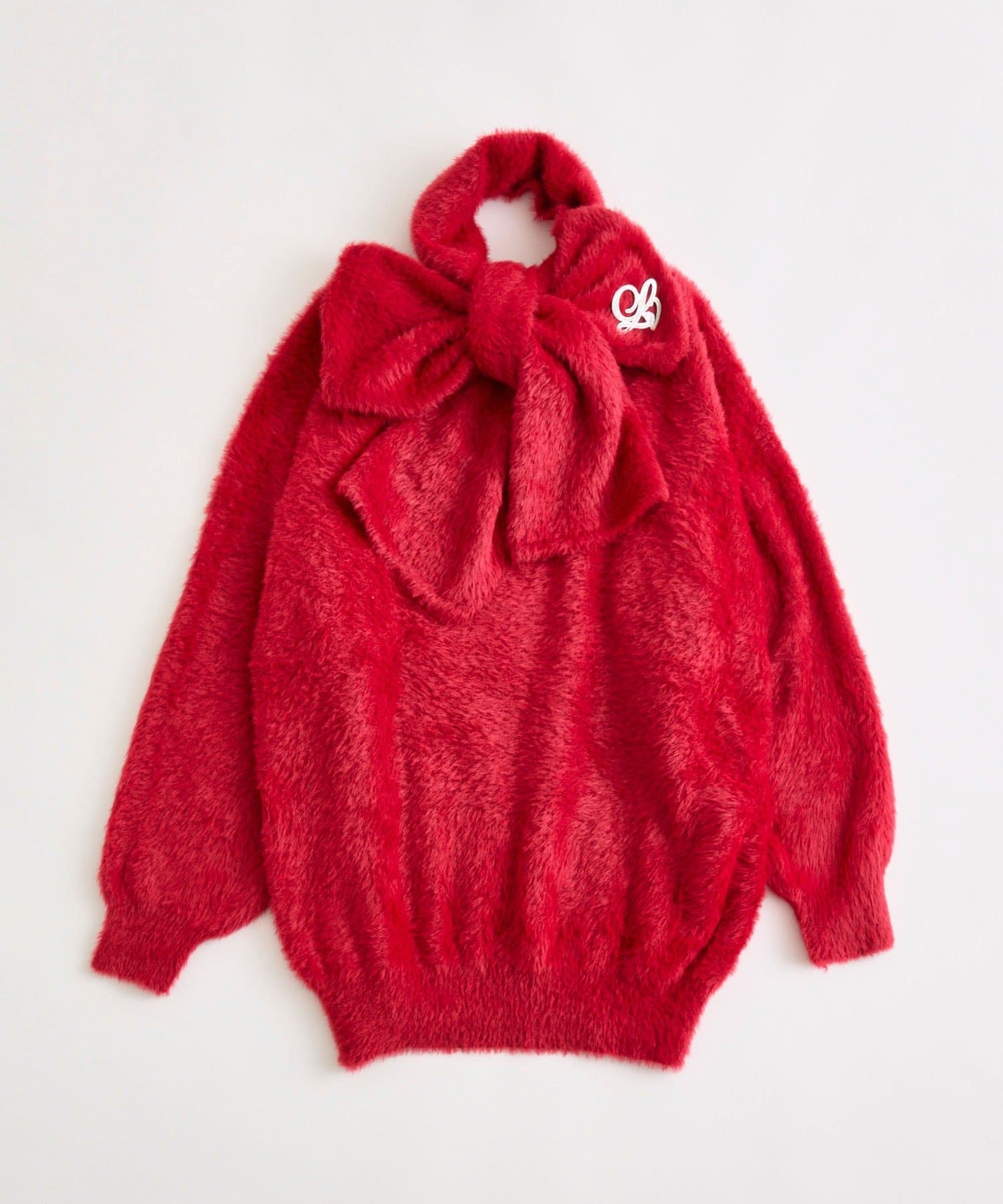 ・オリーブのロゴブローチが付いたマフラーとニットワンピースのセット。
