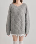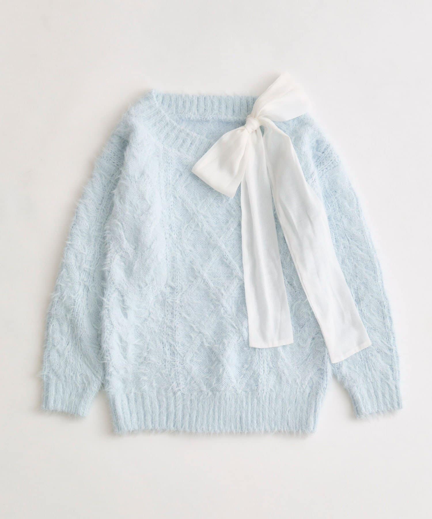 ・シーズンムード高まるケーブルニットに、大きなリボンをあしらったガーリーデザイン。
