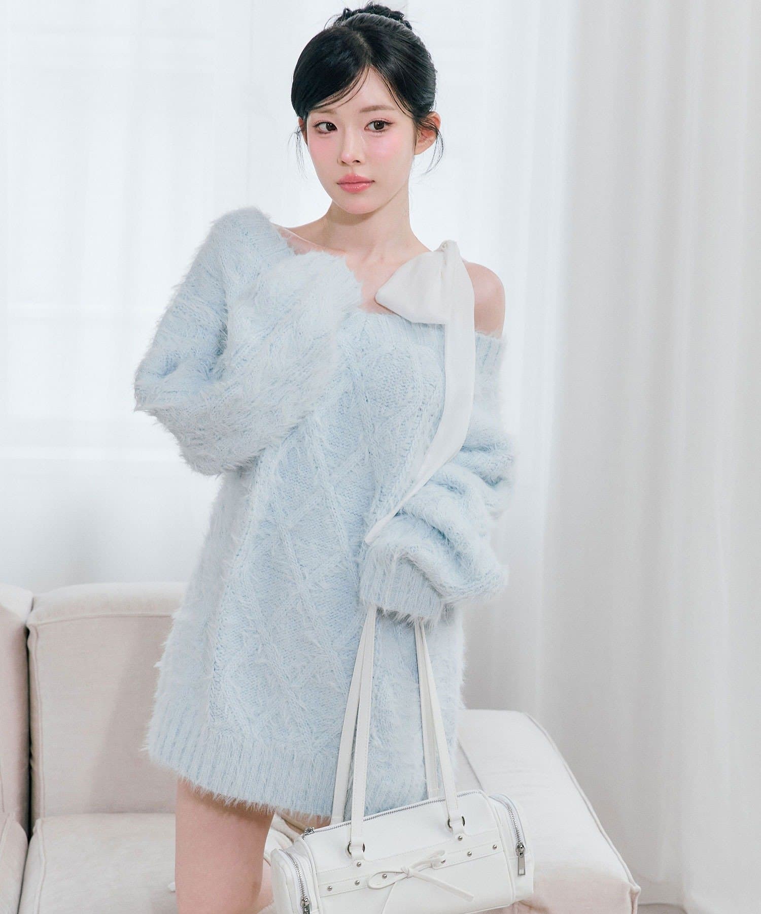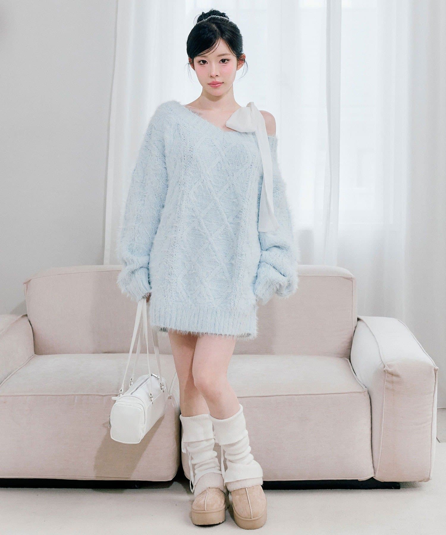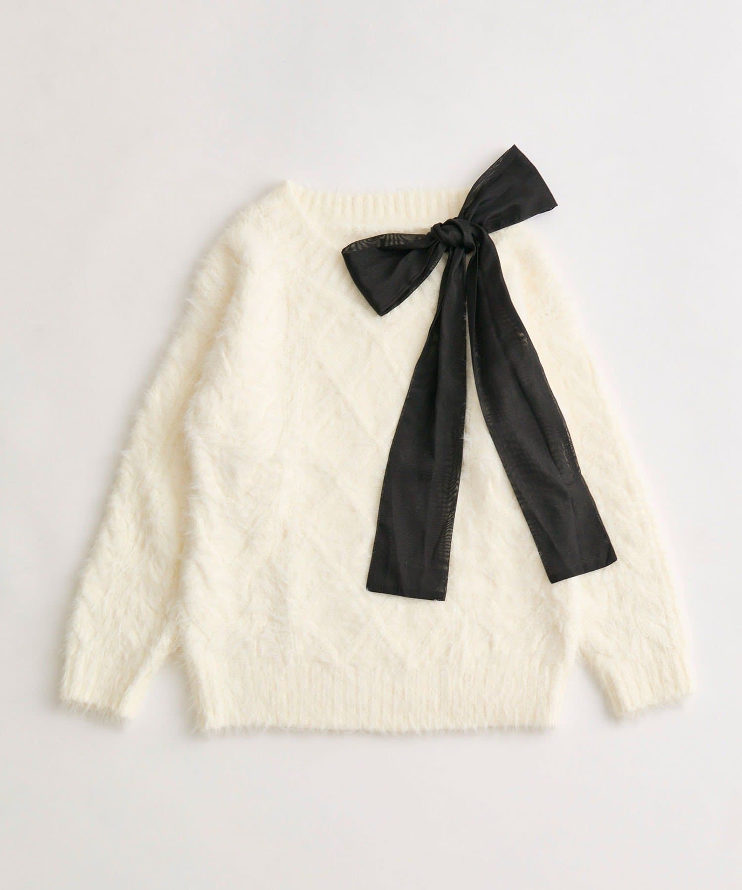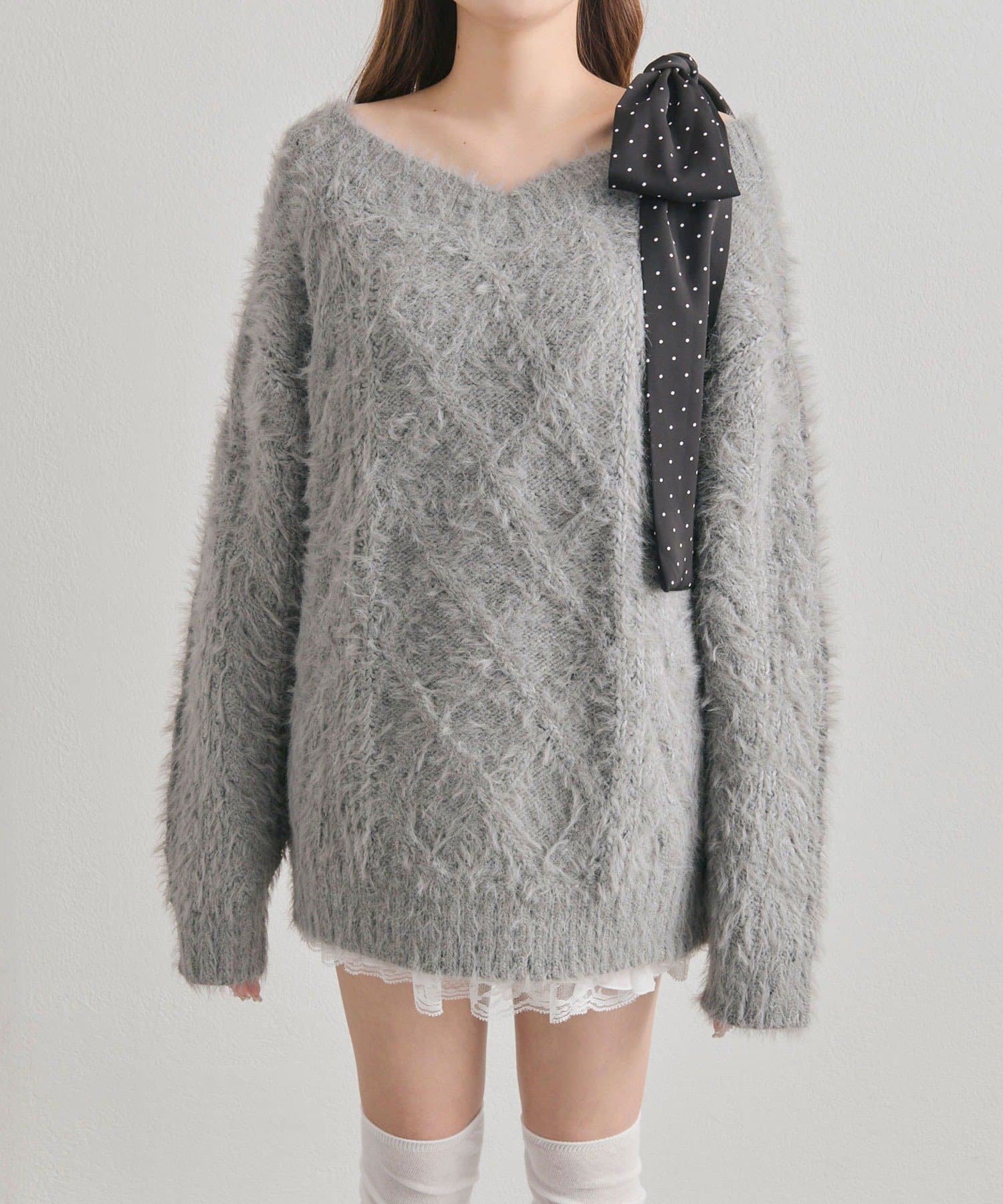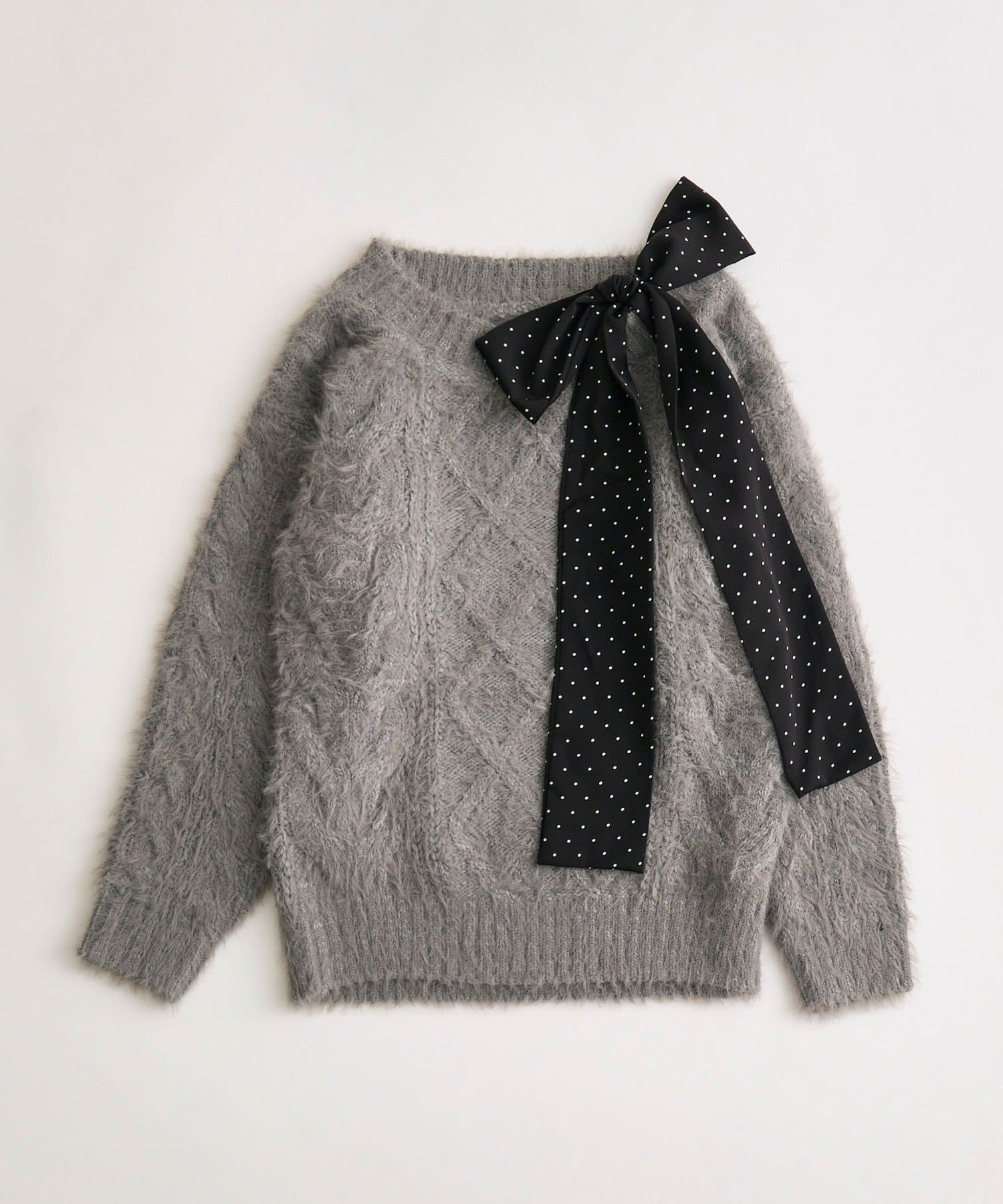 ・シーズンムード高まるケーブルニットに、大きなリボンをあしらったガーリーデザイン。