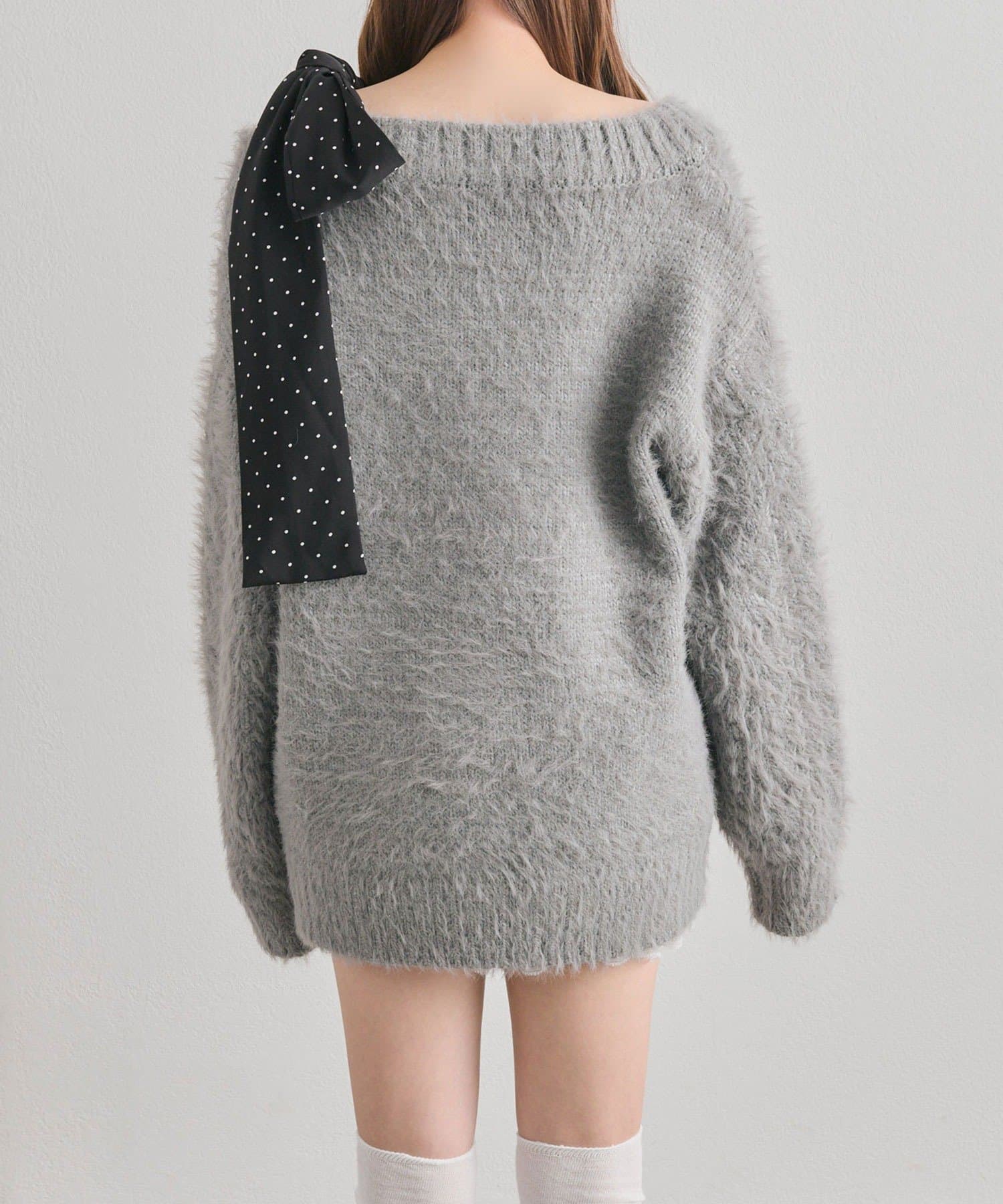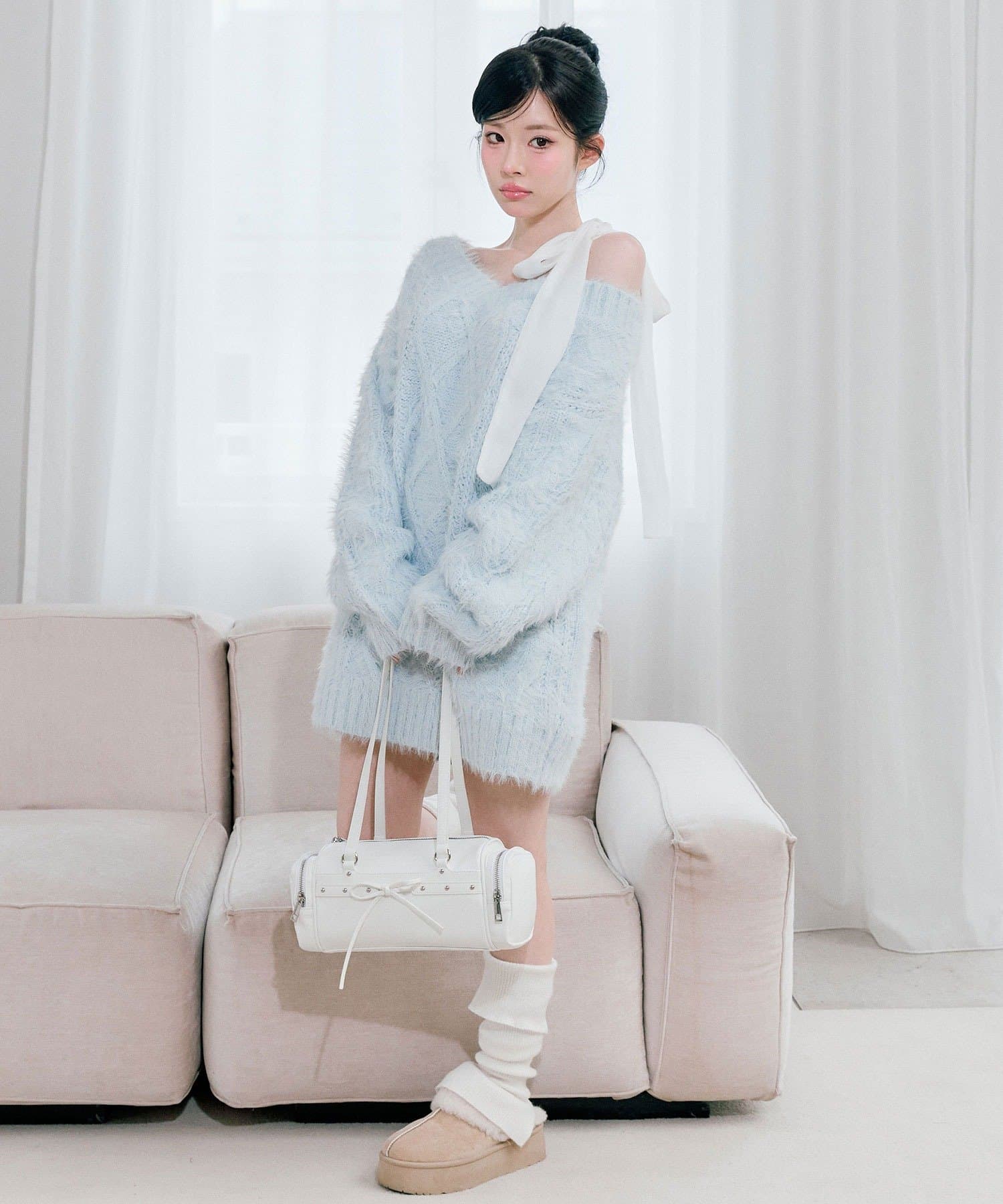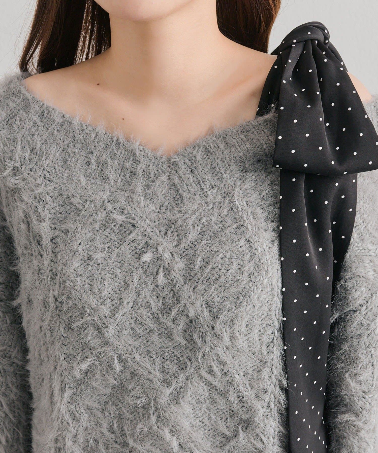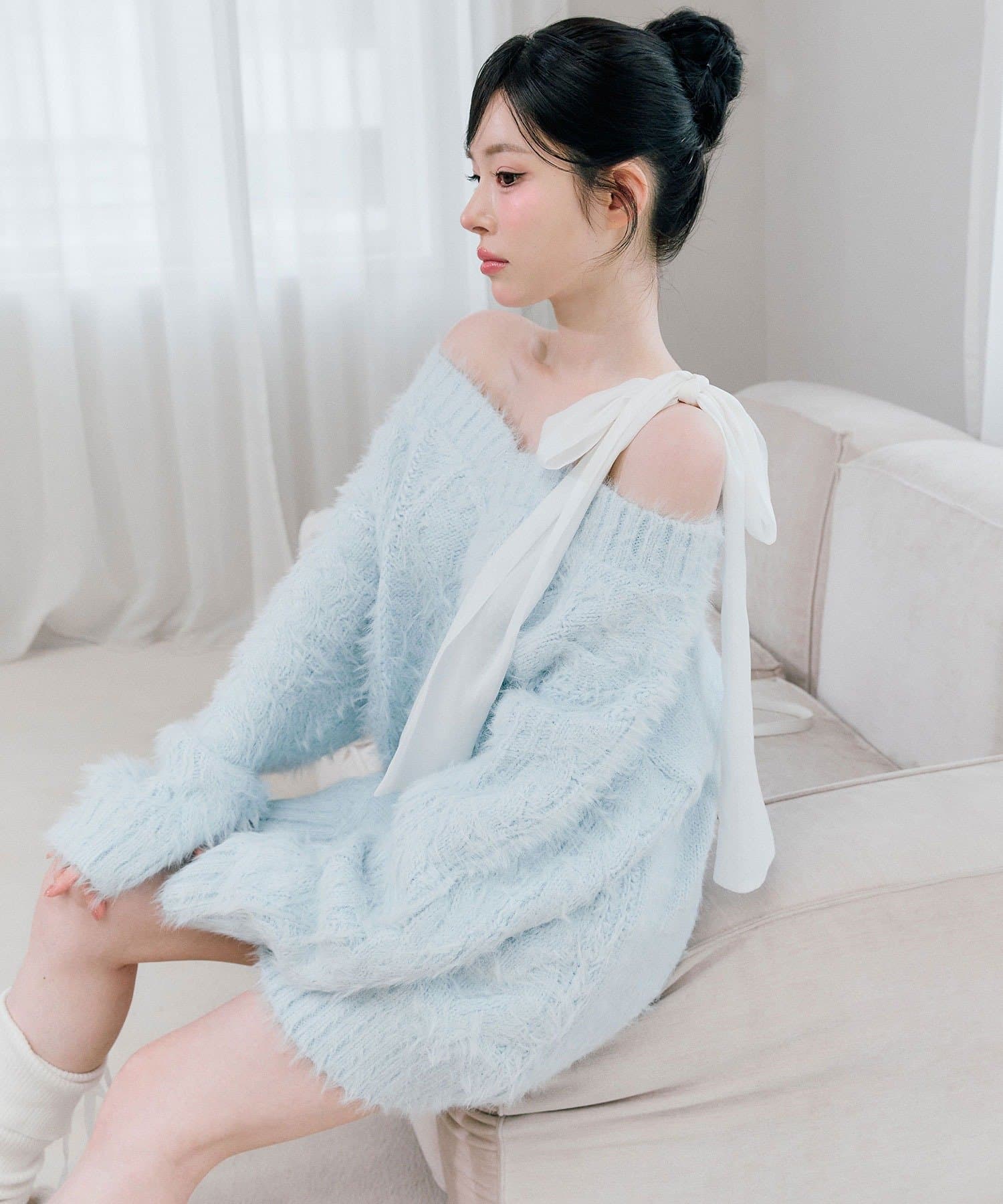 ・シーズンムード高まるケーブルニットに、大きなリボンをあしらったガーリーデザイン。