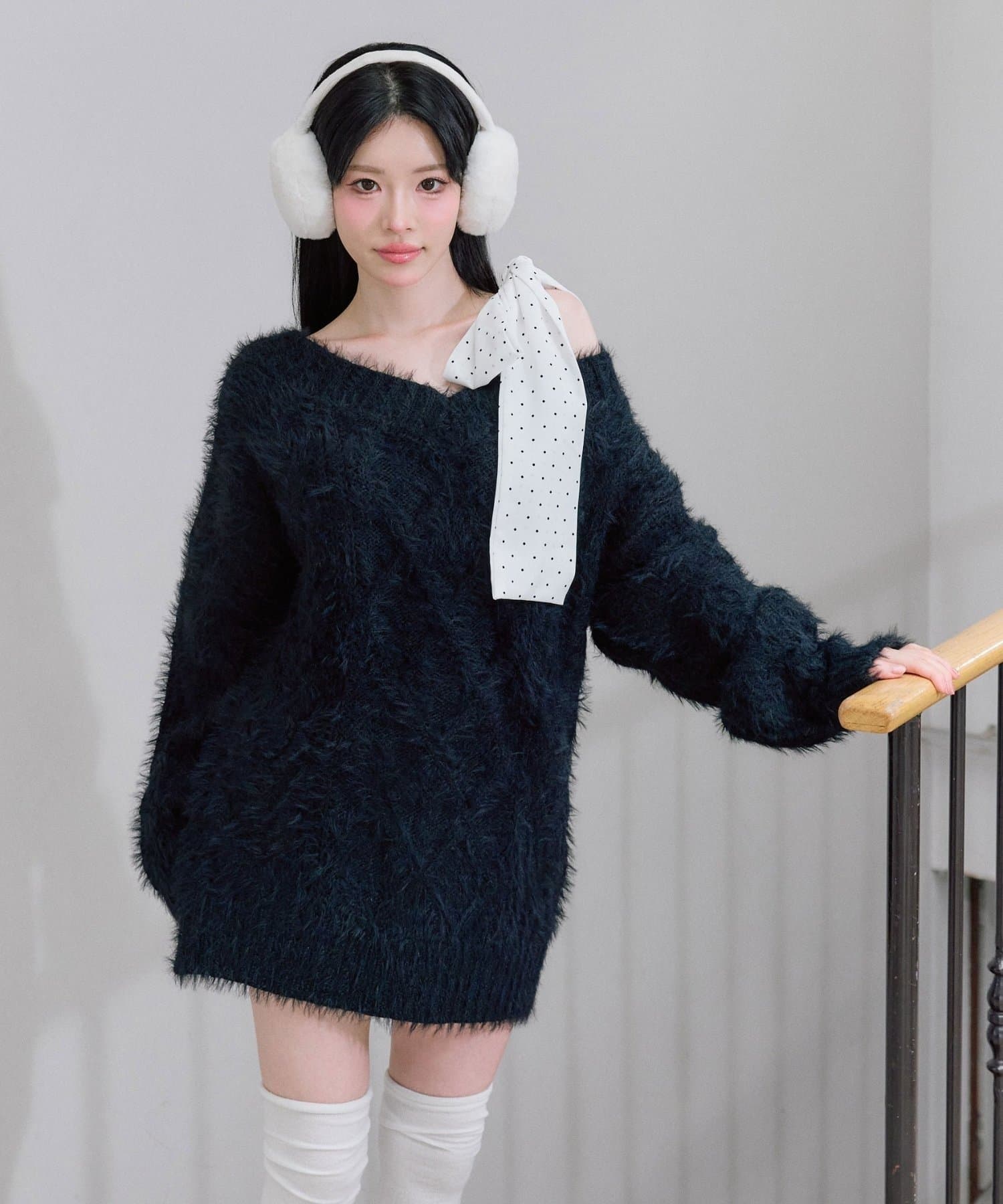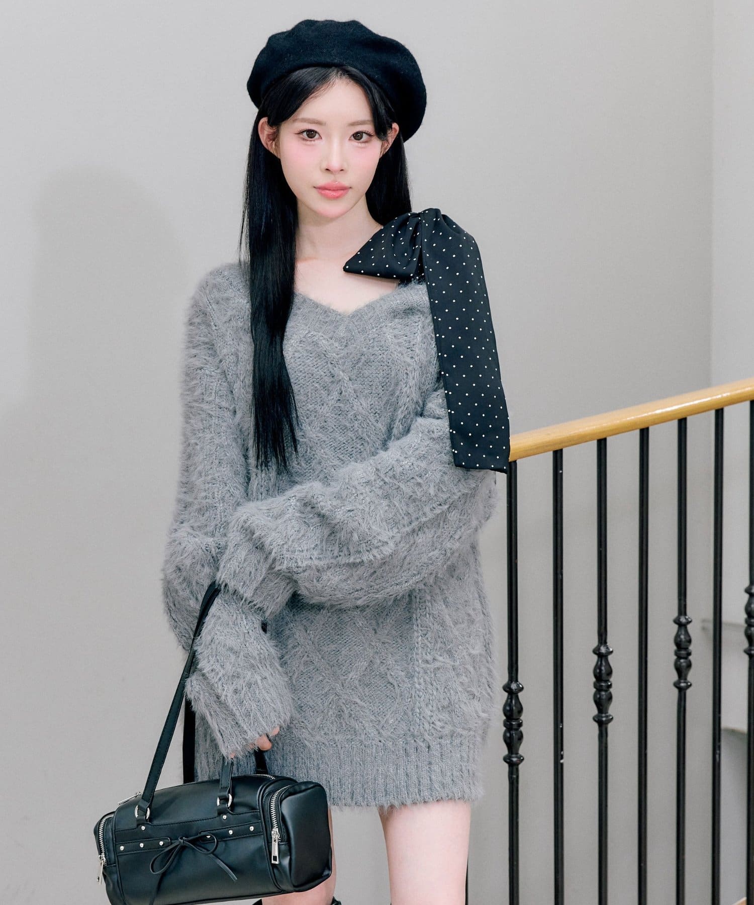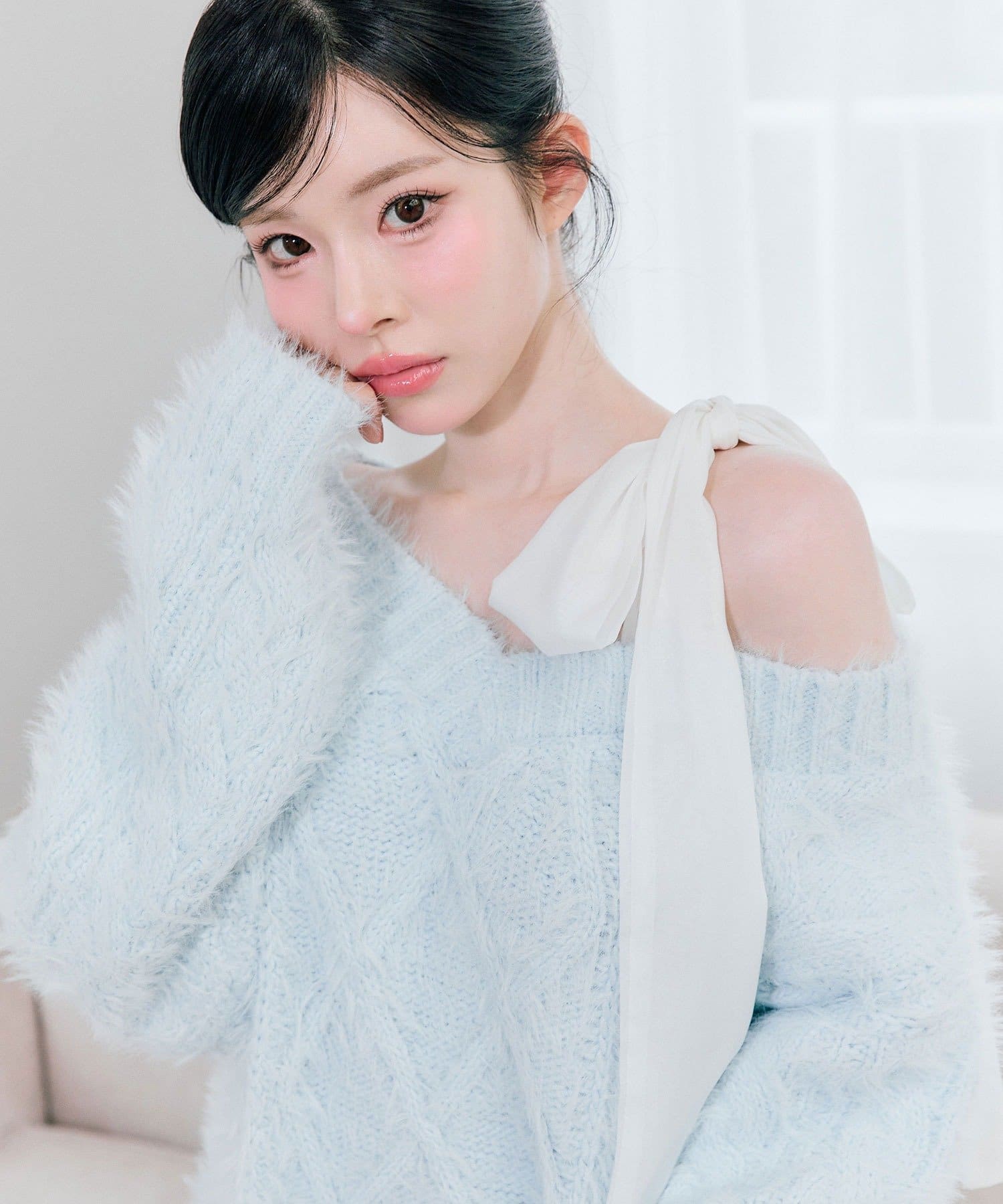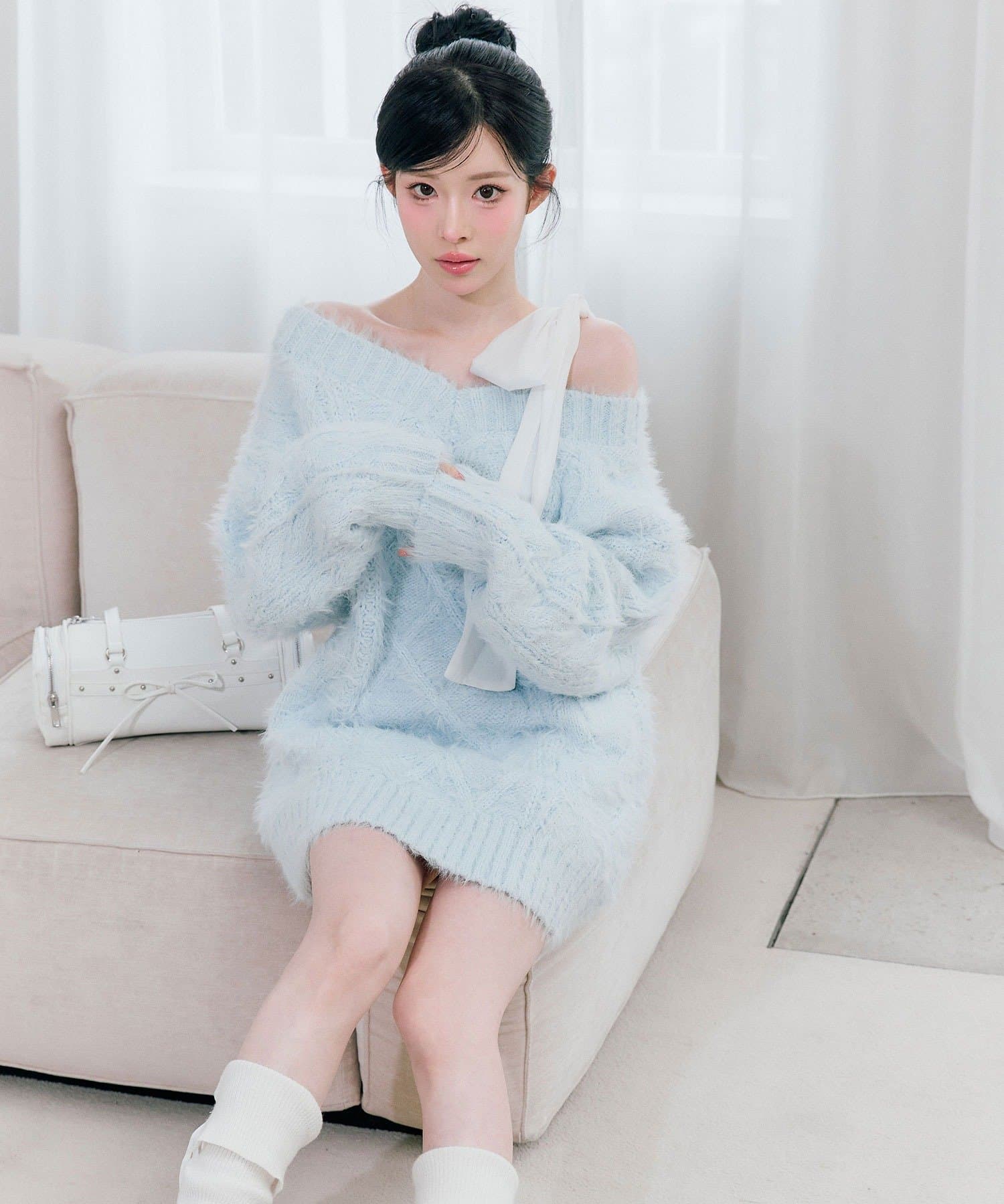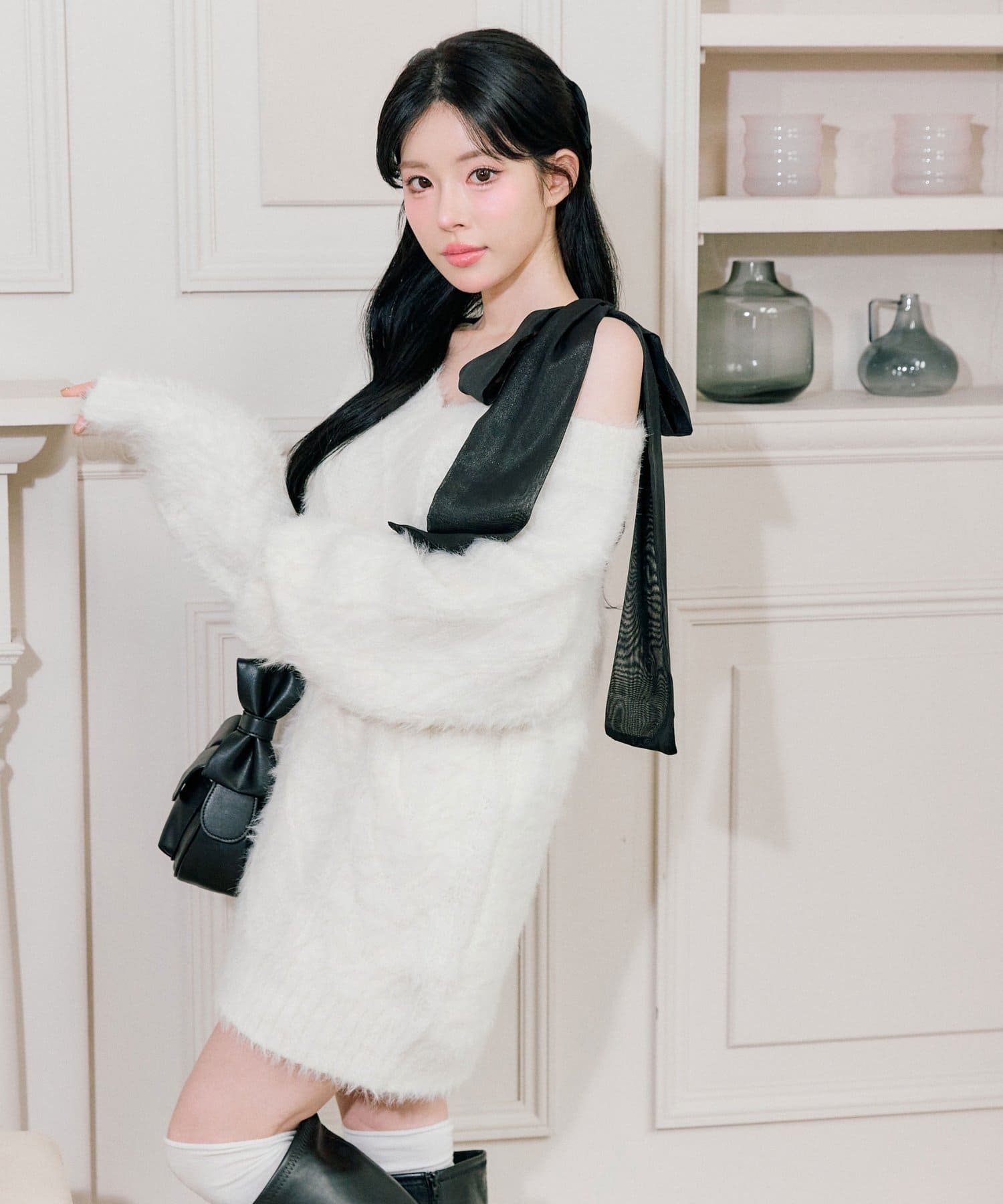 ・シーズンムード高まるケーブルニットに、大きなリボンをあしらったガーリーデザイン。