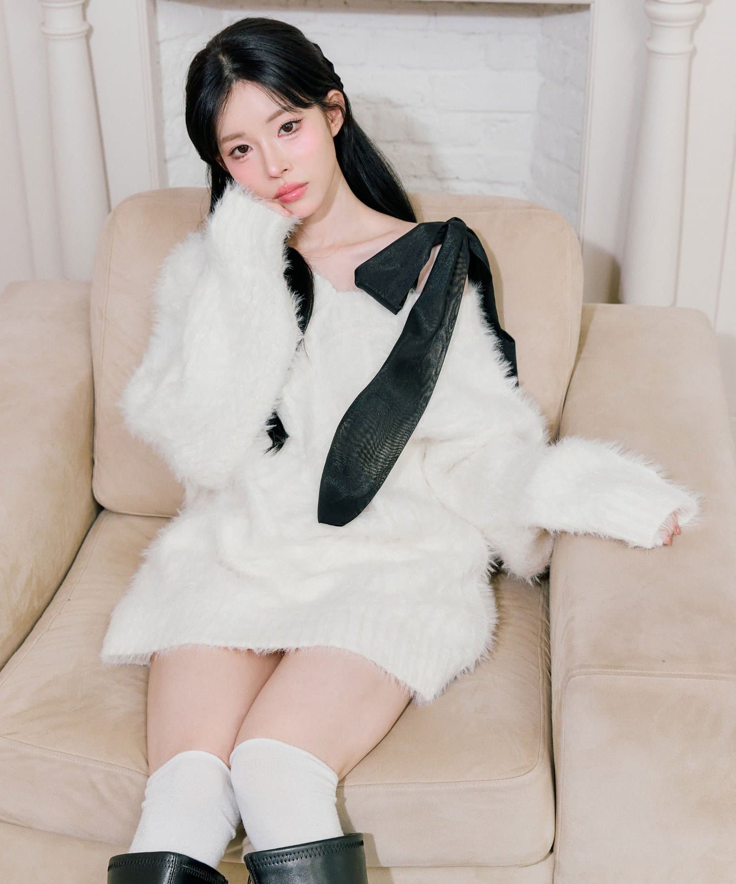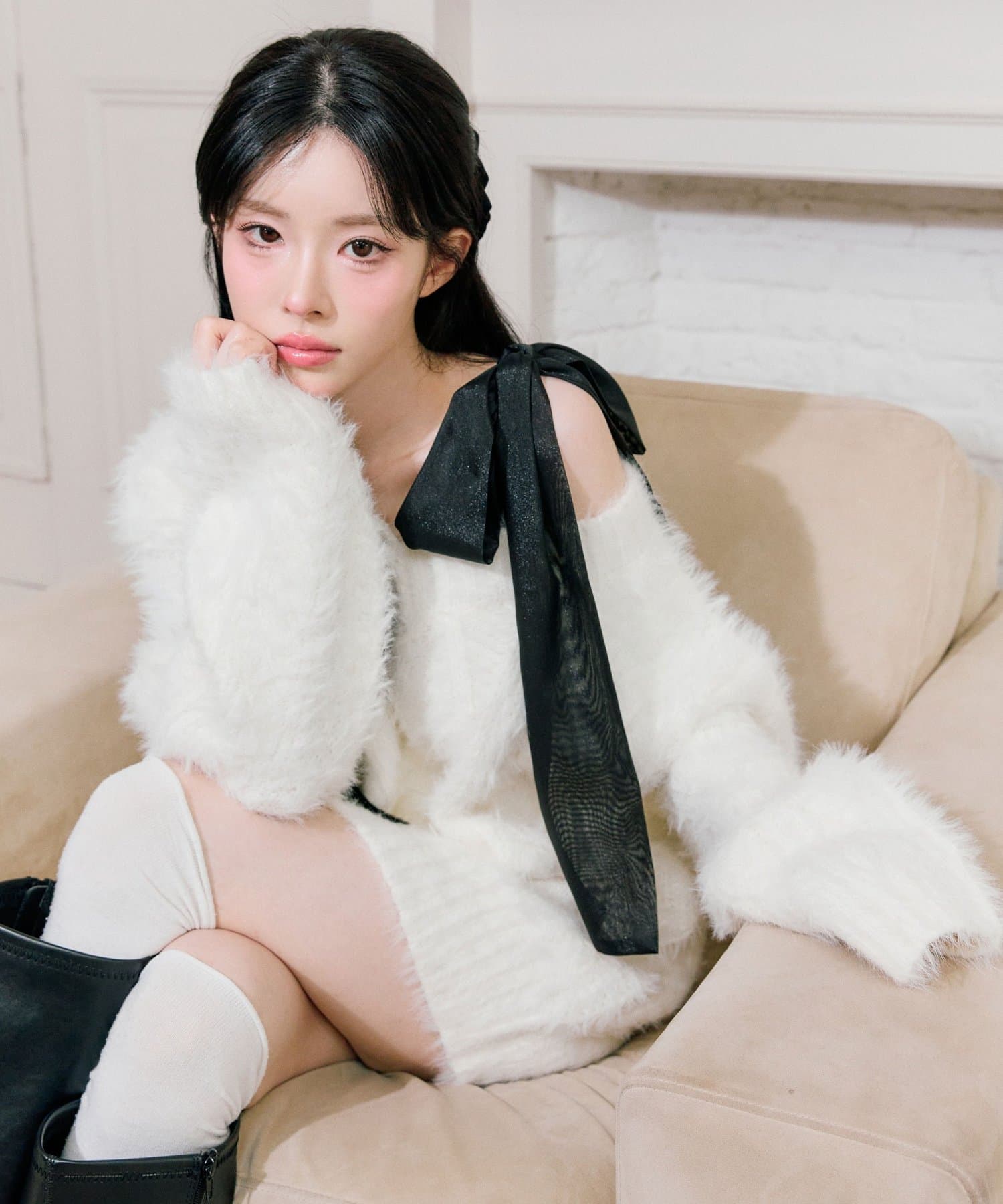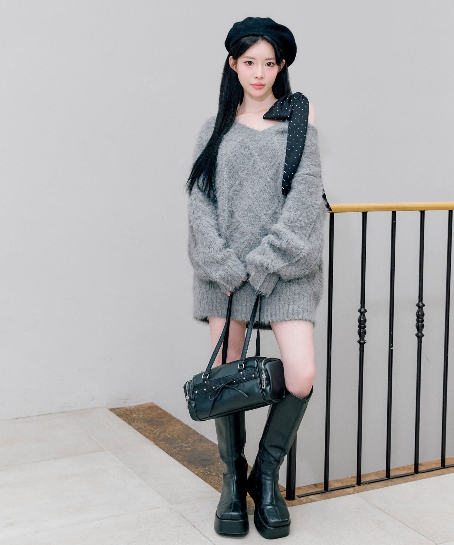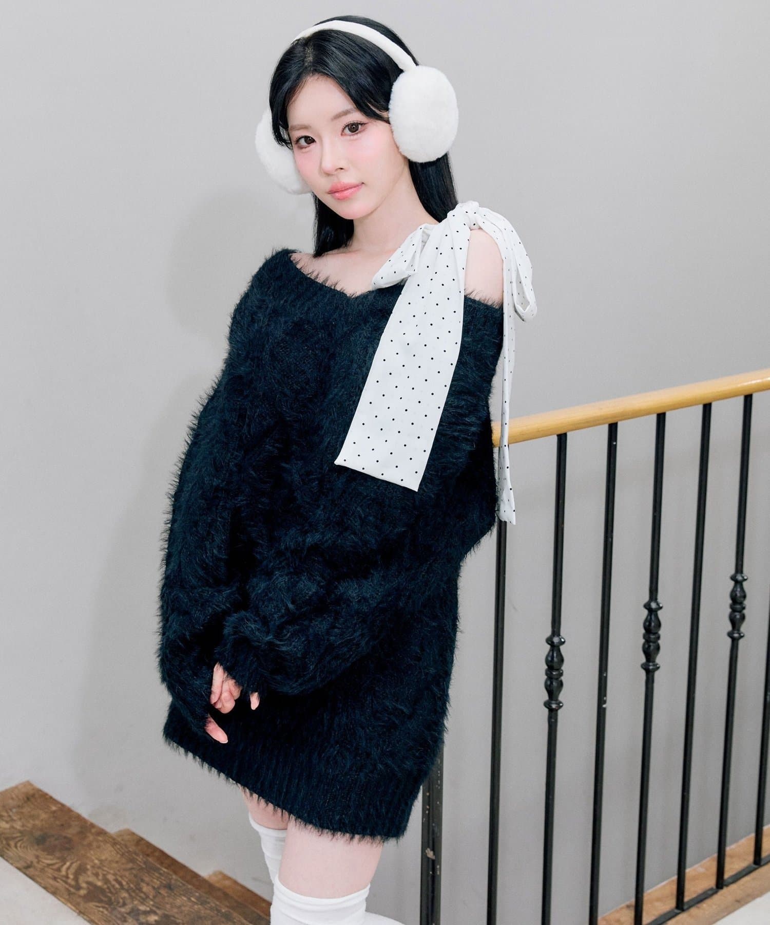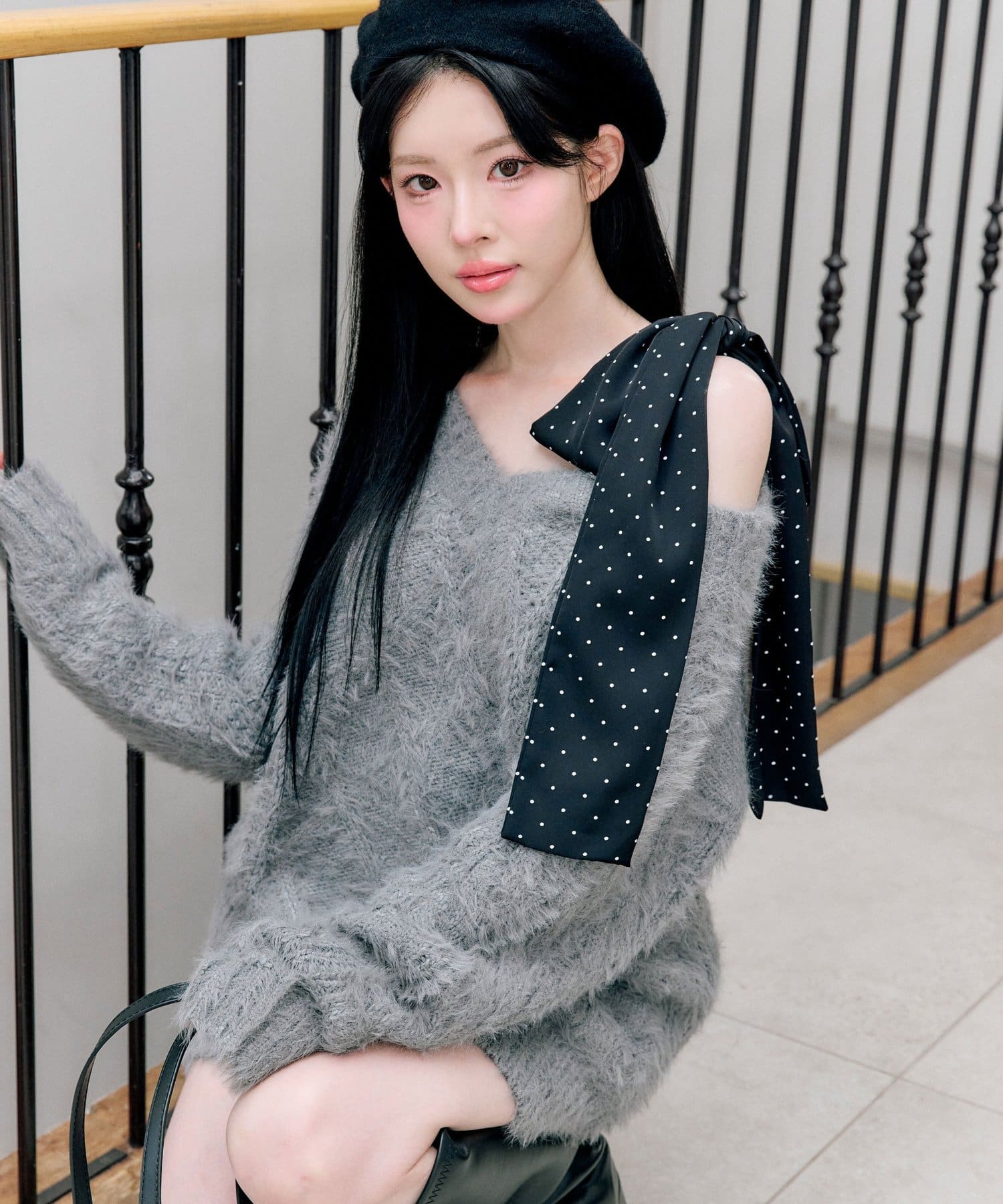 ・シーズンムード高まるケーブルニットに、大きなリボンをあしらったガーリーデザイン。