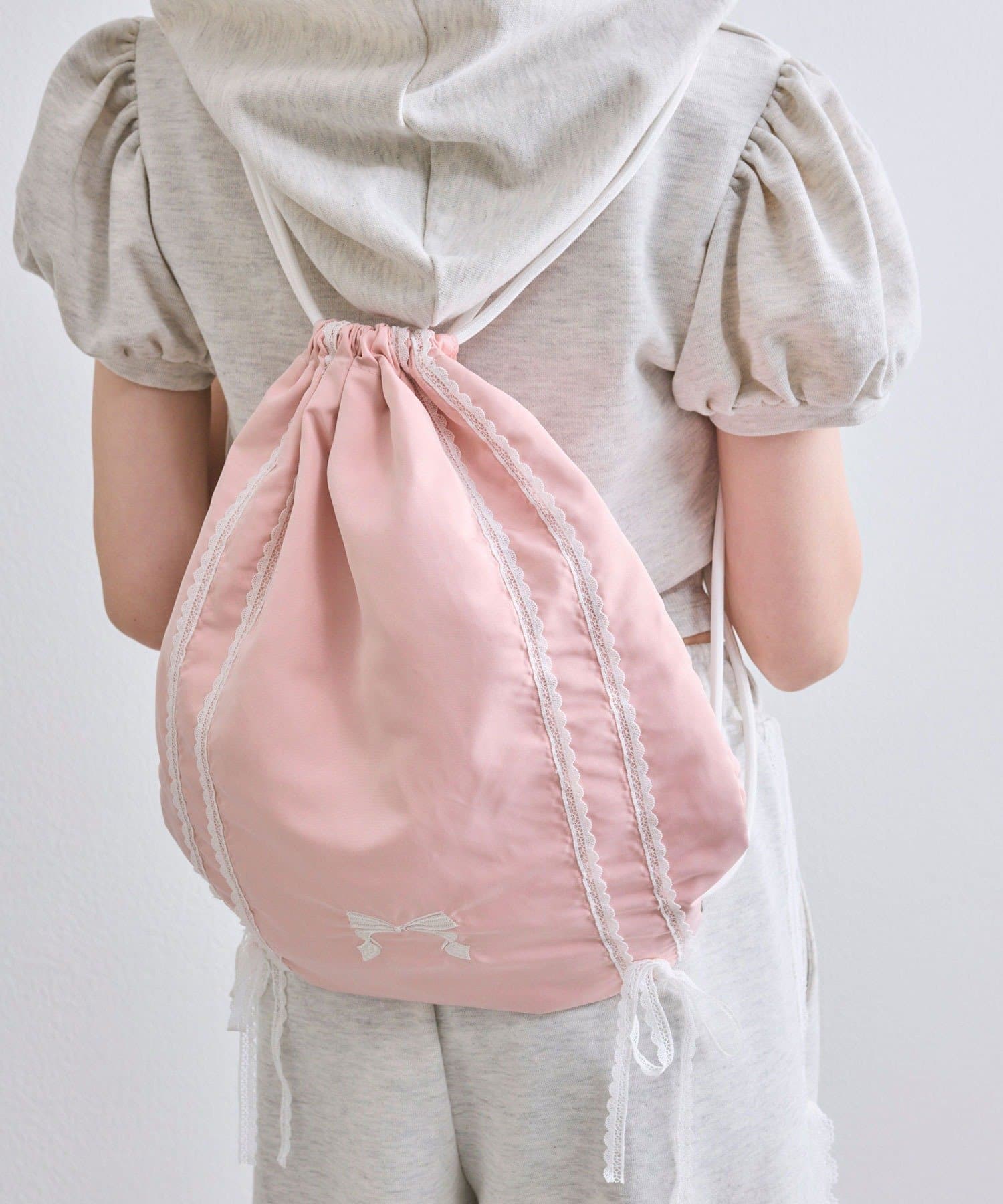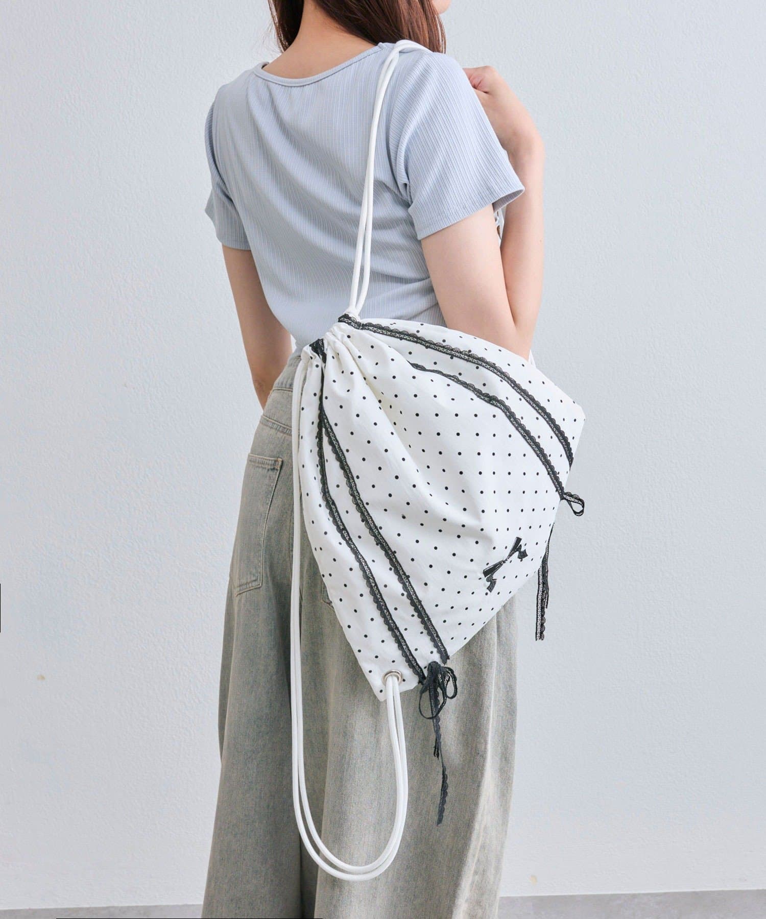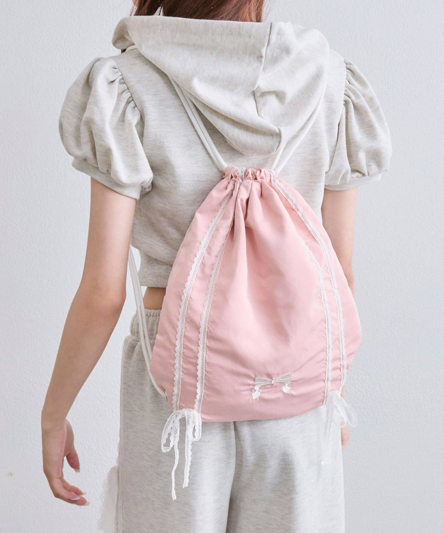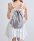 ・カジュアルな印象のナップサックですが、ガーリー要素もあるので幅広いコーデに合わせやすいです。