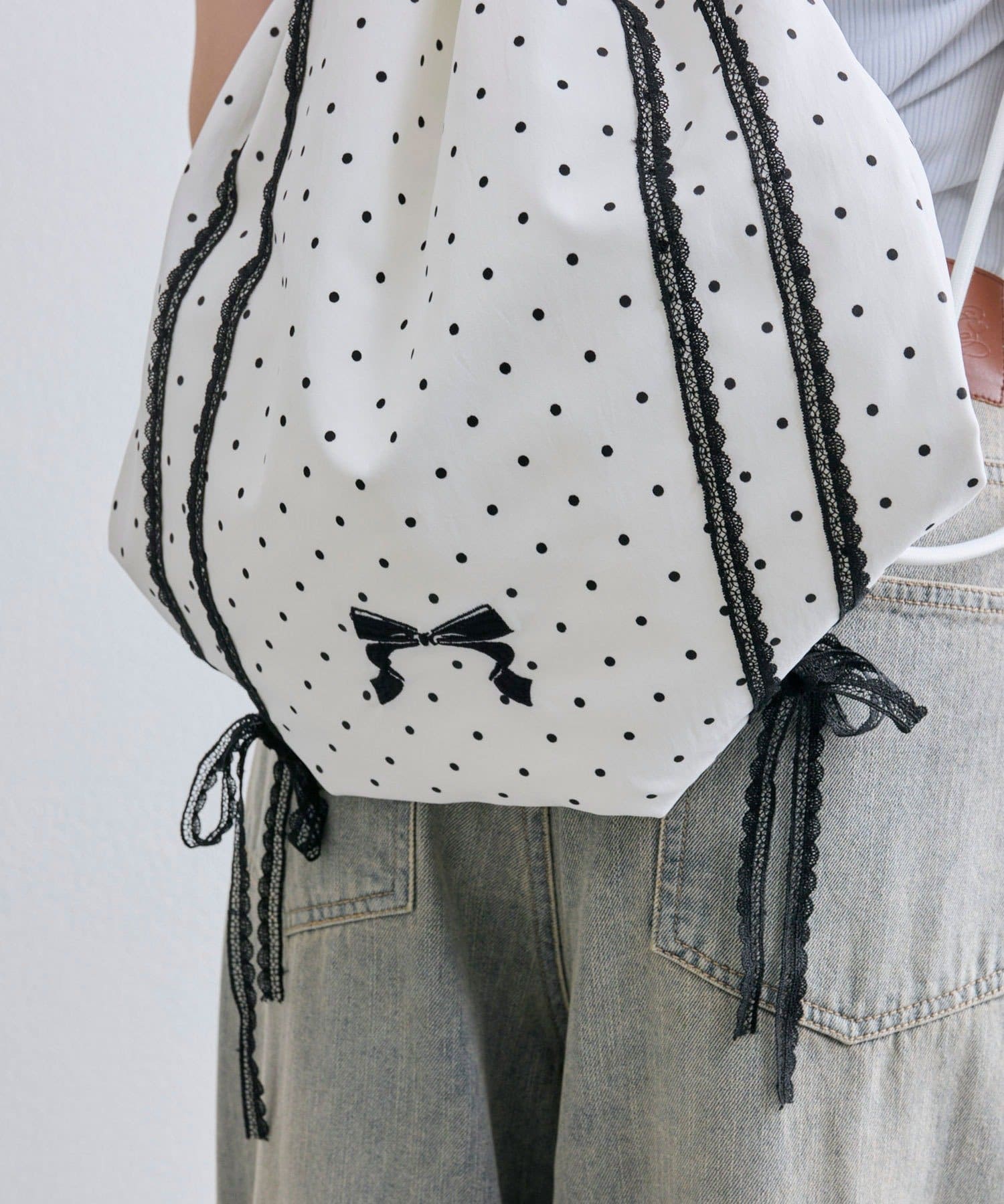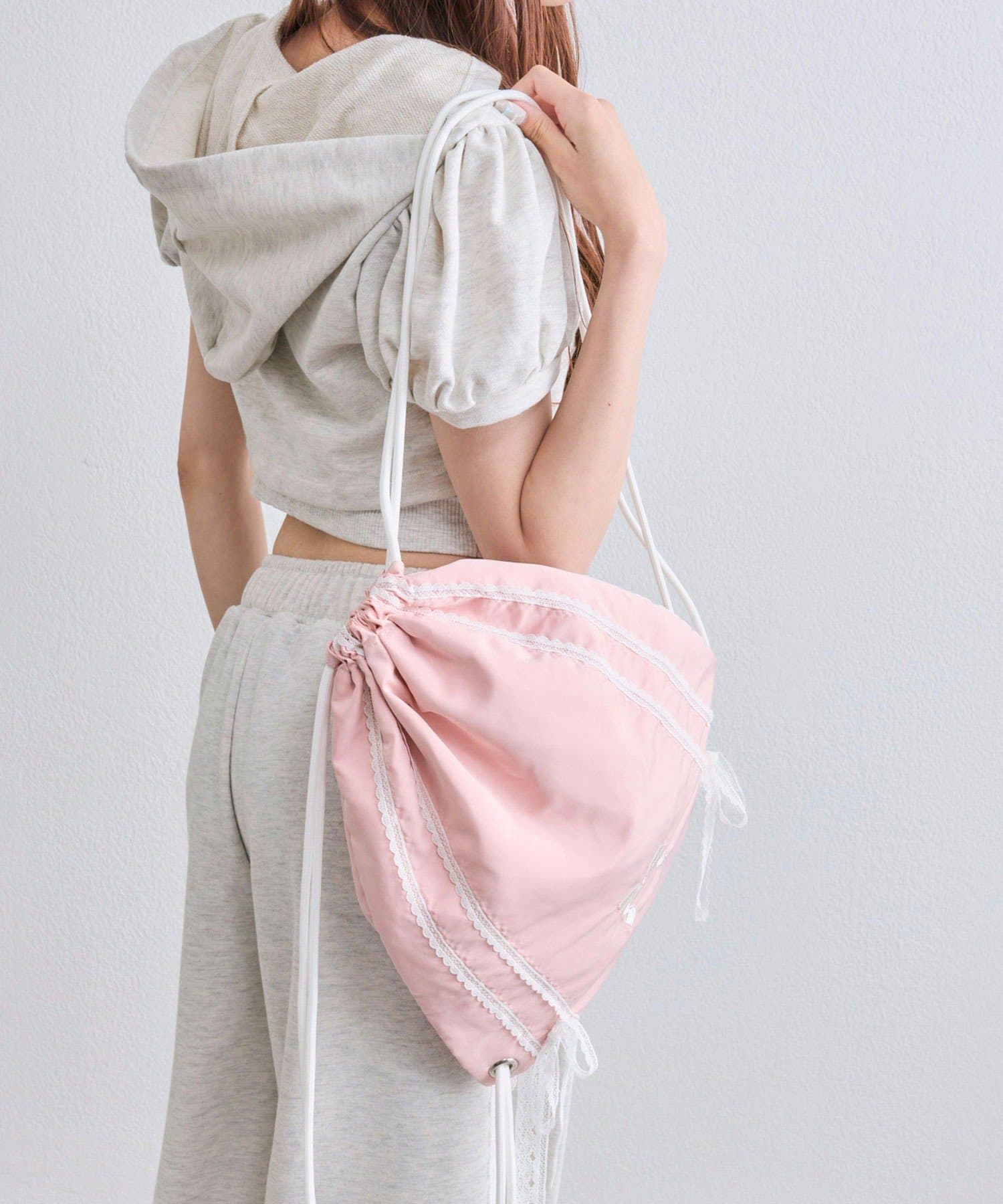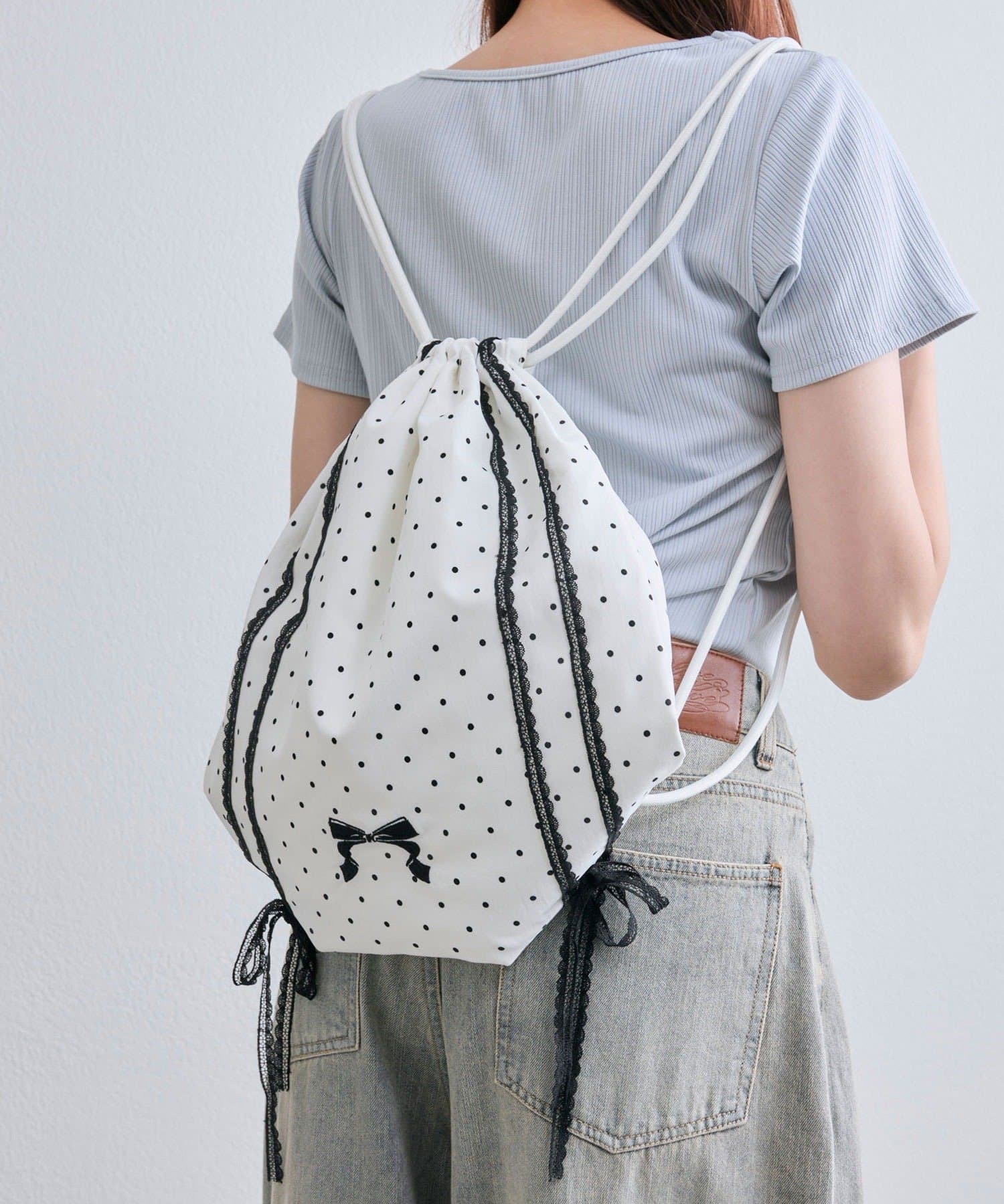 ・カジュアルな印象のナップサックですが、ガーリー要素もあるので幅広いコーデに合わせやすいです。