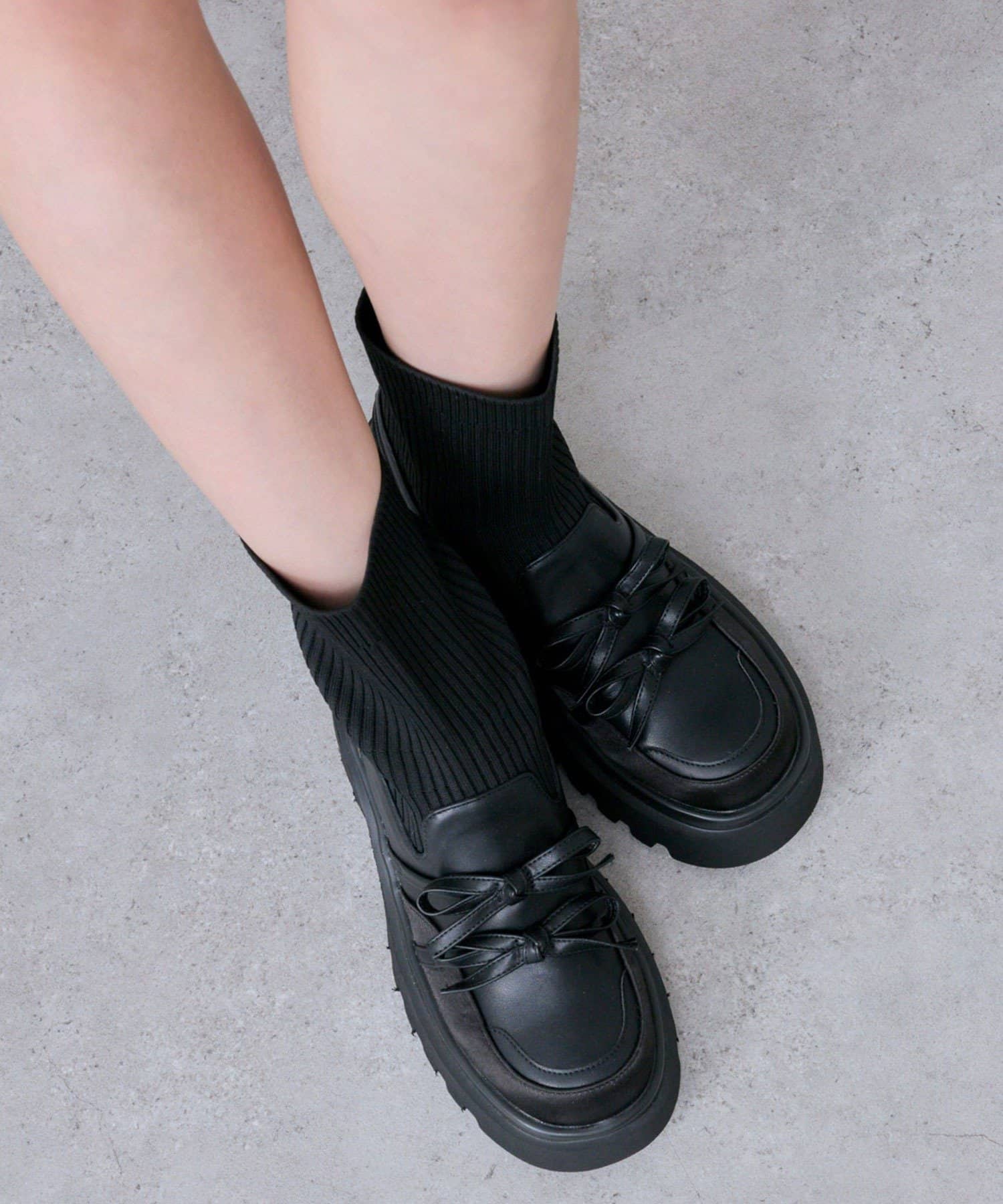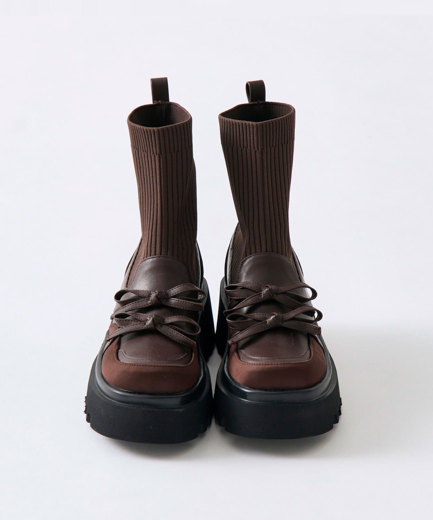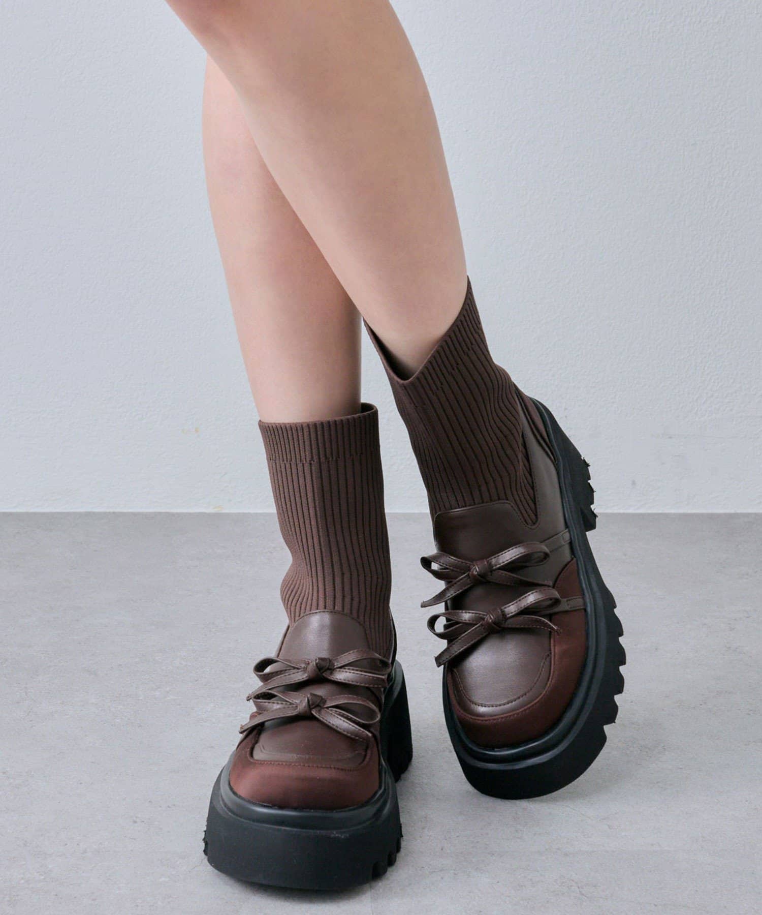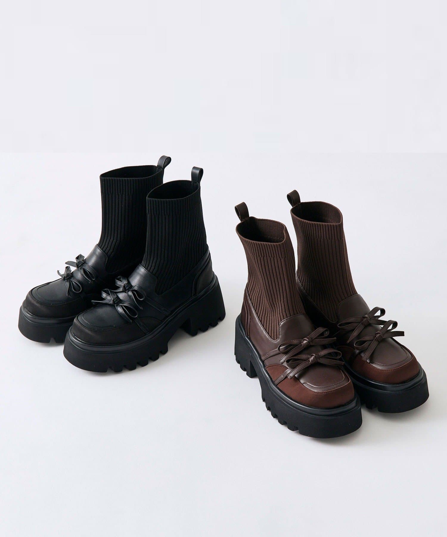 ・ソックス風リブニットとローファーのドッキングデザインのショートブーツ。