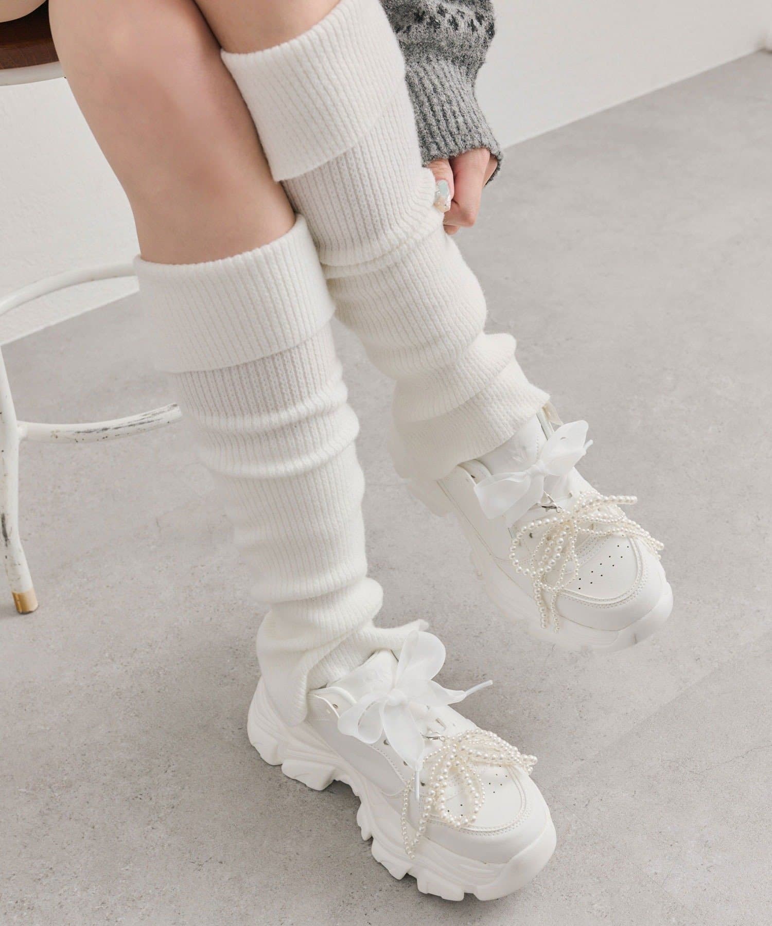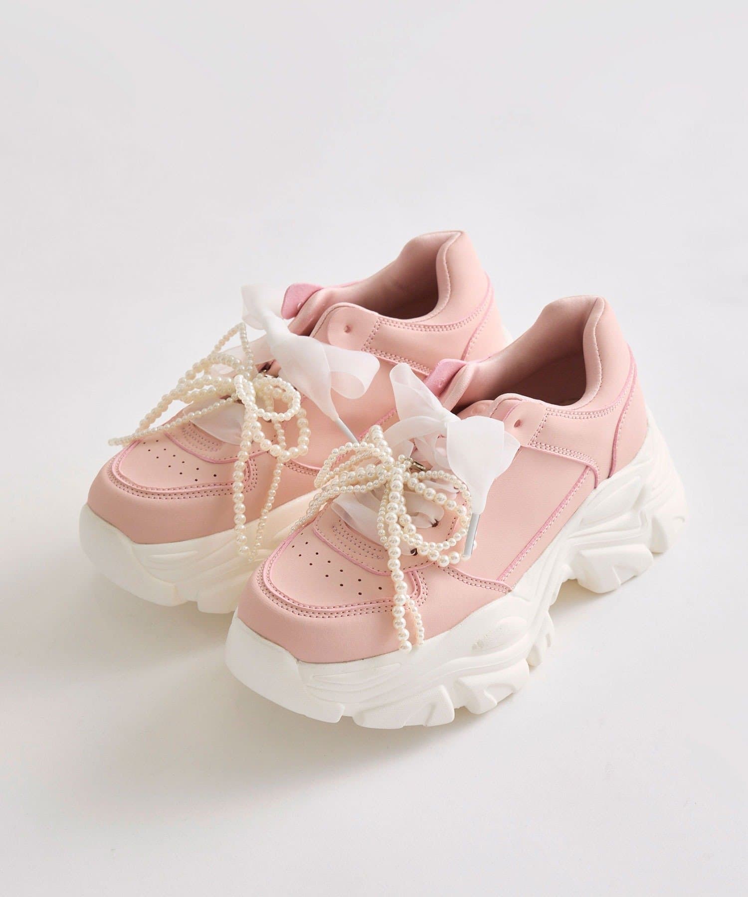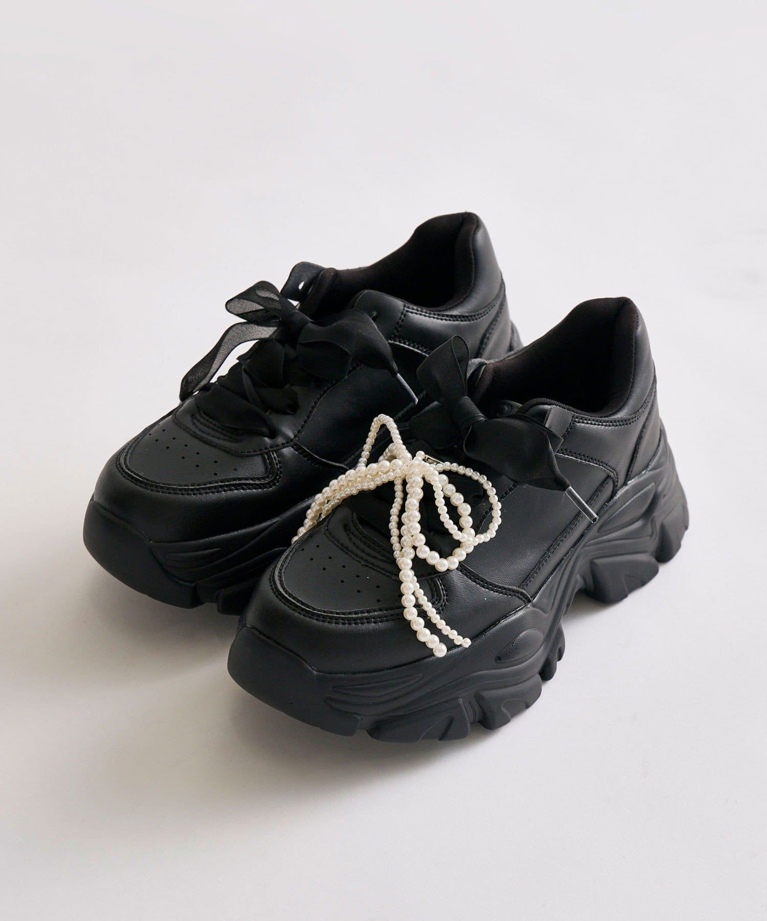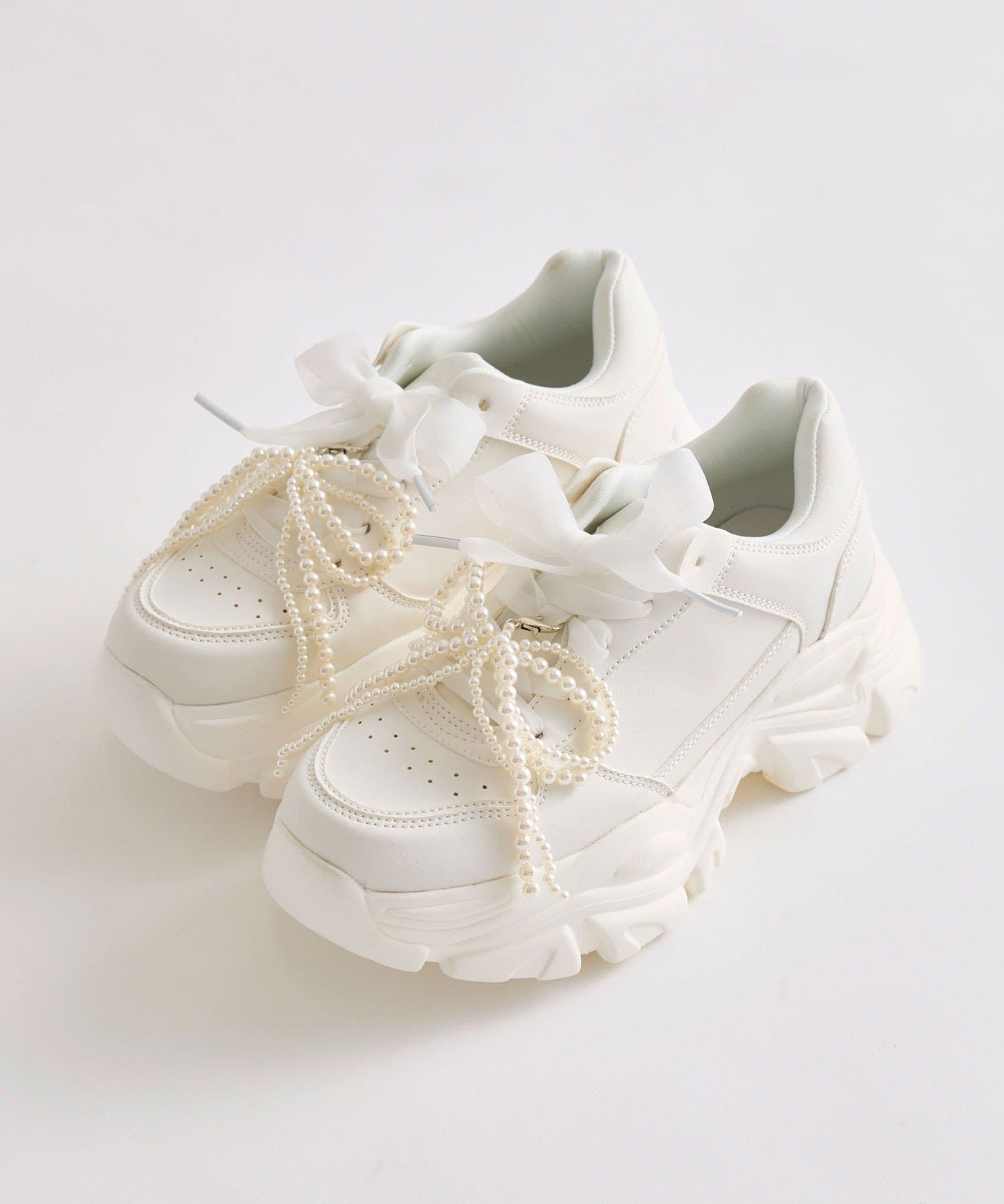・太めの靴紐で作るリボンとパールのリボンチャームがかわいい、カジュアルアイテムながら甘さもあるデザインです。