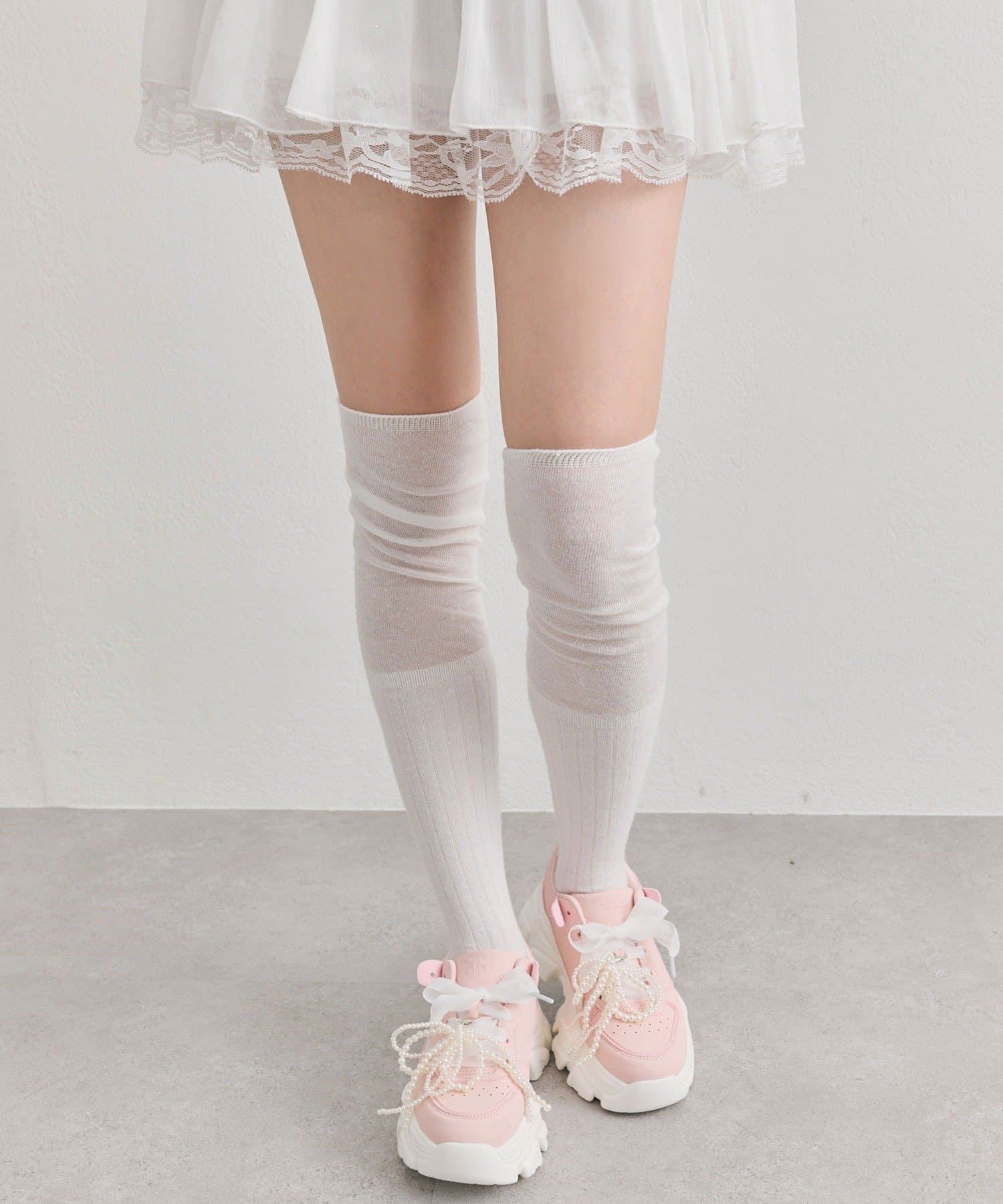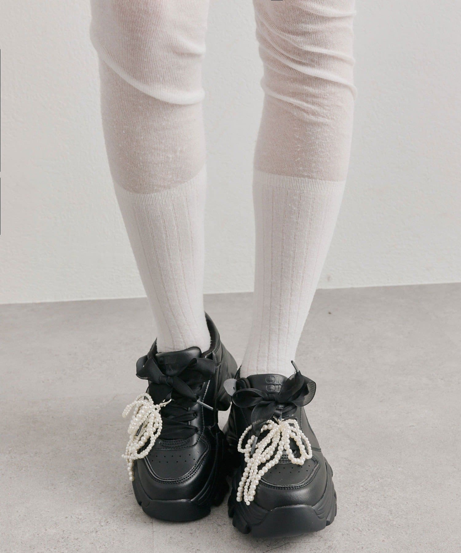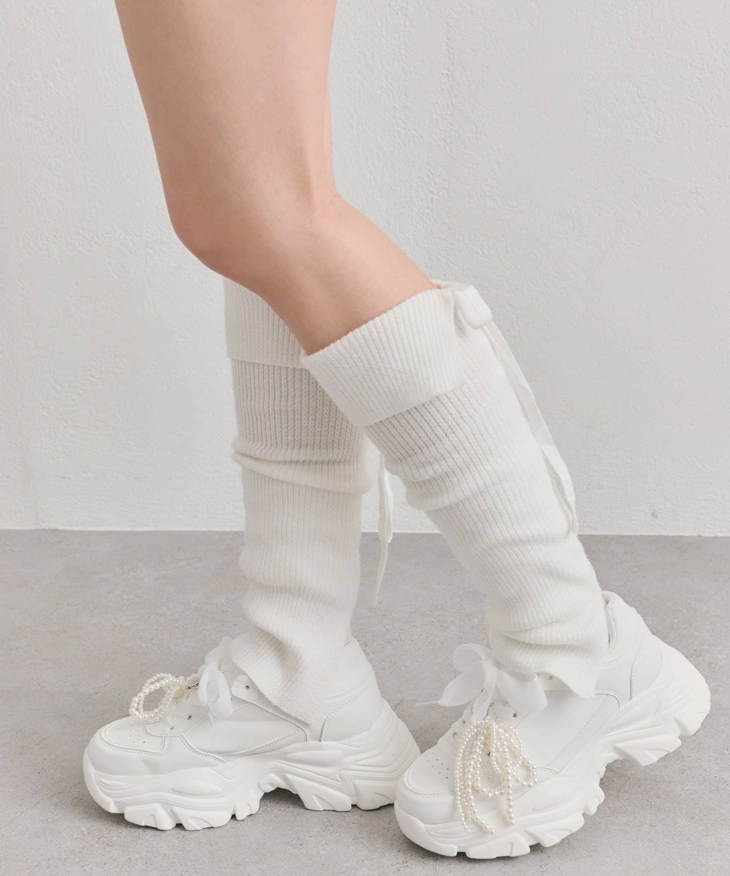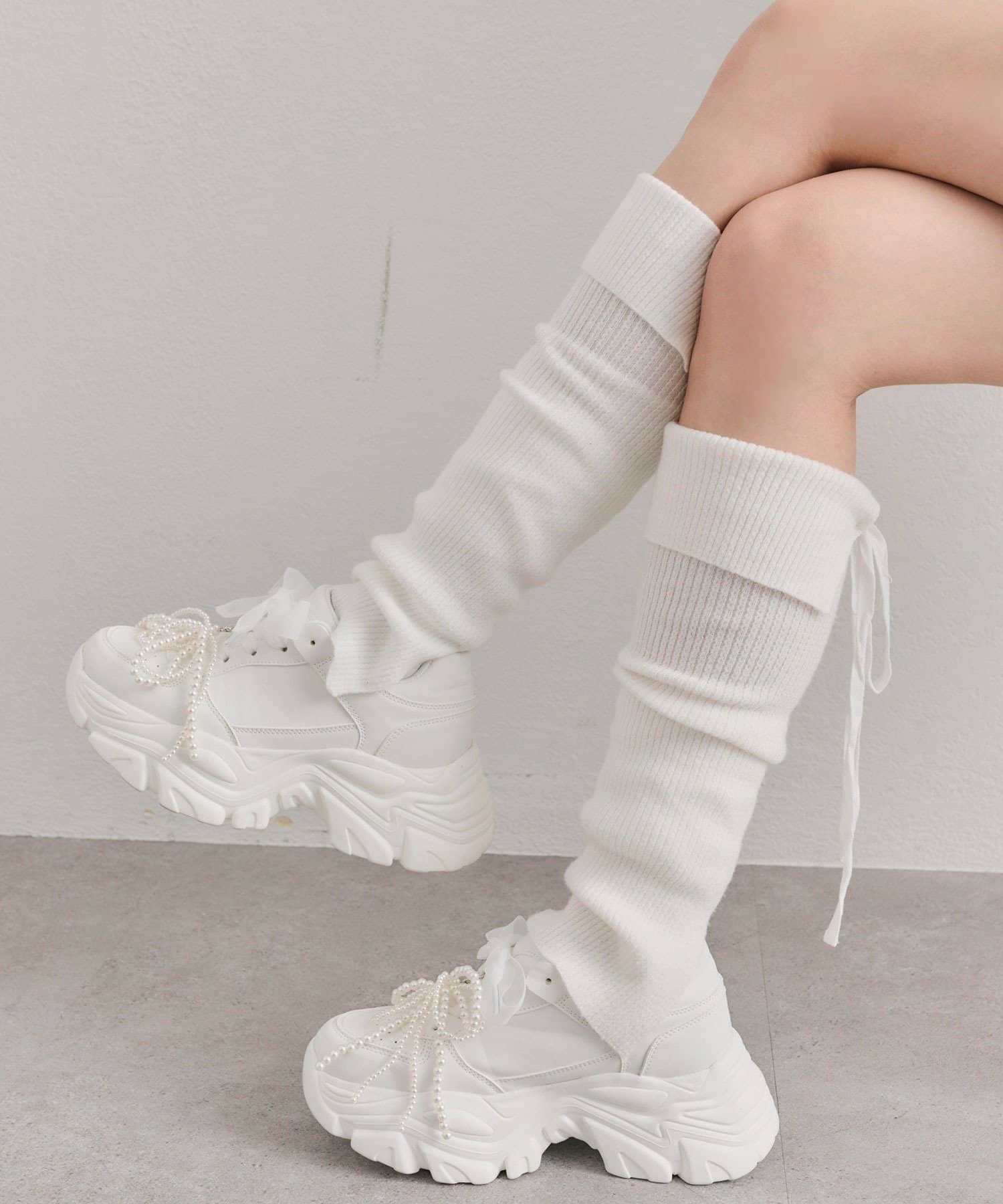 ・太めの靴紐で作るリボンとパールのリボンチャームがかわいい、カジュアルアイテムながら甘さもあるデザインです。