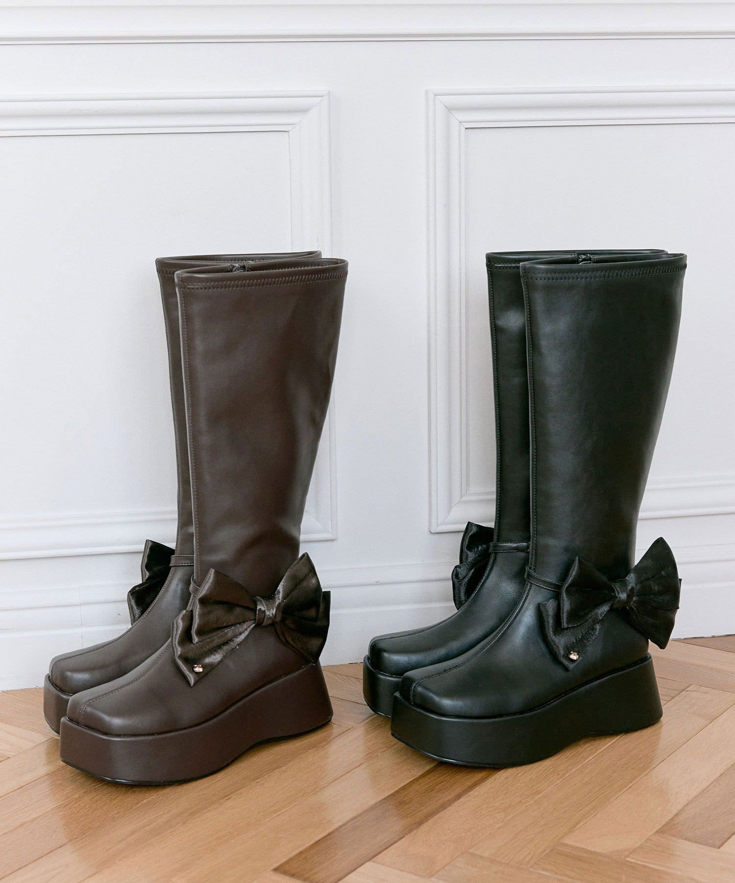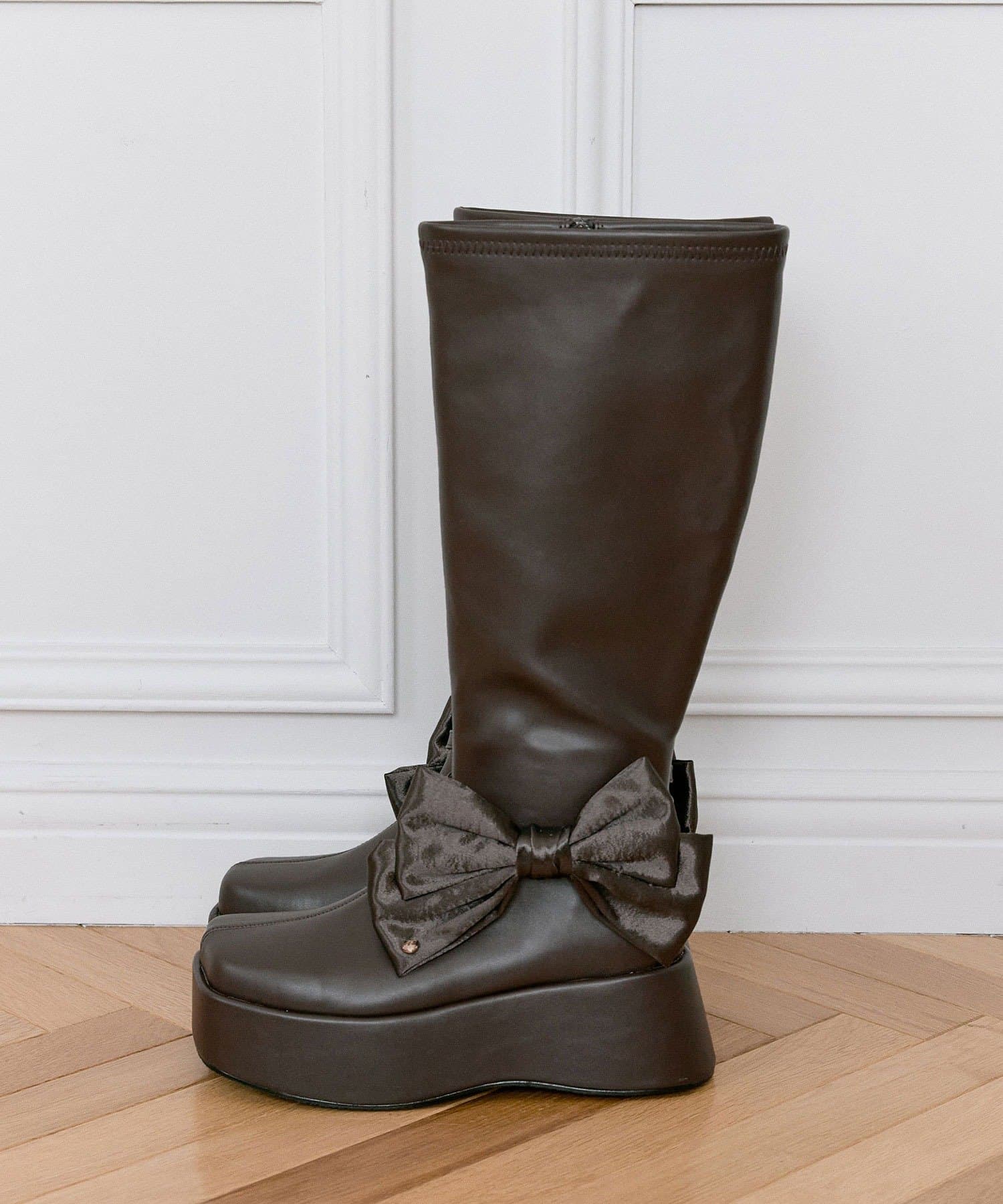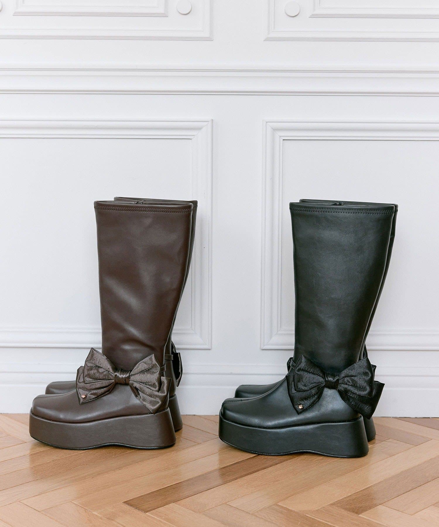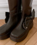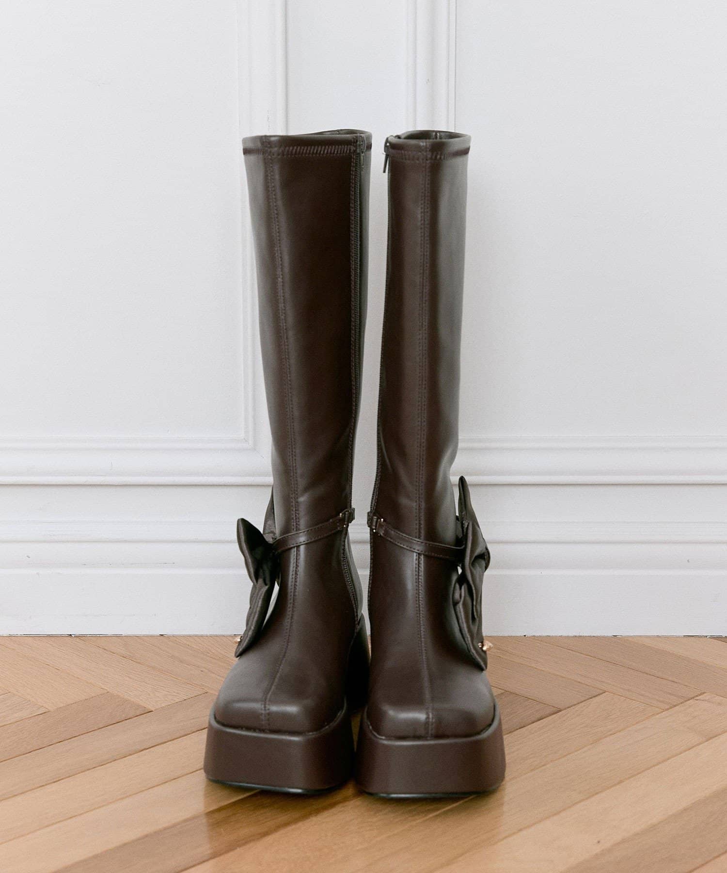 ・リボン付きで甘さがありつつ、スクエアトゥできっちり見えするロングブーツ。