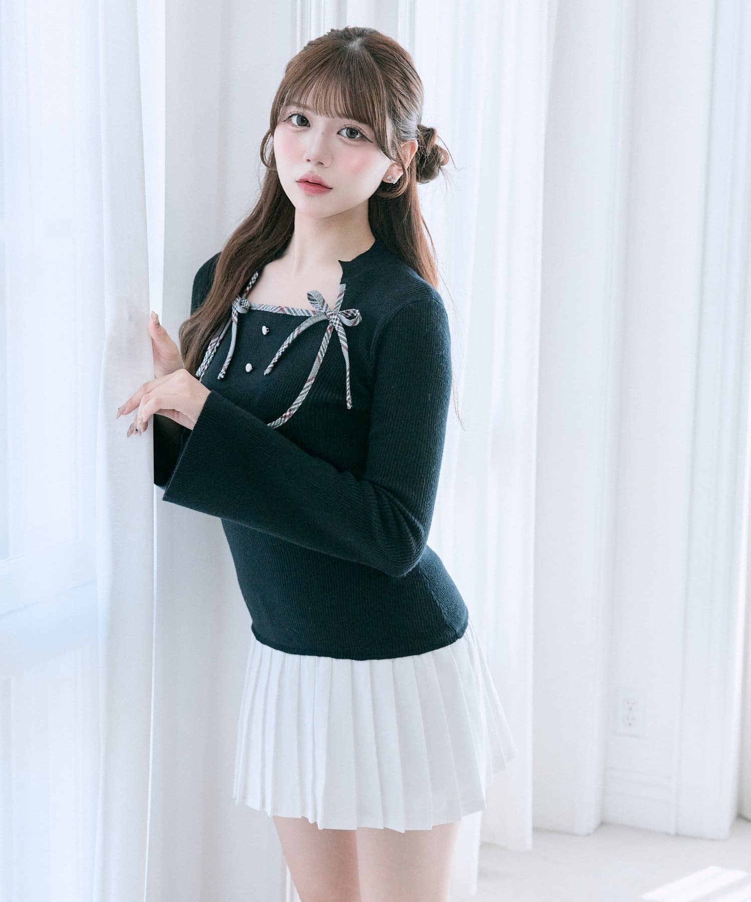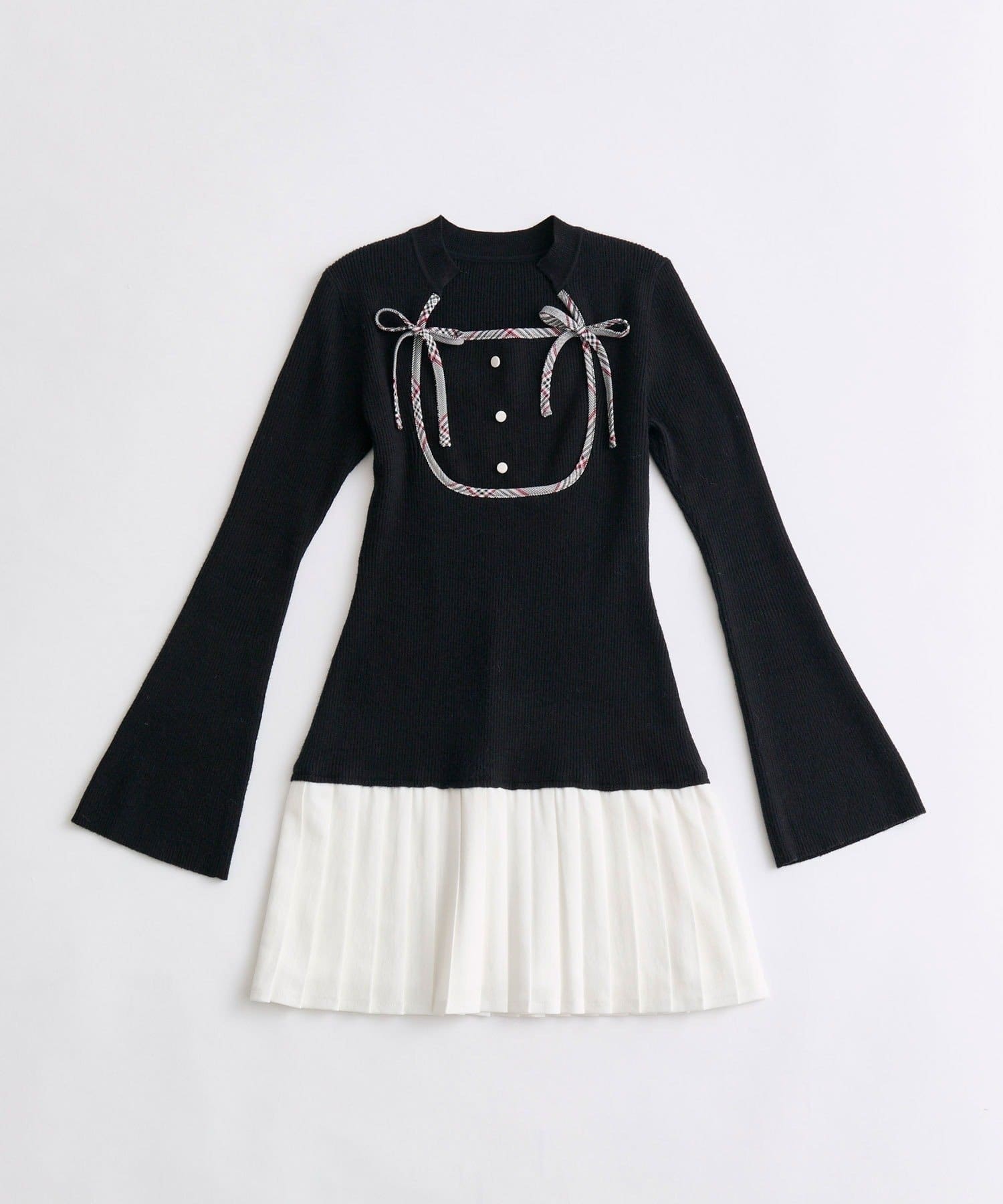 ・チェックの配色リボンが映えるニットワンピ。
