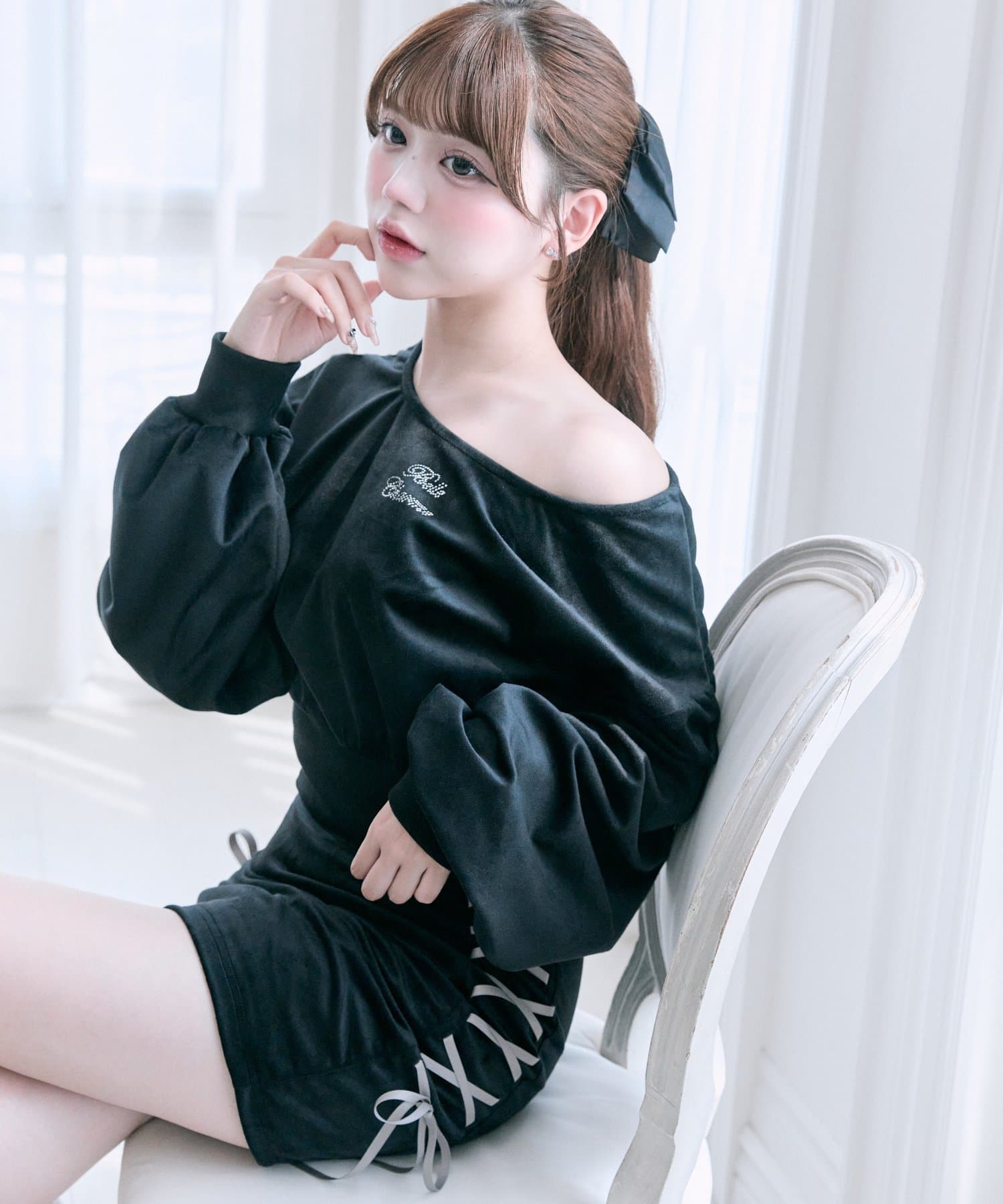・広めのネックラインでデコルテをきれいに見せ、ワンショルで着てもかわいいデザインです。