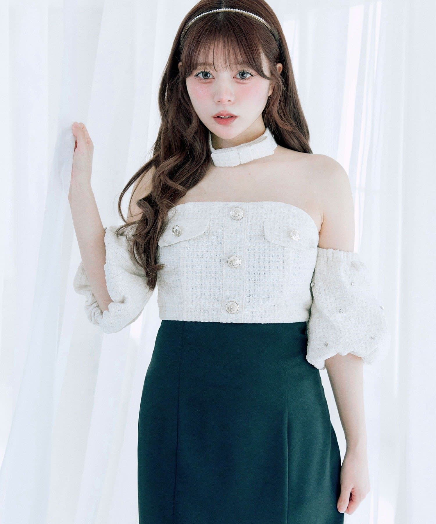 ・袖には大きめビジューを使用し、リボンチョーカーで顔まわりまで可愛く映えるデザイン。