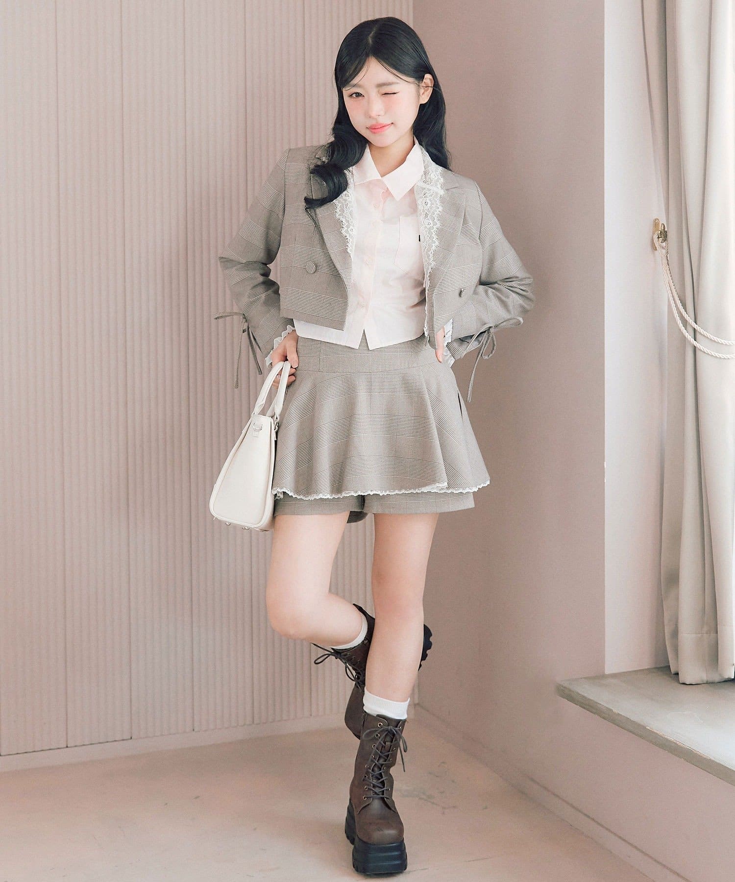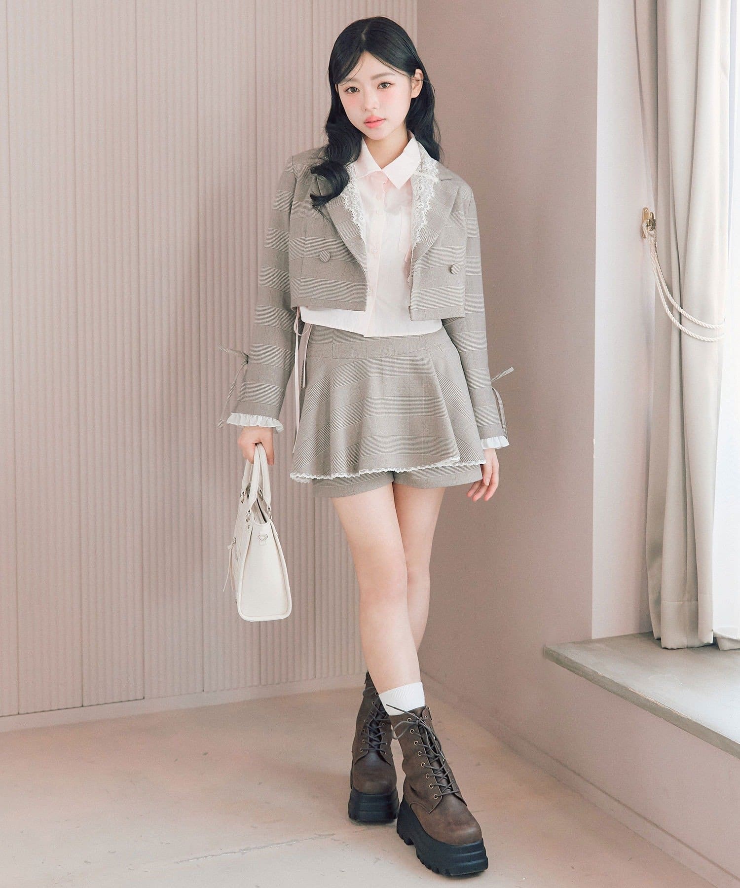 ・足元はロングブーツやローファーを合わせると、甘めな今っぽい着こなしに。