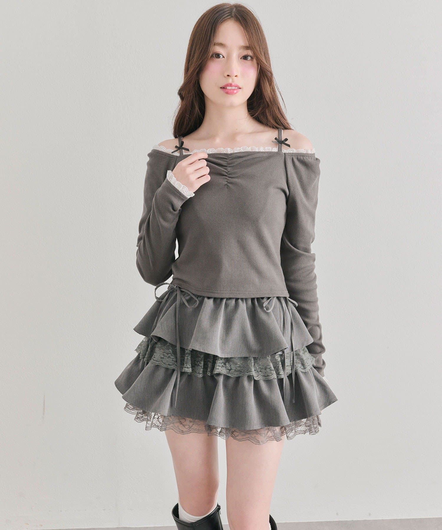 ・足元はロングブーツやローファー合わせで、甘さを引き締めるのがおすすめ。