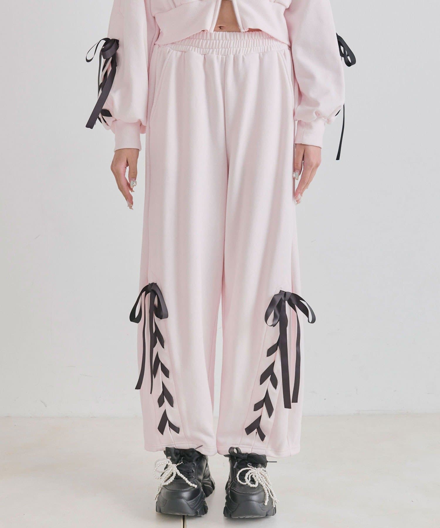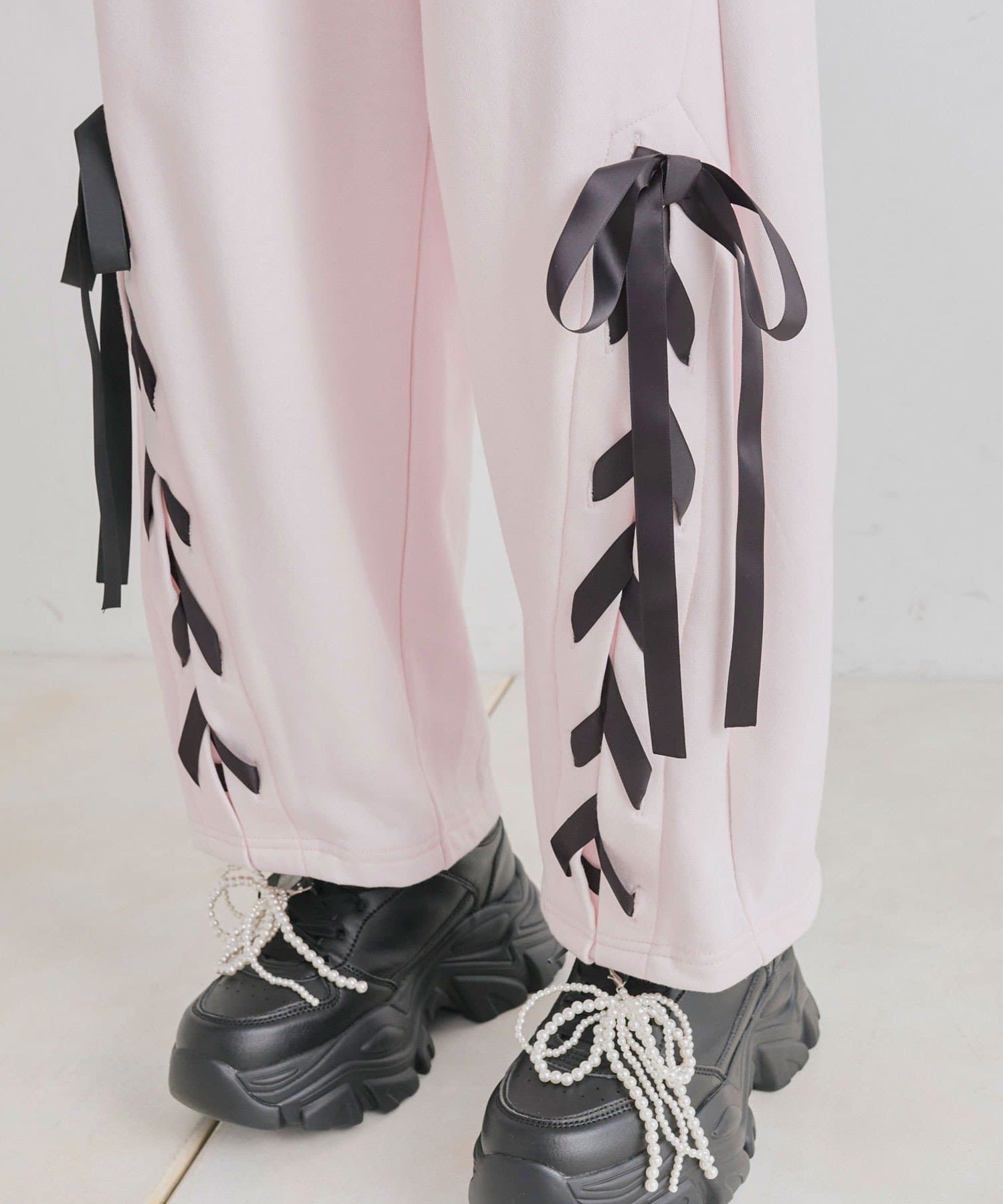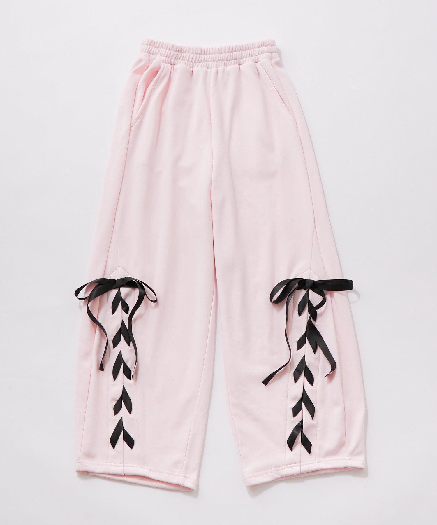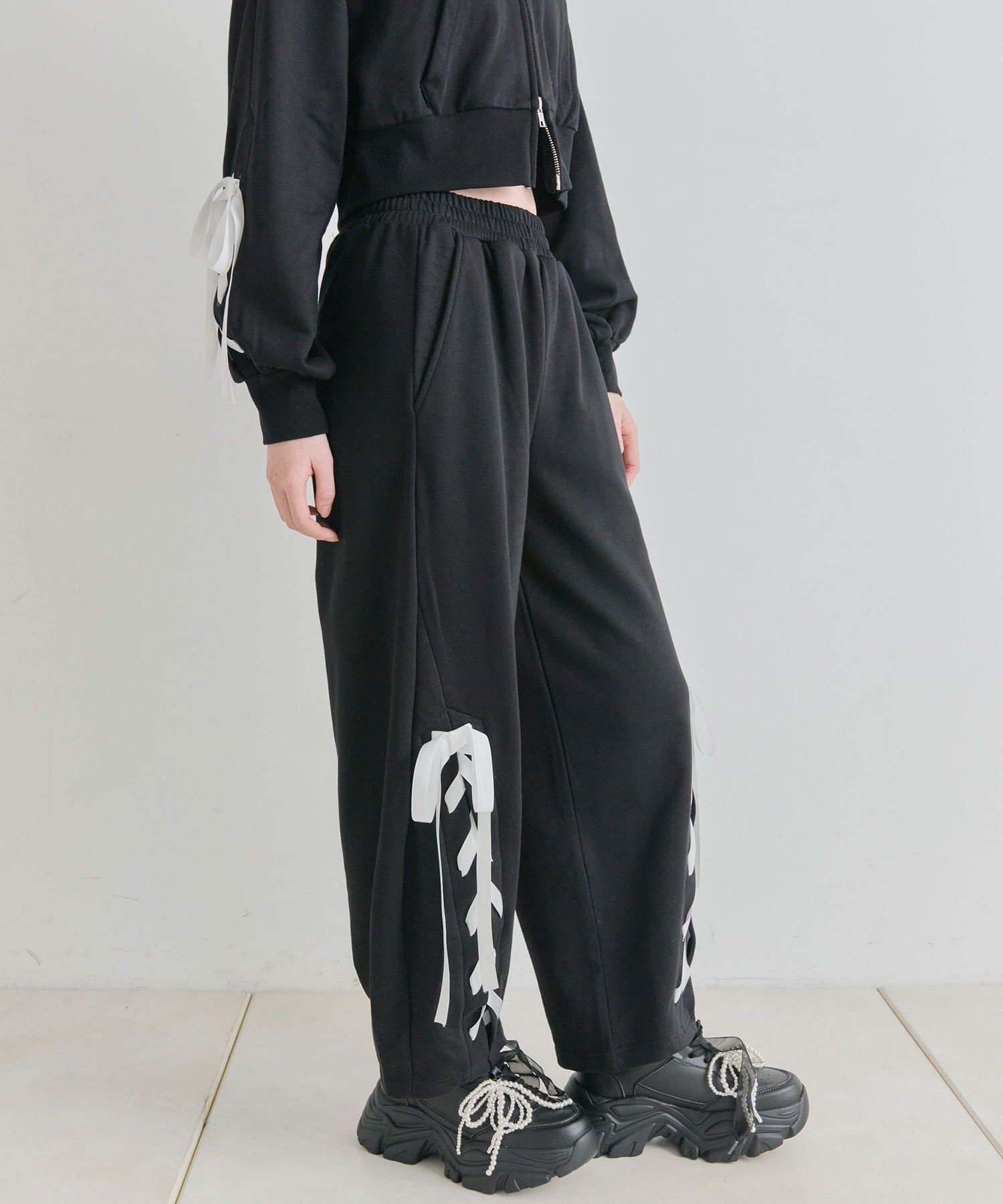 ・カジュアルなスウェットパンツに、リボンレースアップを取り入れたガーリーなデザイン。