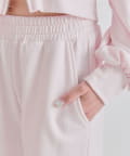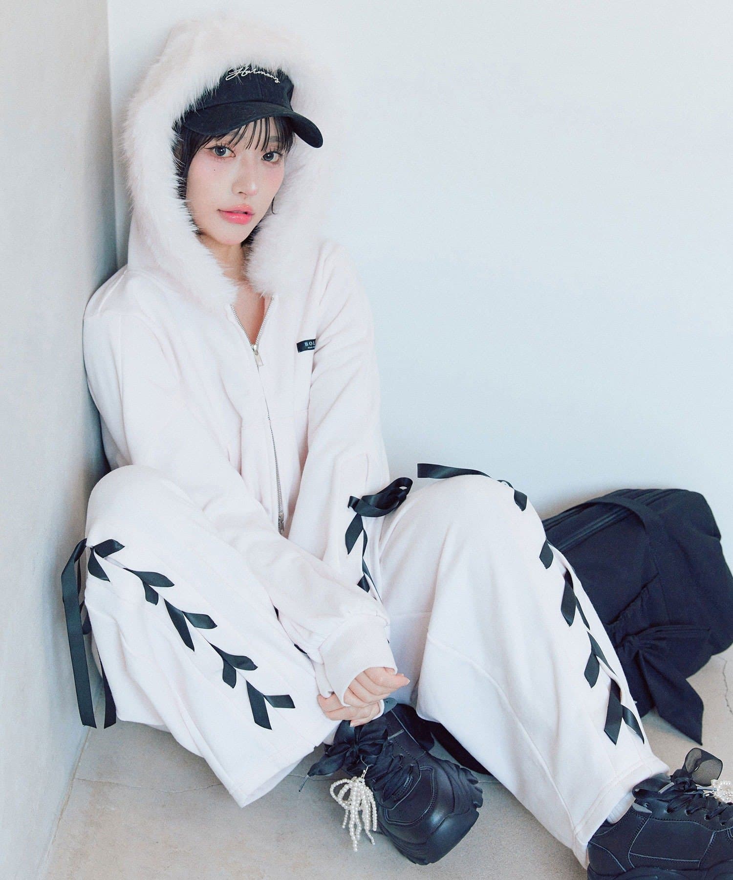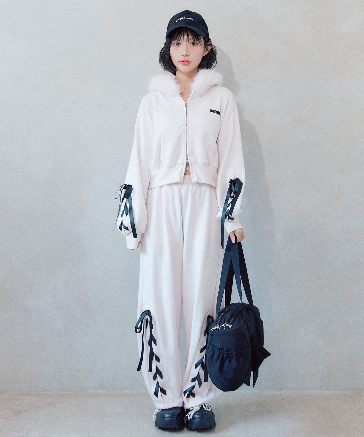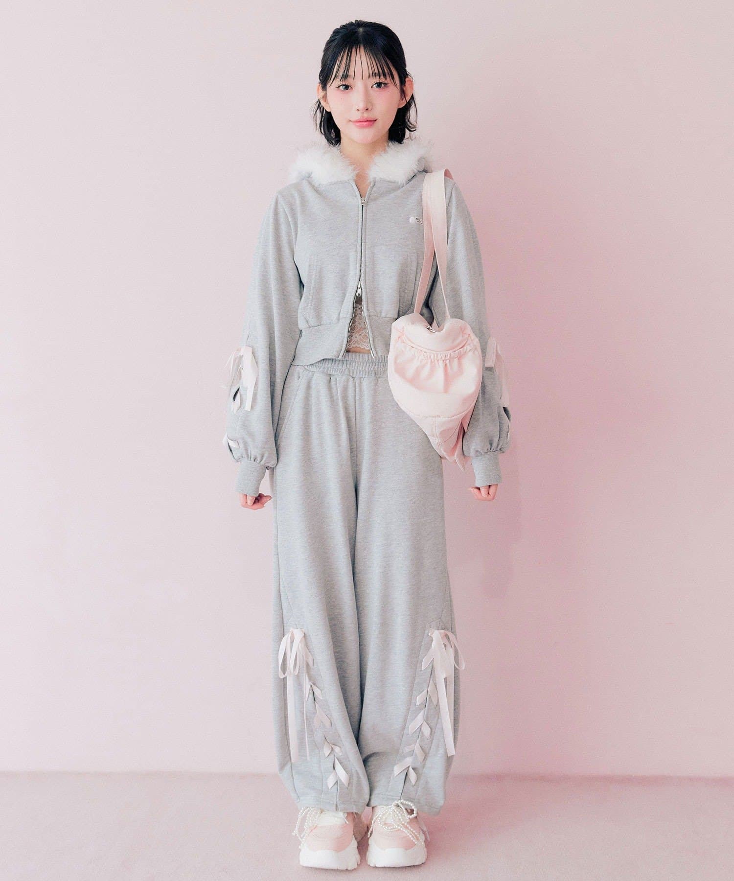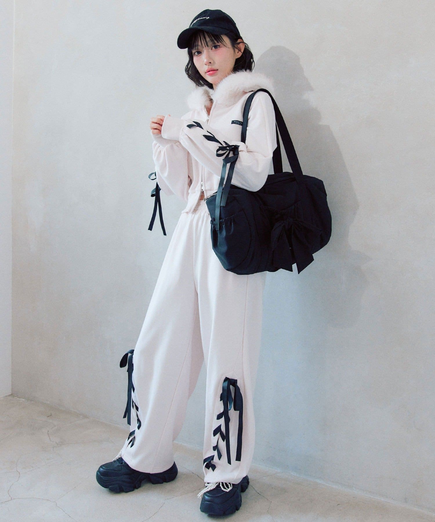 ・カジュアルなスウェットパンツに、リボンレースアップを取り入れたガーリーなデザイン。