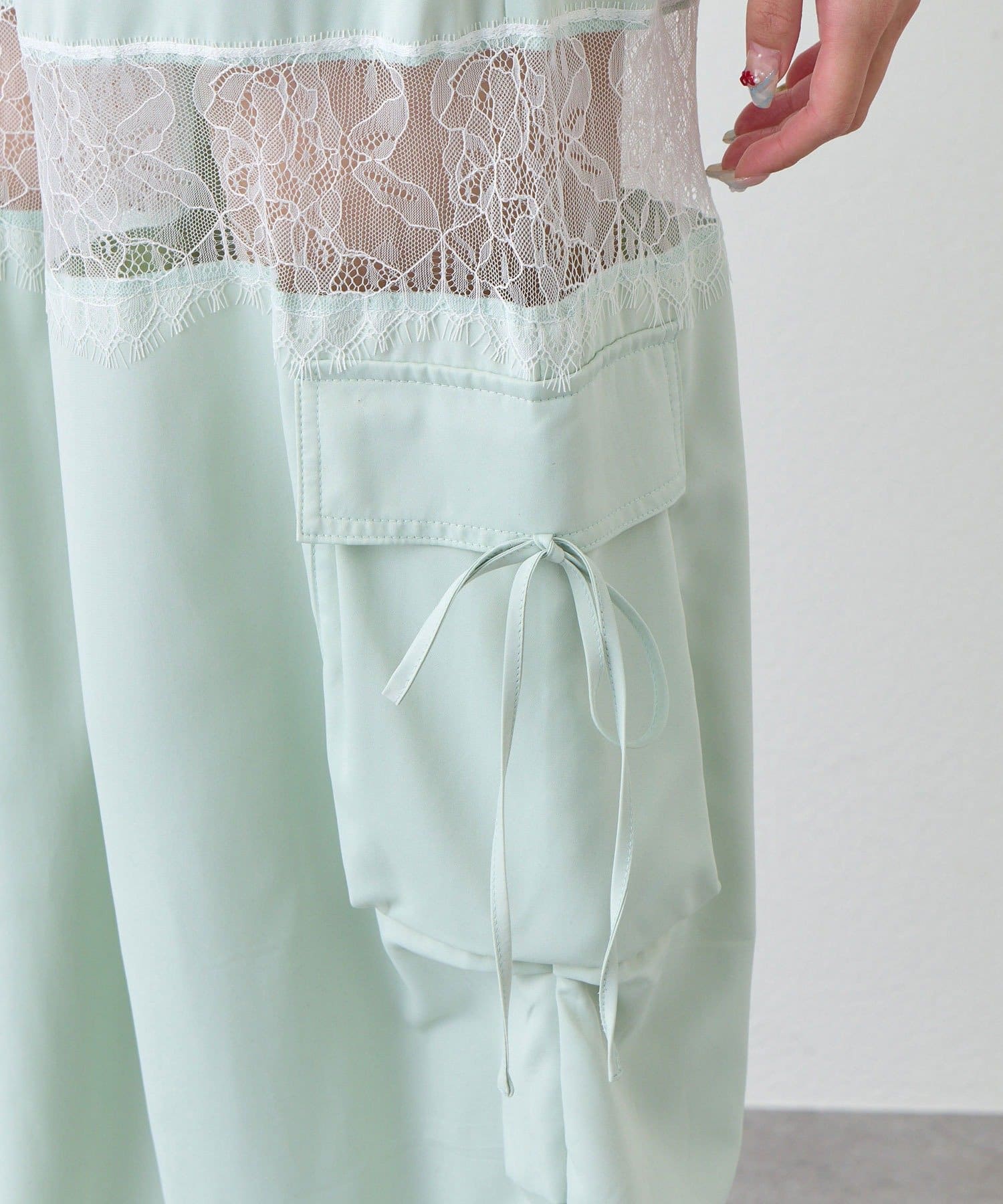 ・スポーティーな印象のカーゴパンツに、リボンやレースで甘さをプラスしたデザイン。