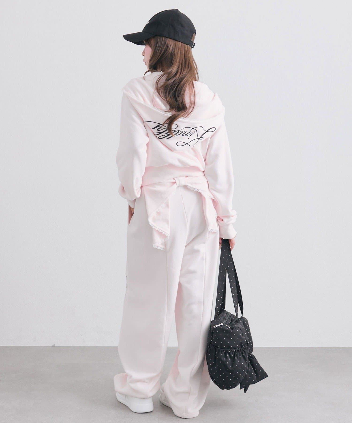 ・前には刺繍ロゴ、後ろには大きなリボン付きでどこから見てもかわいいデザイン。