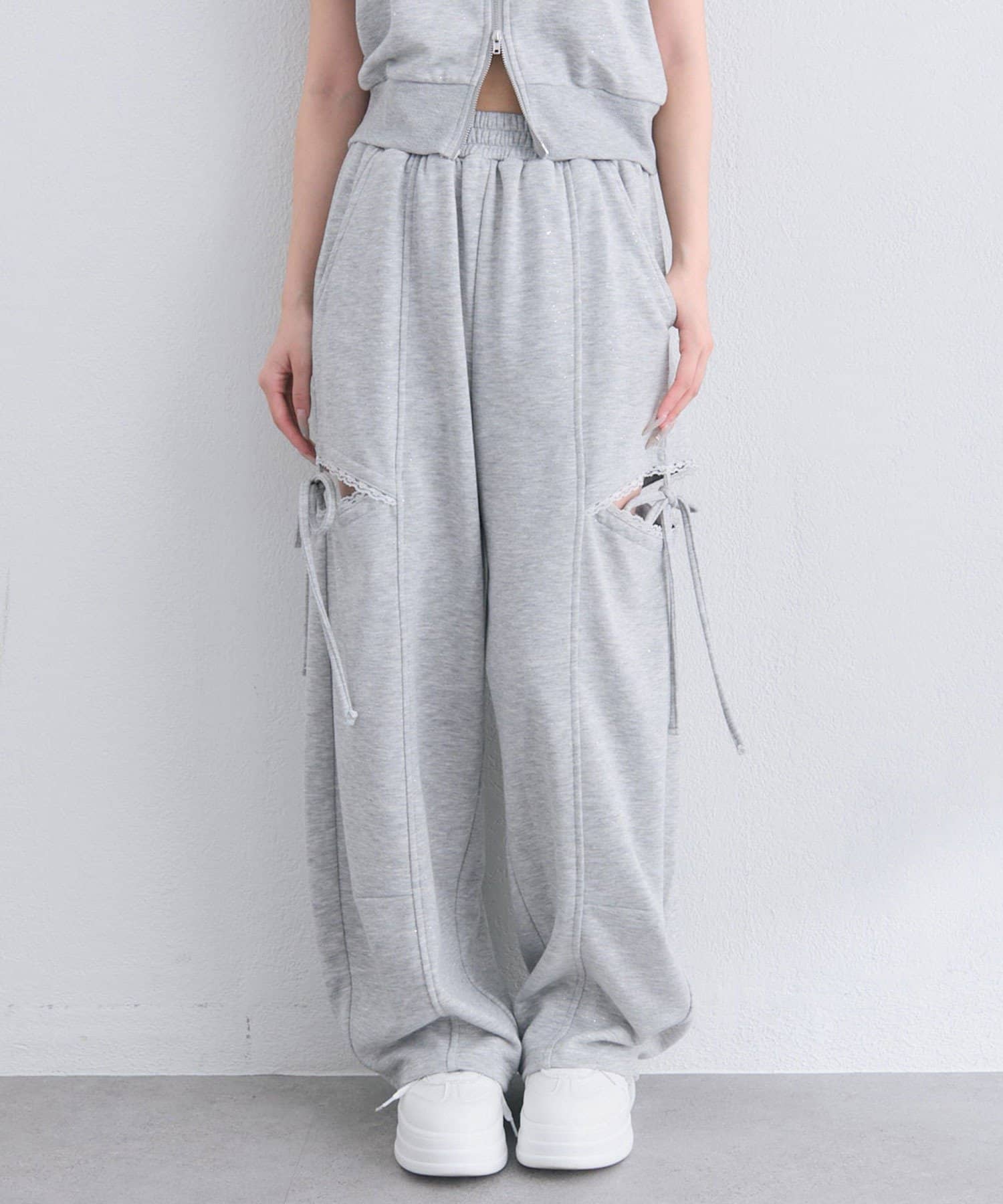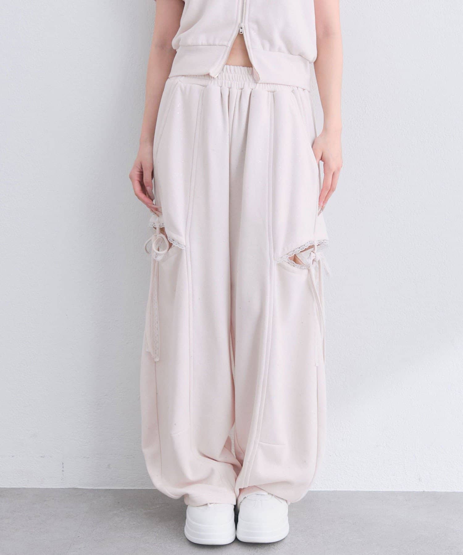 ・スリット部分に施された華奢なリボンやレースが、さりげなく甘さをプラス。