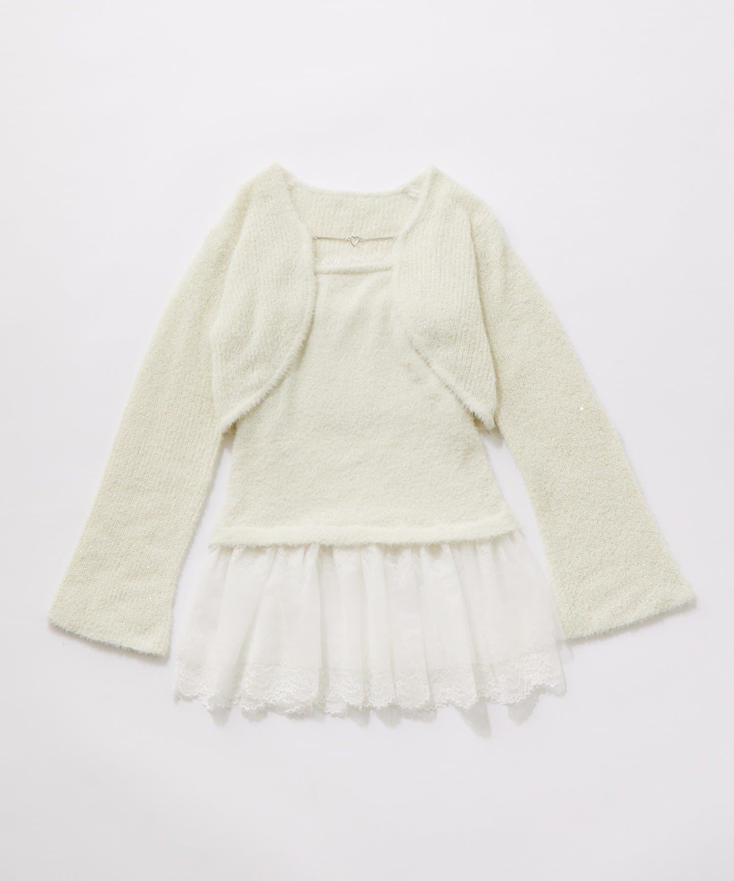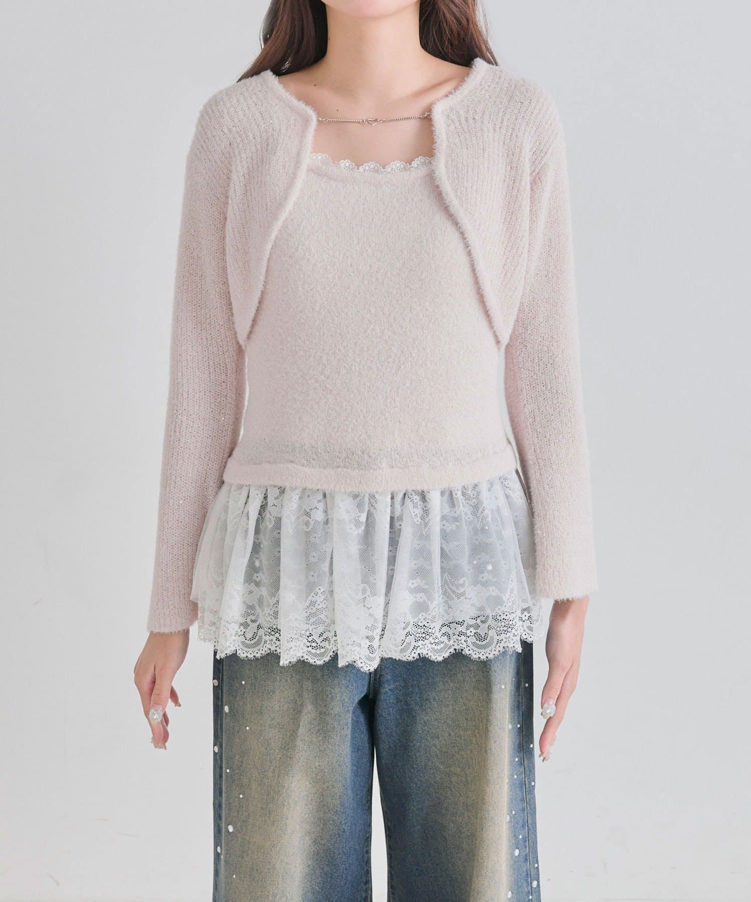 ・簡単にレイヤードコーデが完成する、ニットのボレロとレース付きキャミのセット。