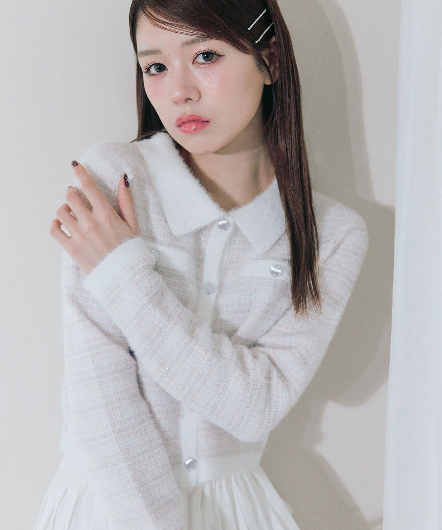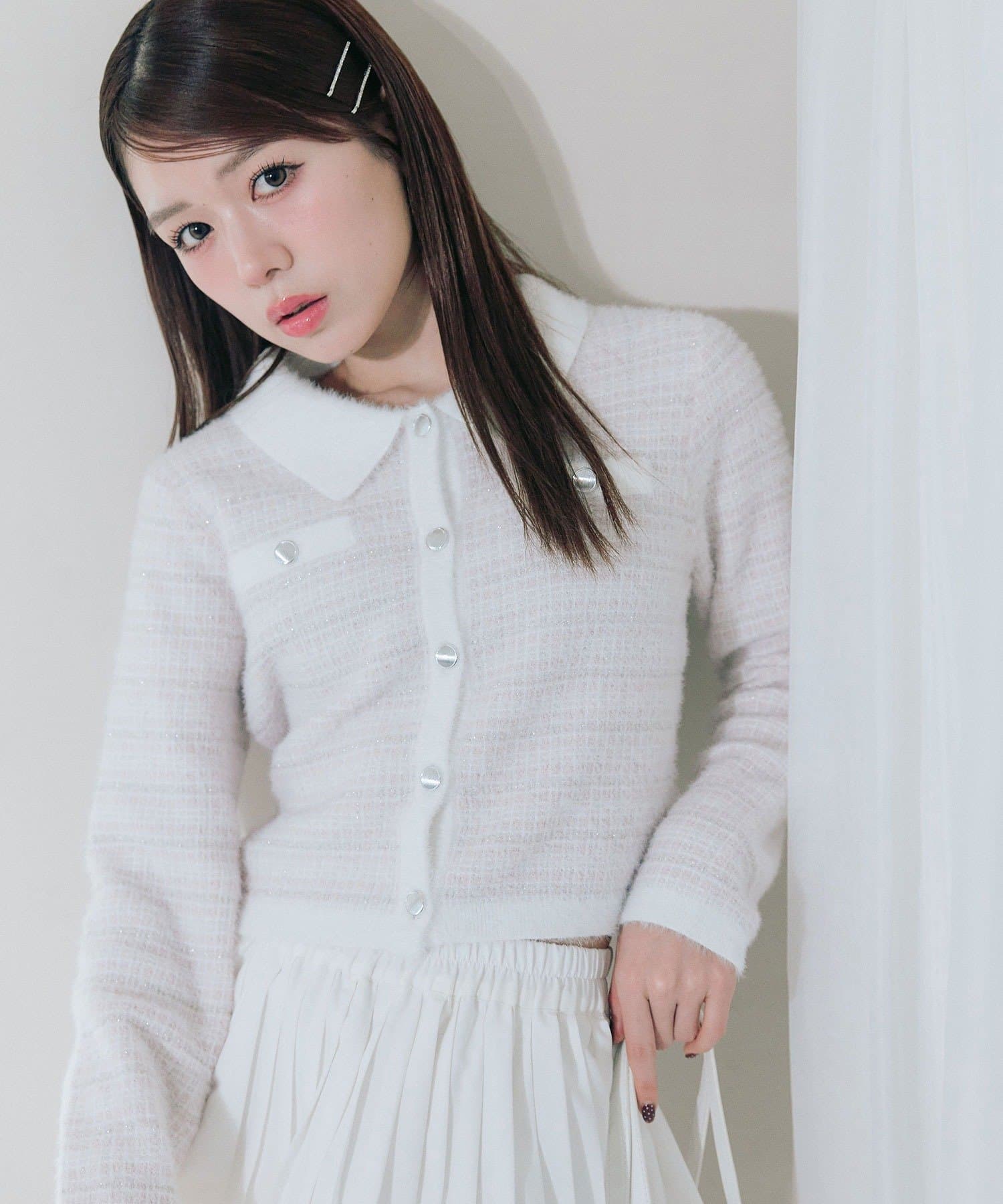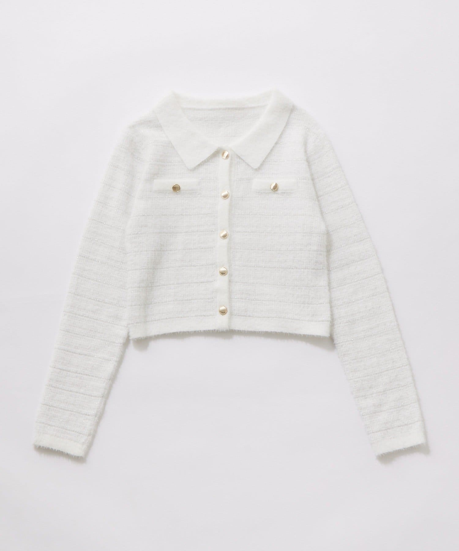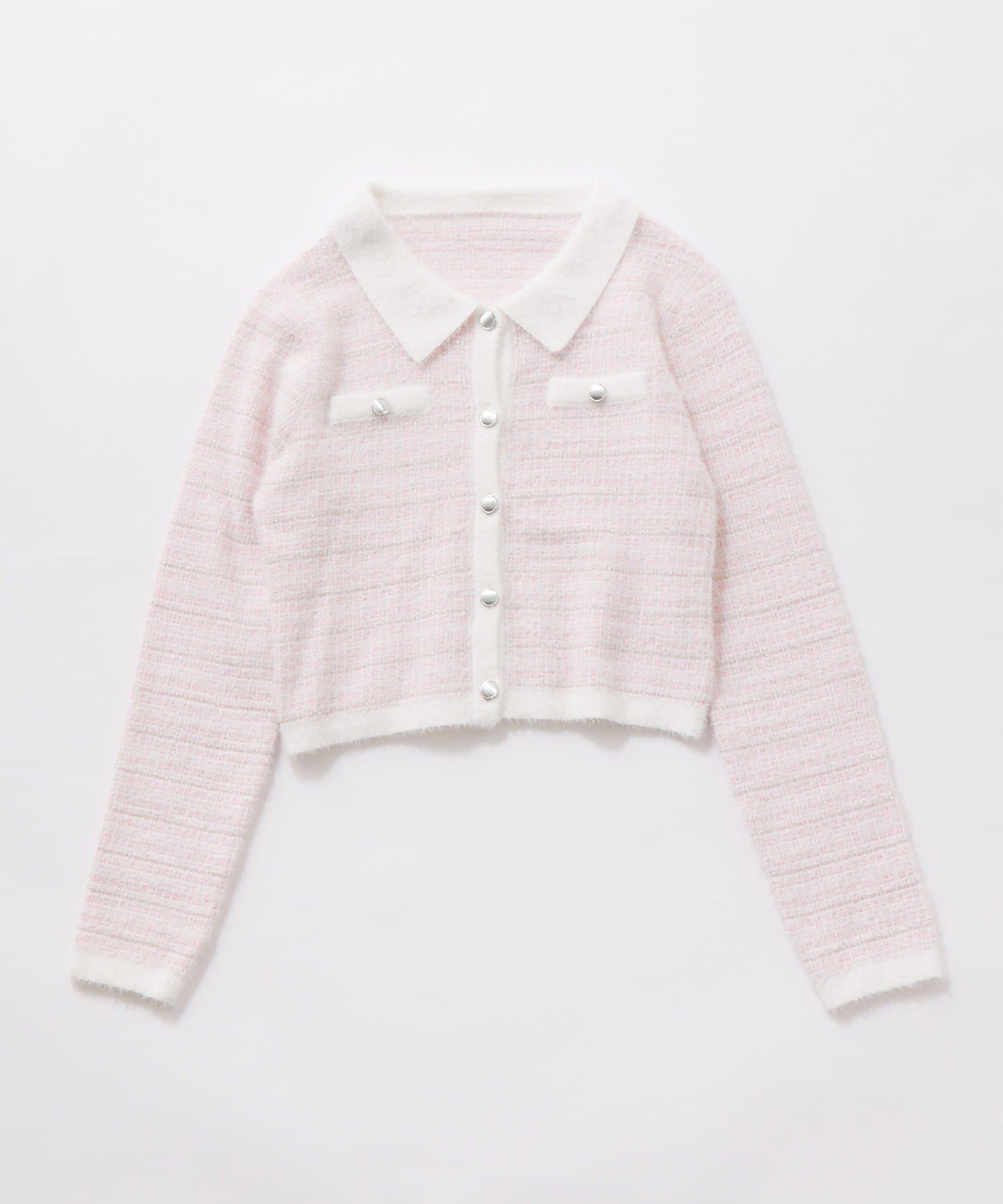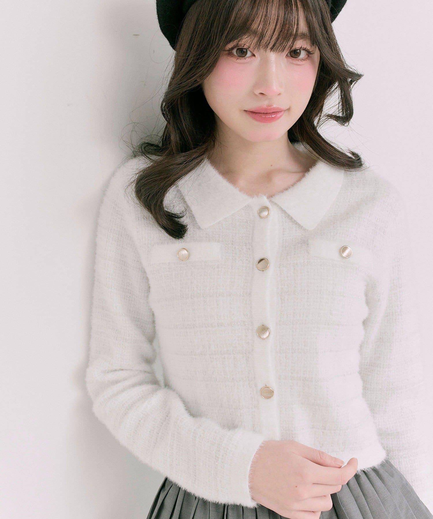 ・ラメ糸入りのシャギー素材が上品なツイード風の見た目とふんわりとした柔らかさを両立します。
