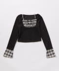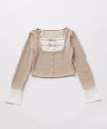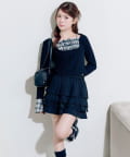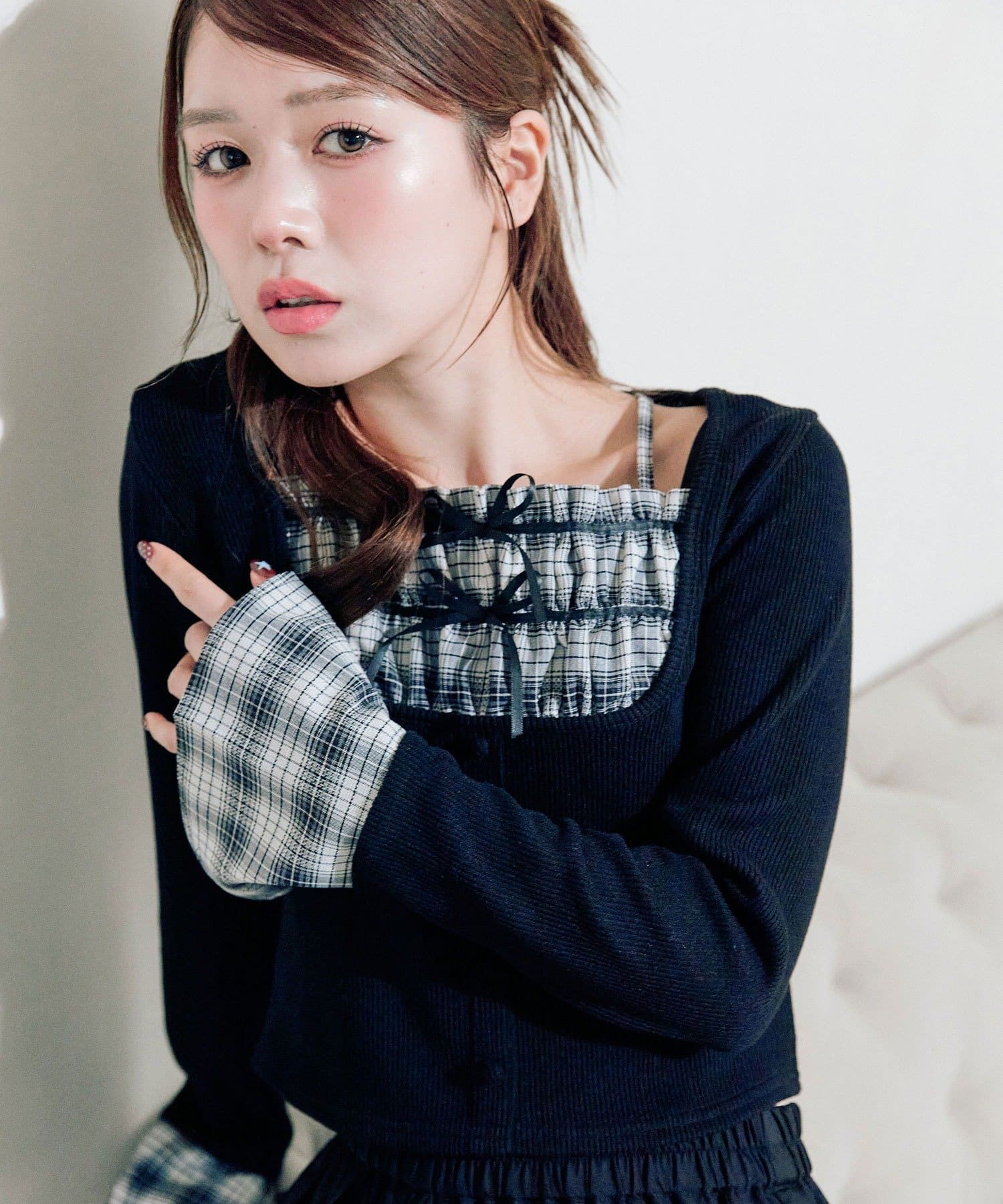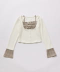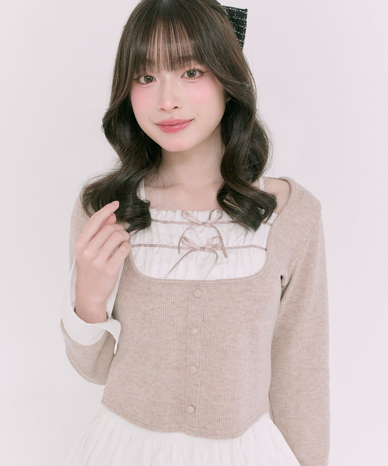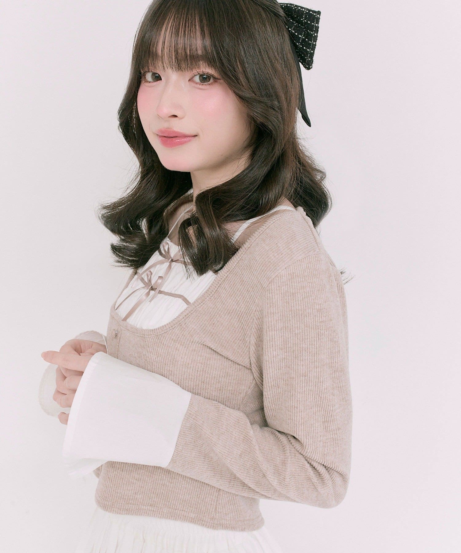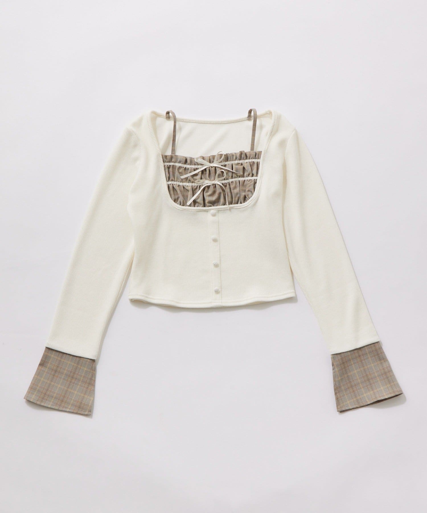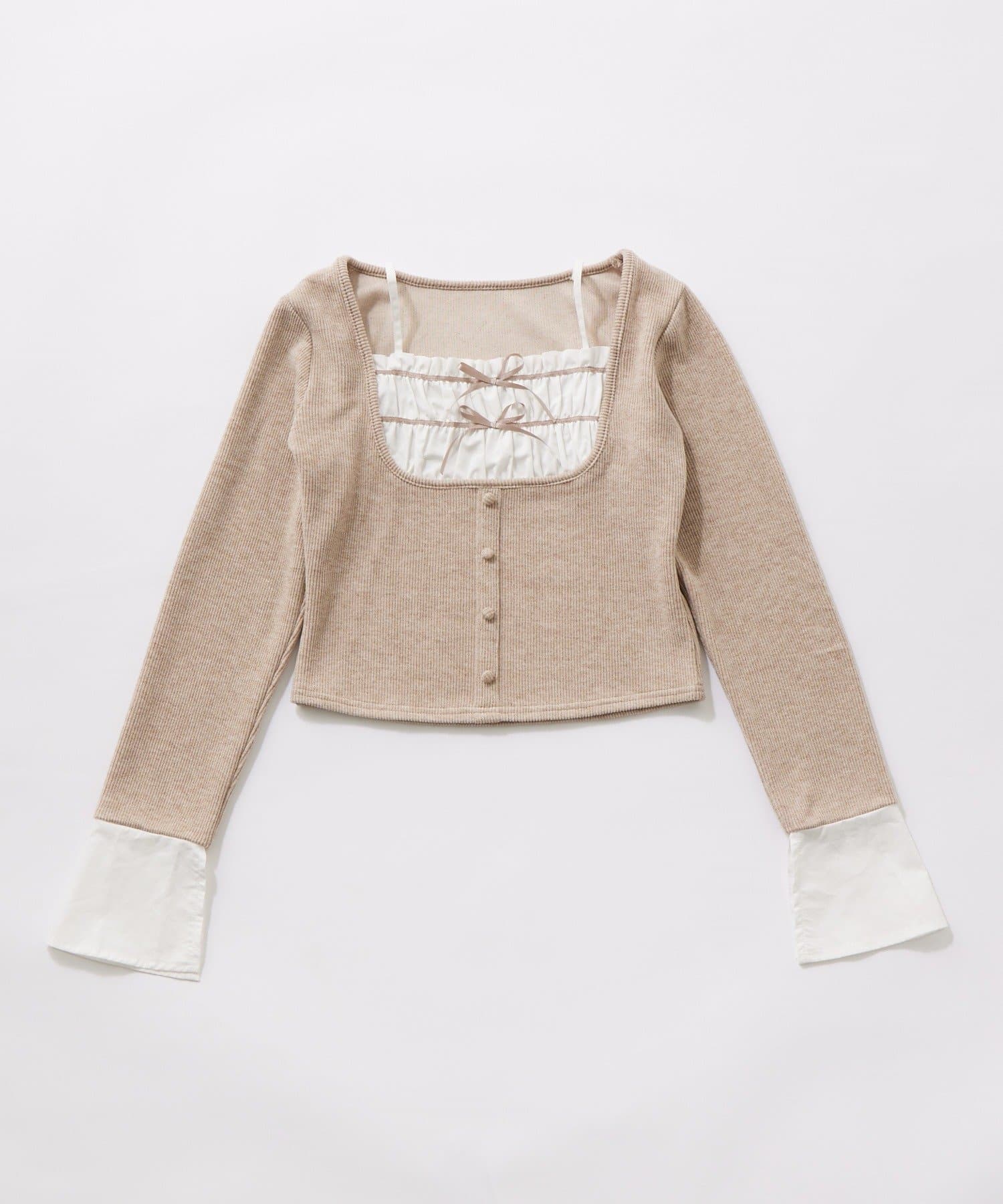 ・胸元のシャーリングとリボン使いがアクセントになるドッキングデザインです。