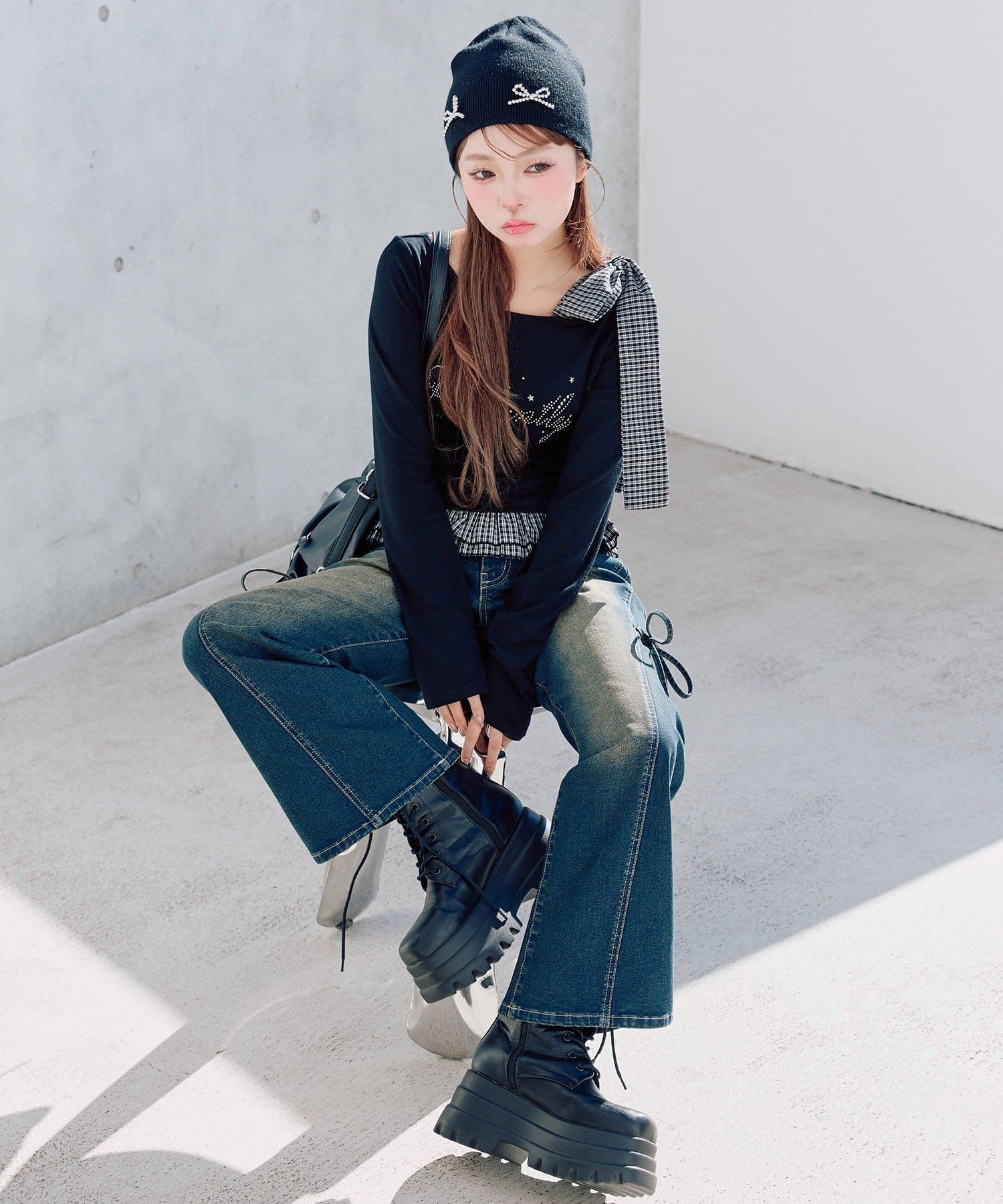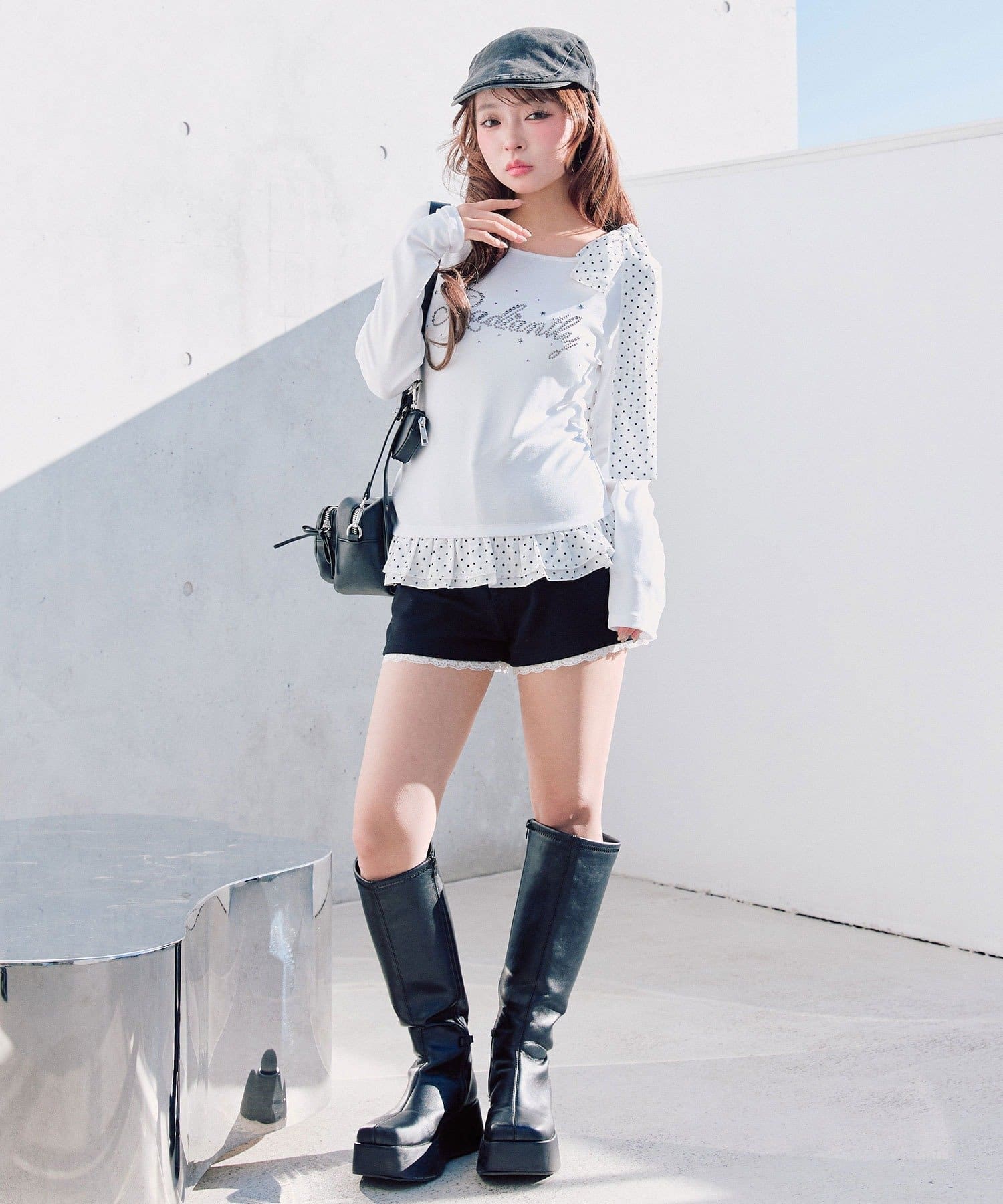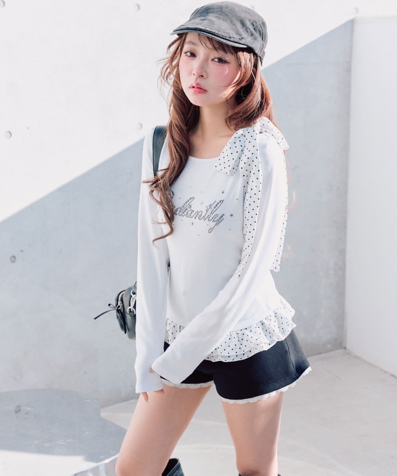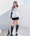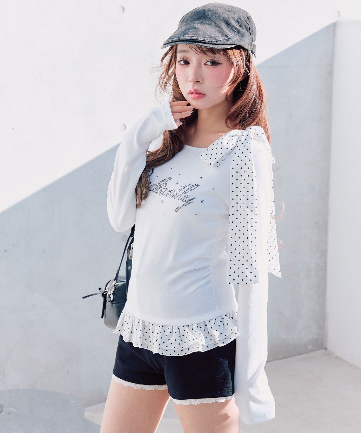 ・ミニボトムを合わせるとガーリーな着こなしになります。