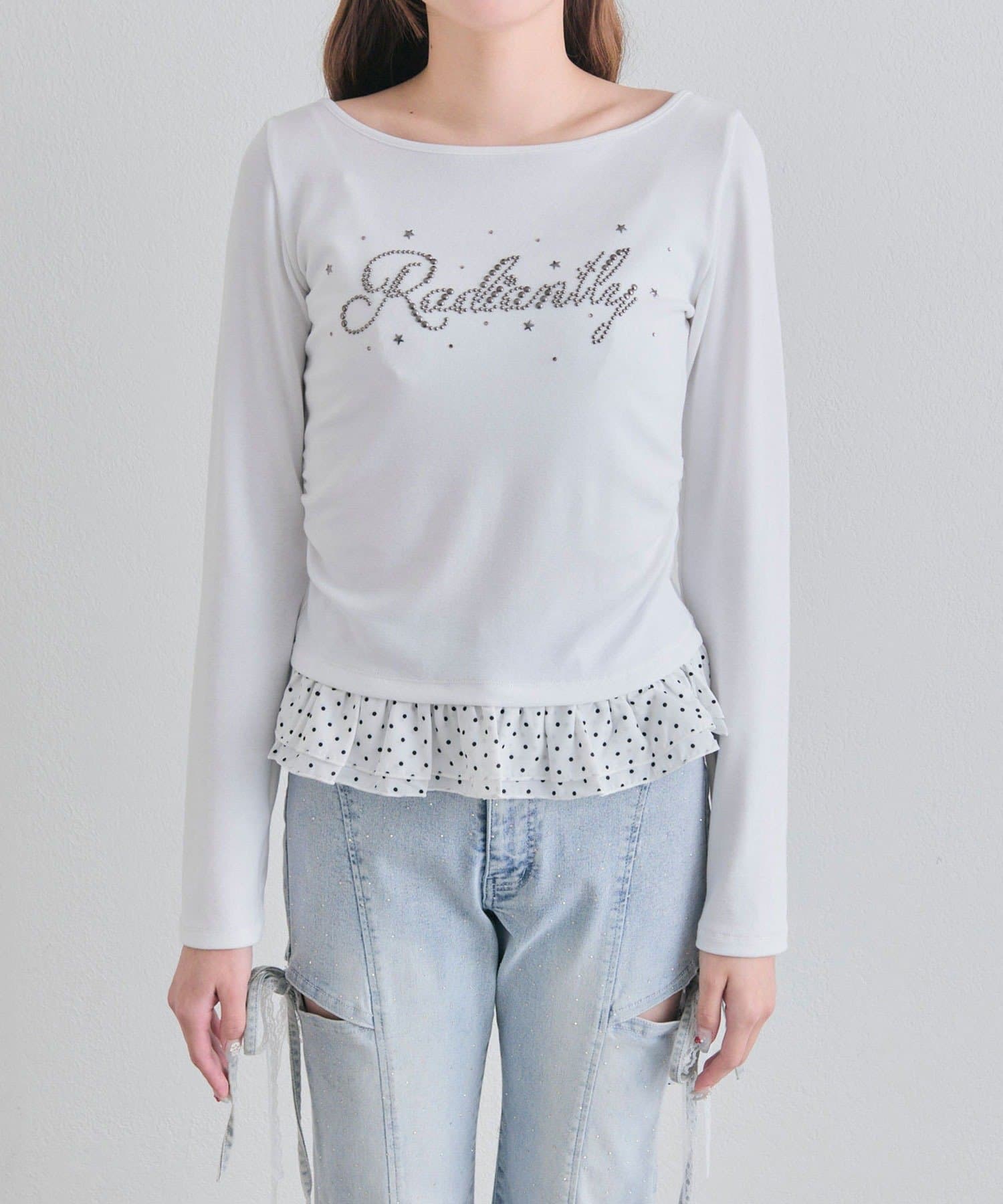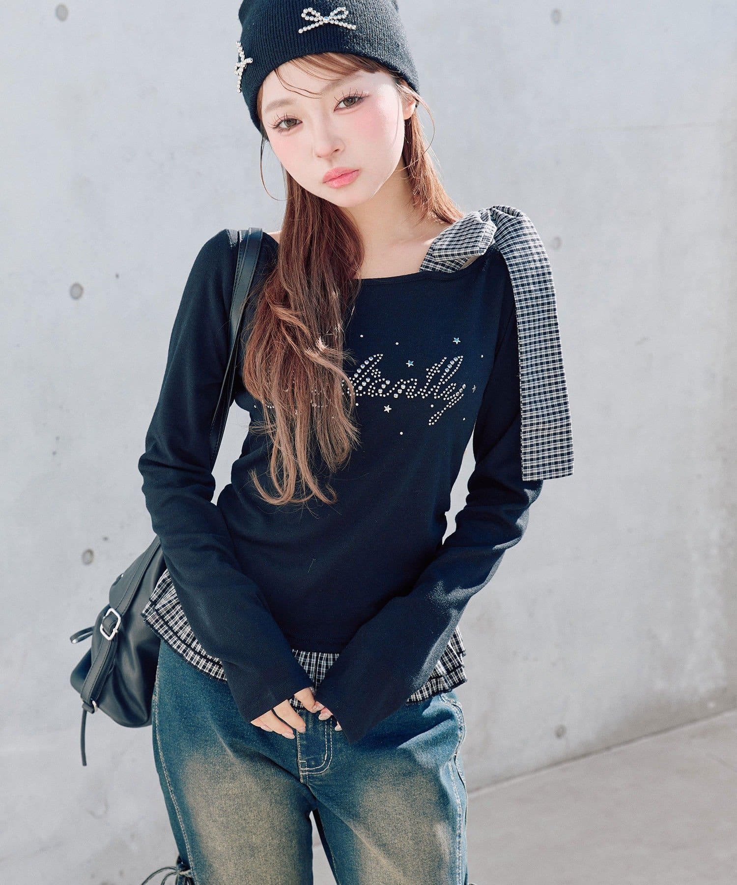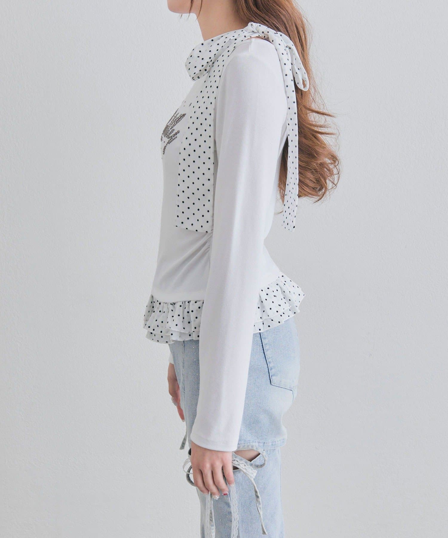・裾にはチェック柄のフリルをドッキングし、1枚でレイヤードスタイルが完成します。