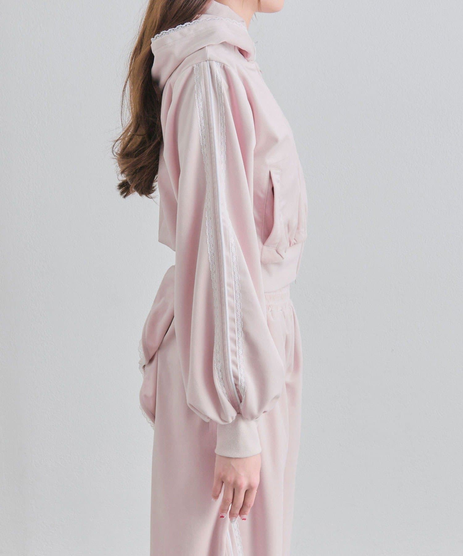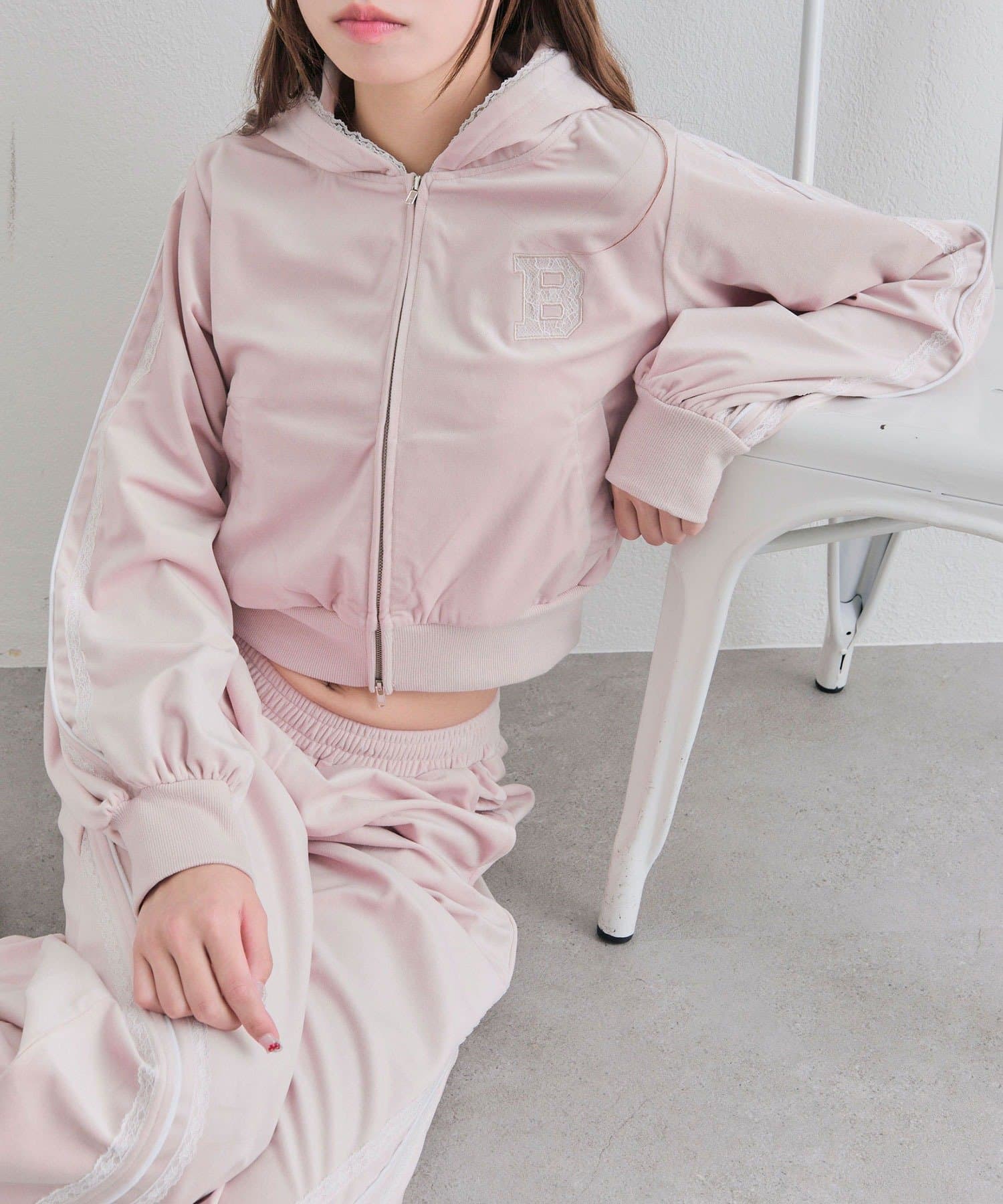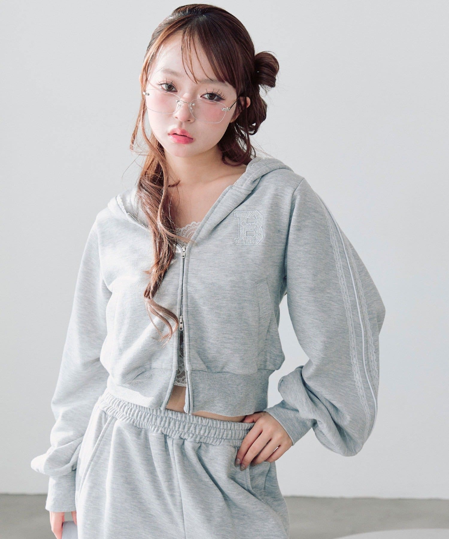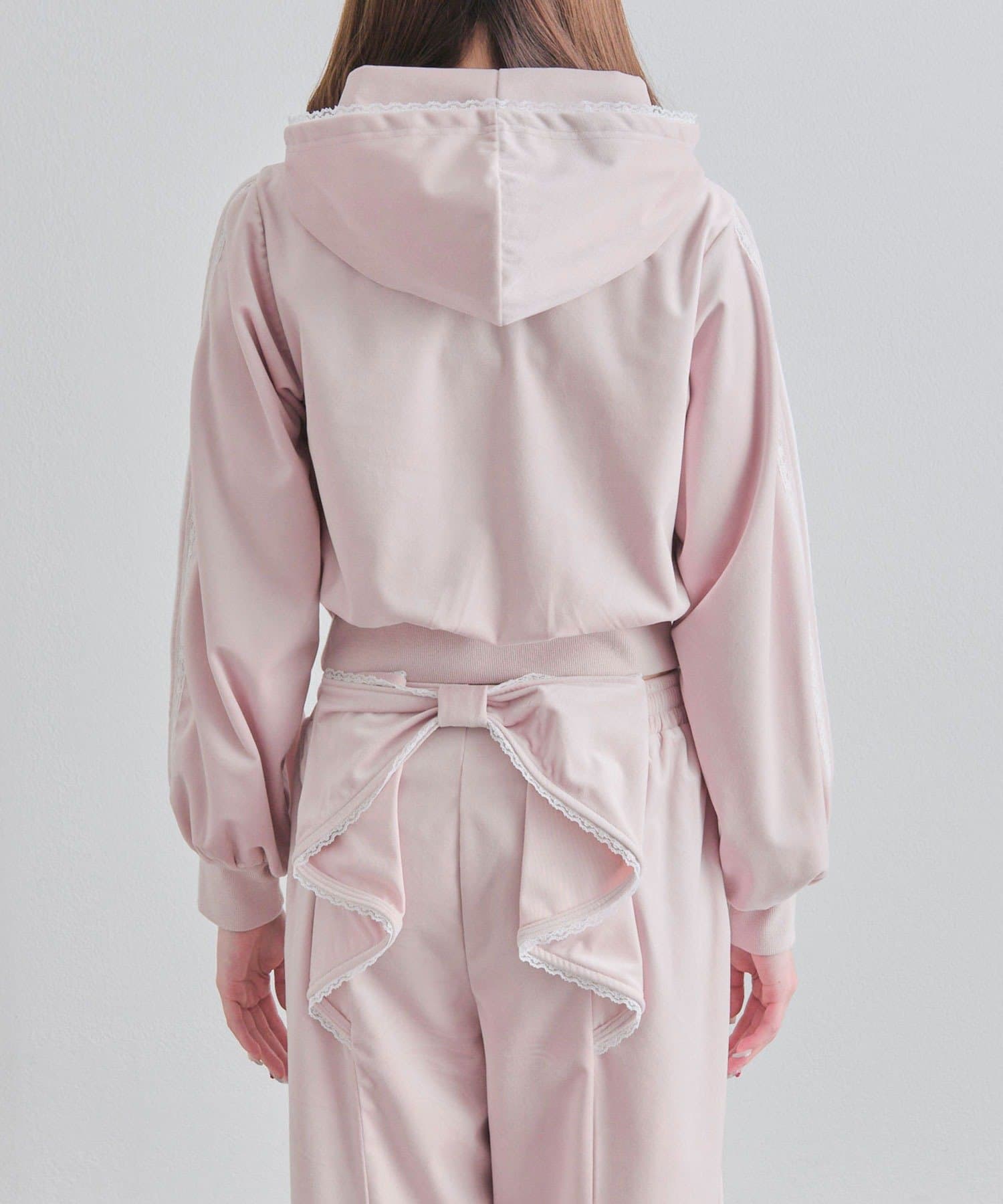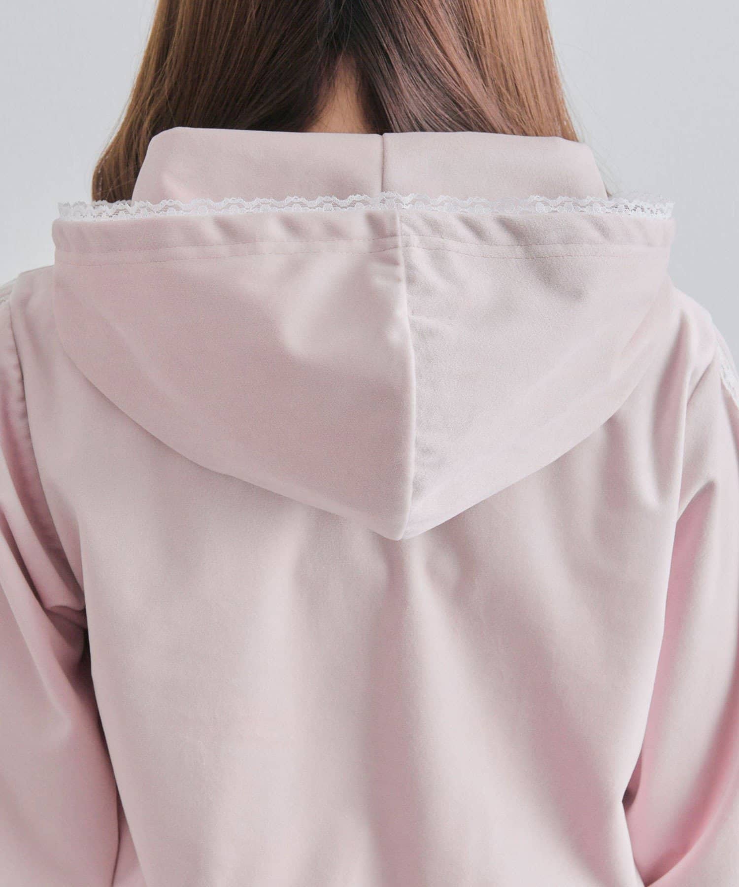 ・袖やフードの縁、胸元のロゴにレースを施し、カジュアルアイテムながら甘さもあるデザイン。