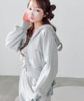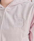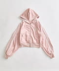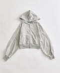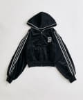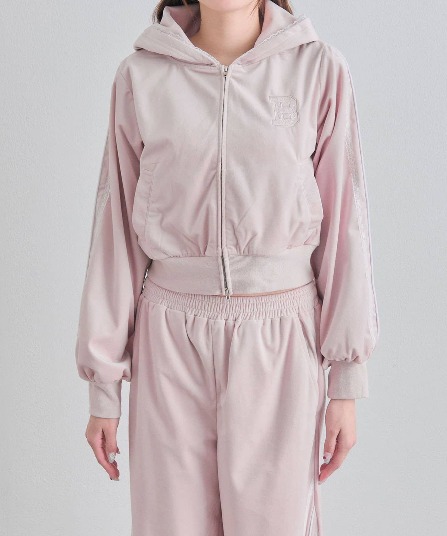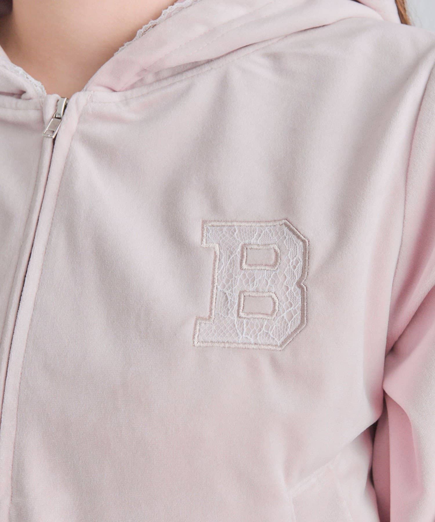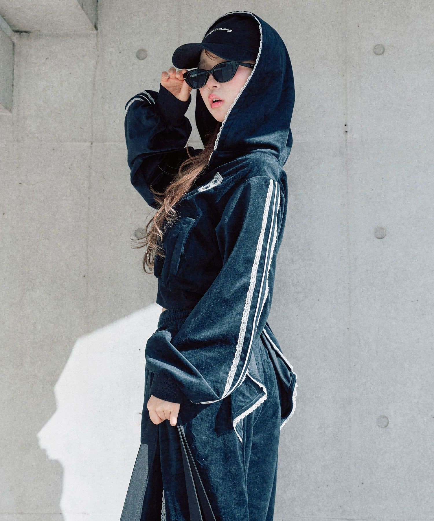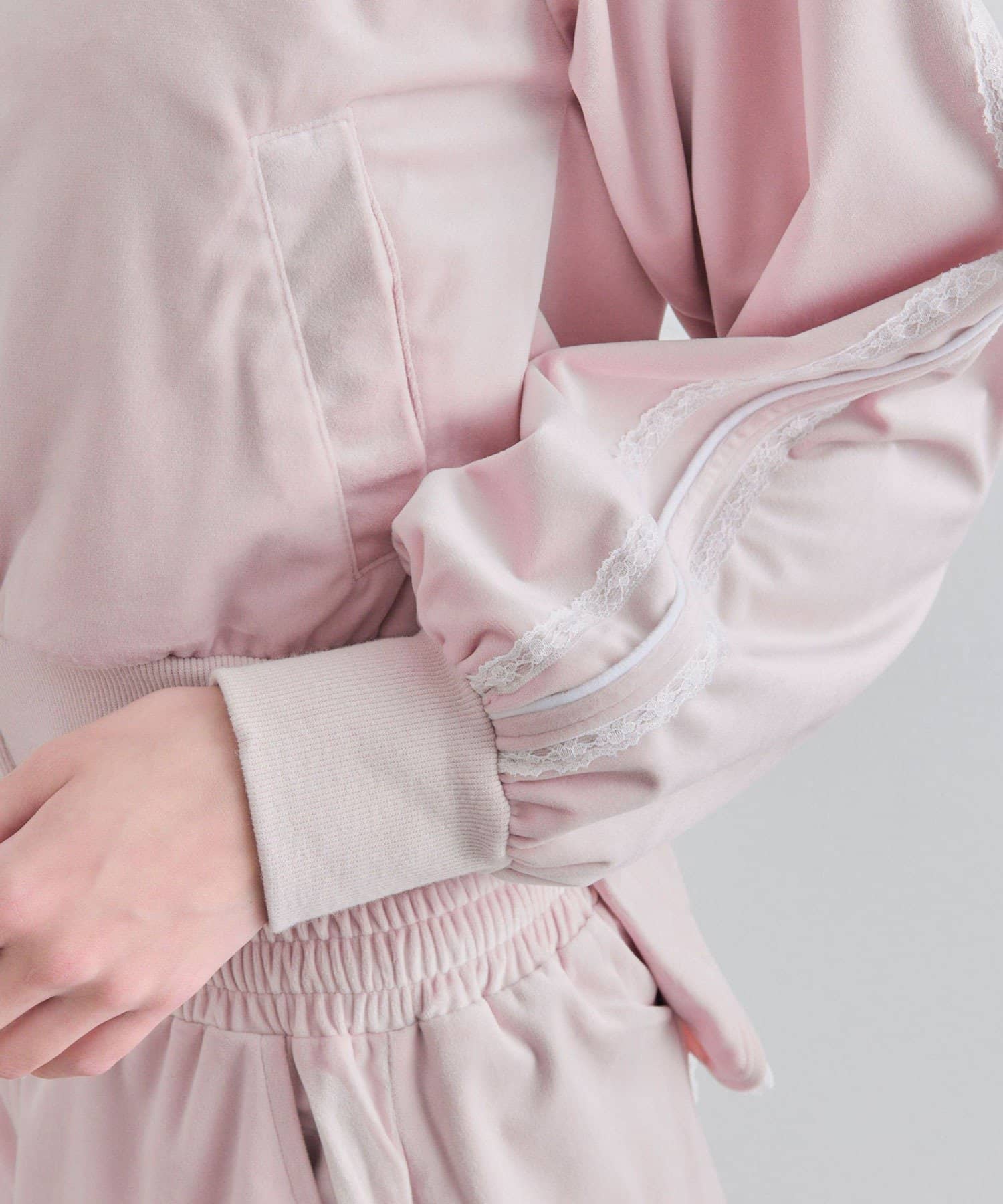 ・袖やフードの縁、胸元のロゴにレースを施し、カジュアルアイテムながら甘さもあるデザイン。