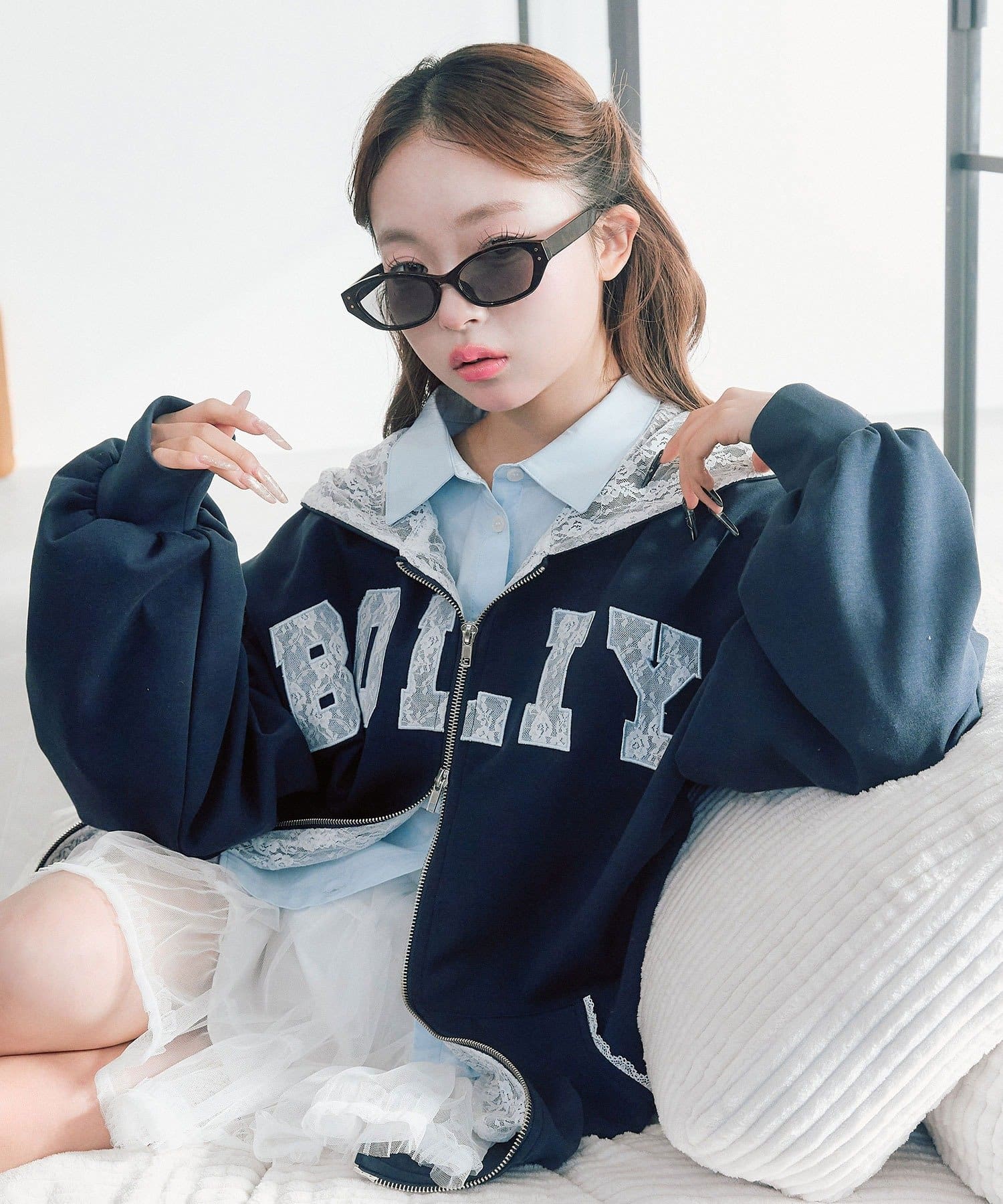・カジュアルなアイテムにレースでガーリー要素を取り入れたデザイン。