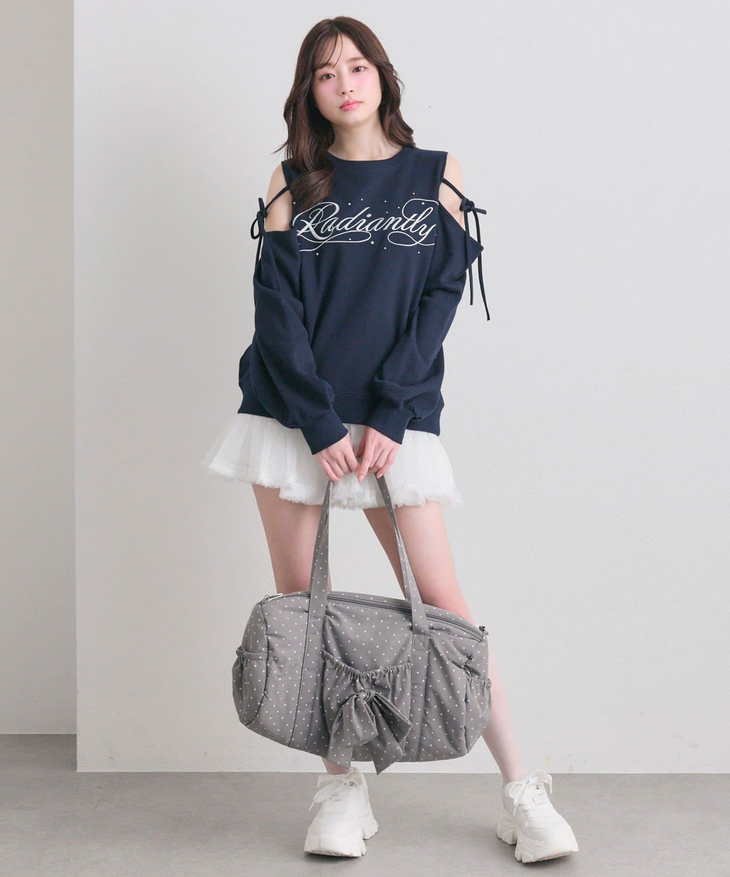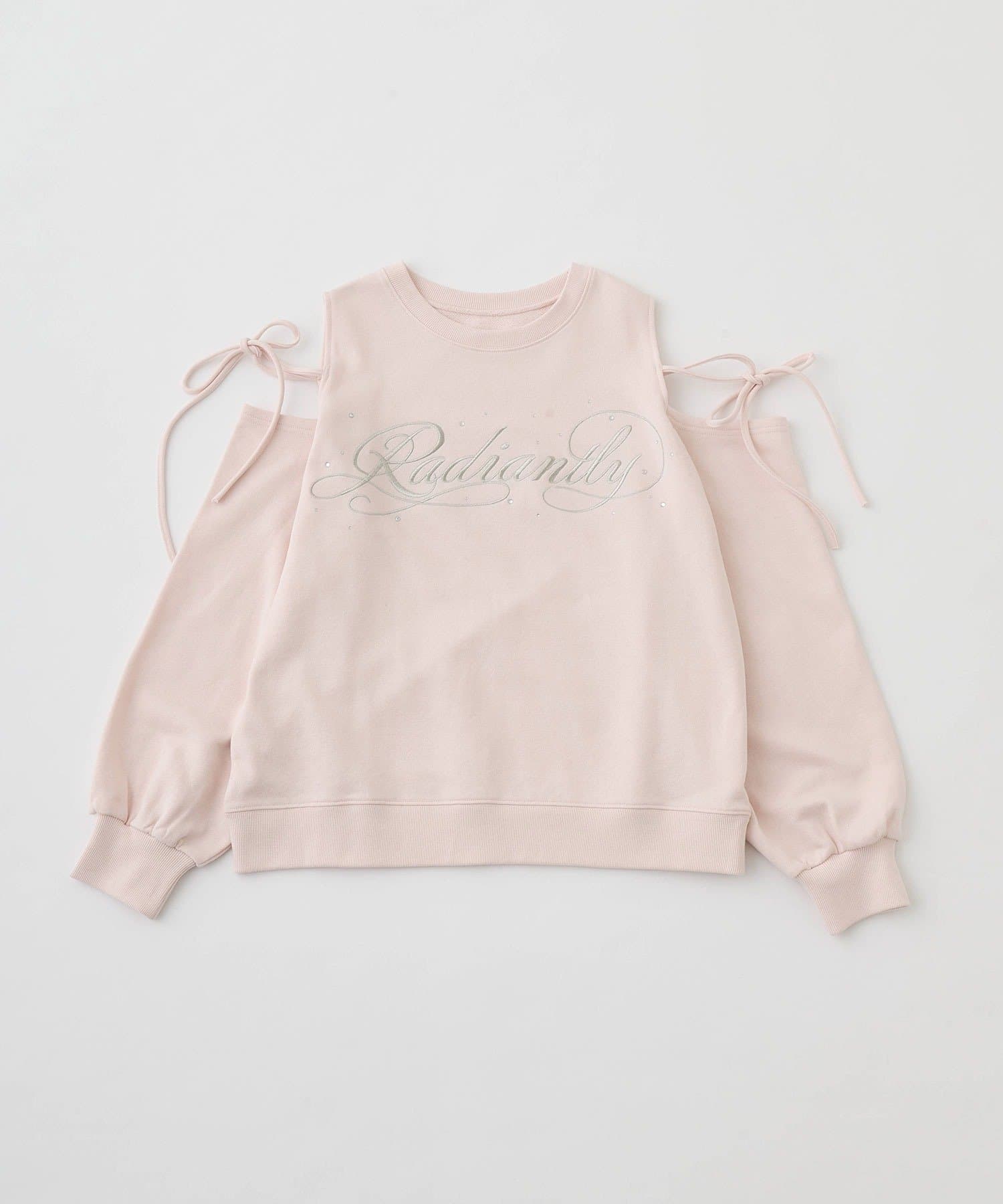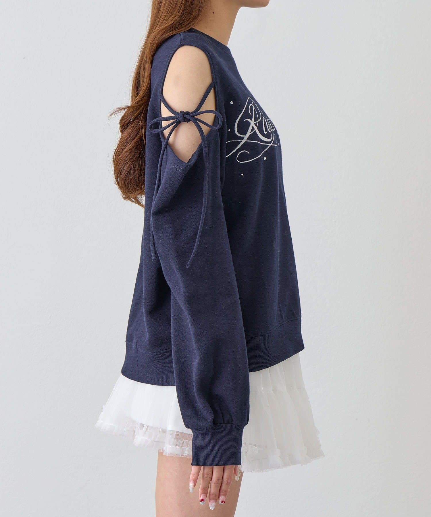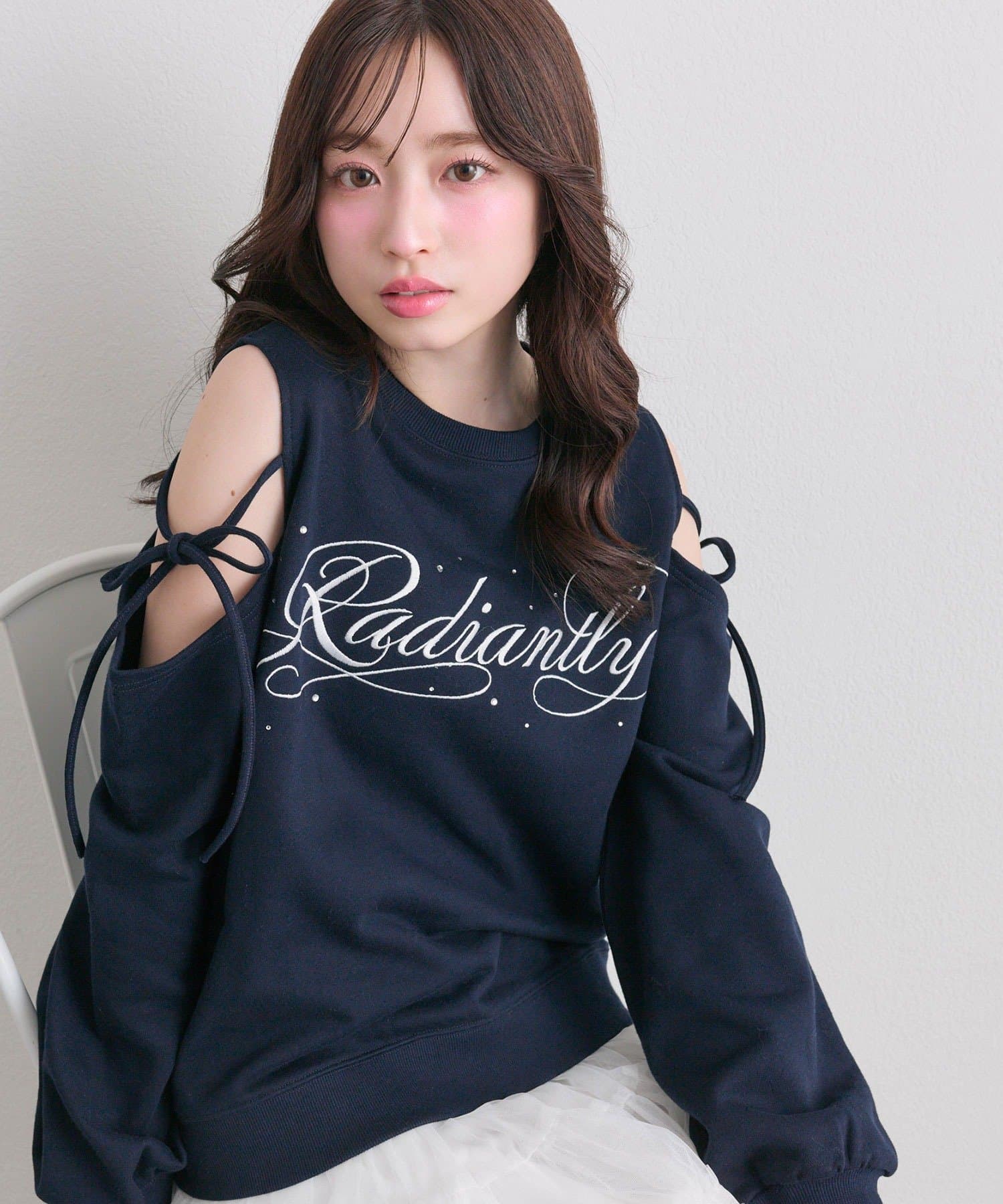 ・キラキラのストーンや肩のリボンが、カジュアルの中に女の子らしい甘さをプラスします。