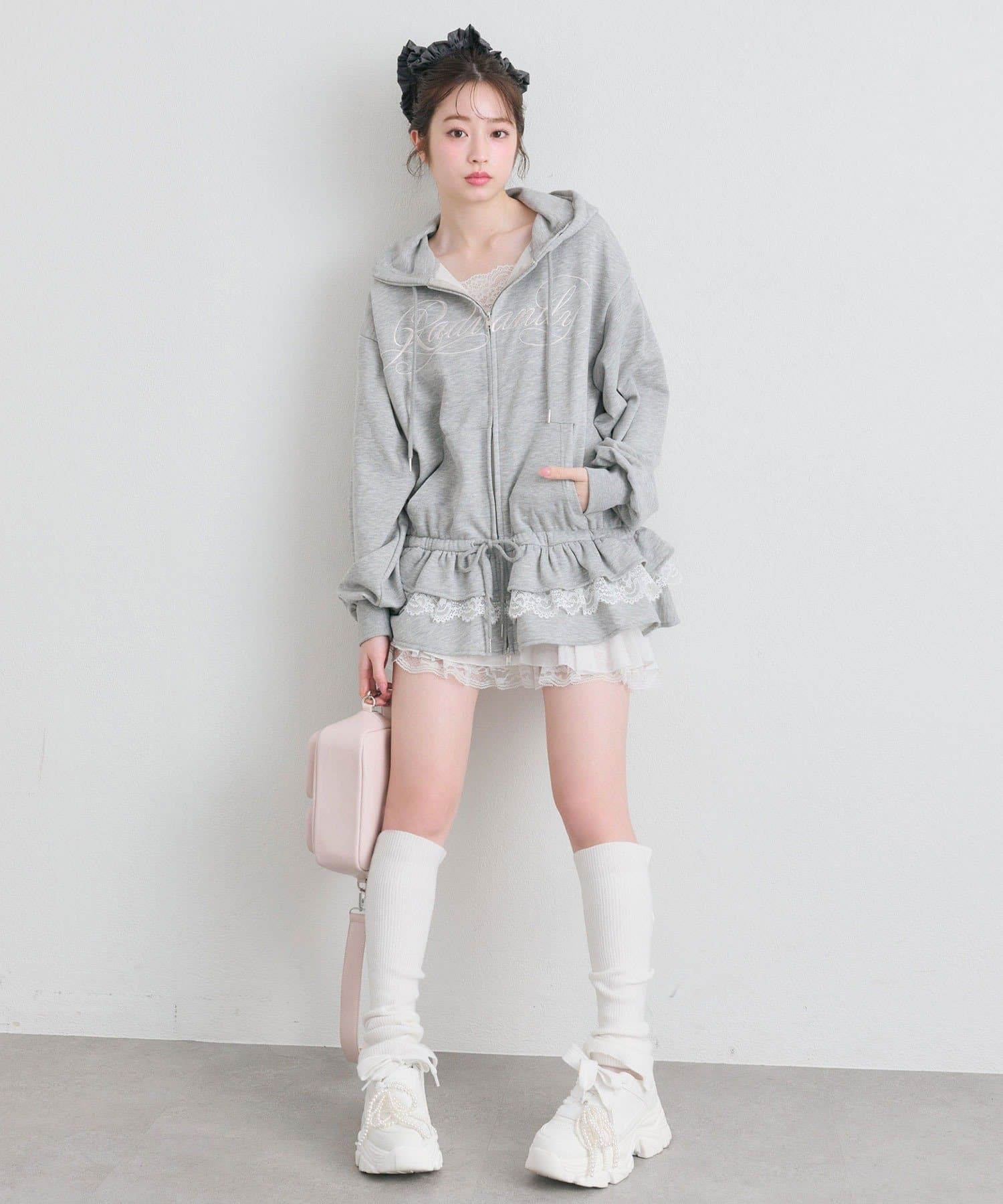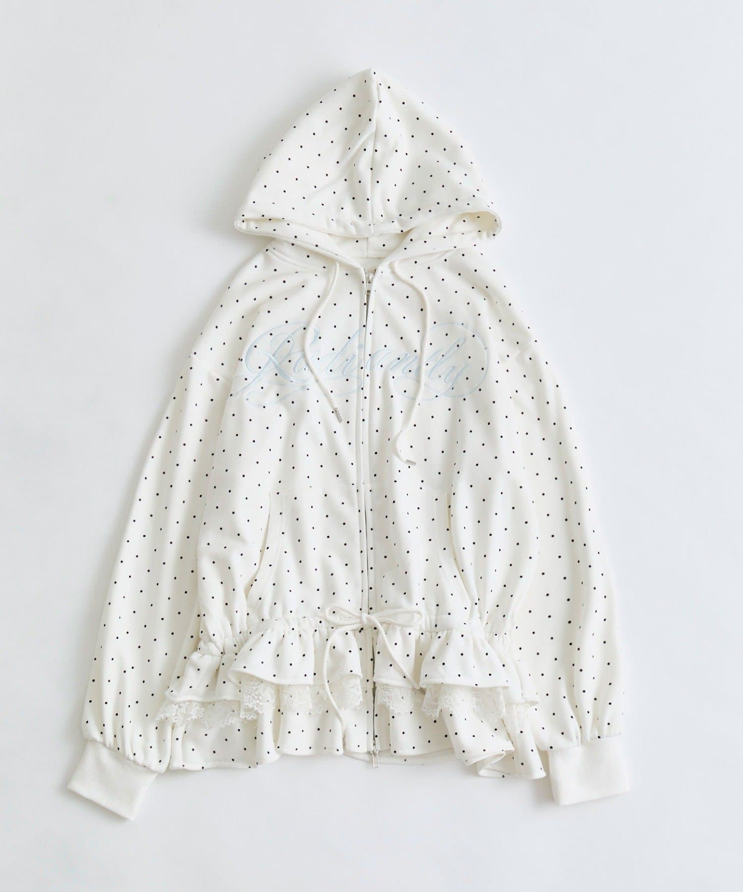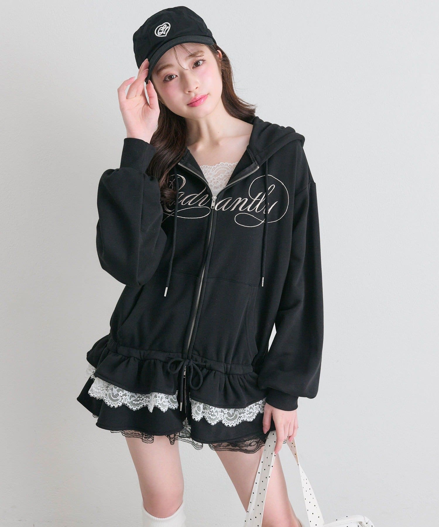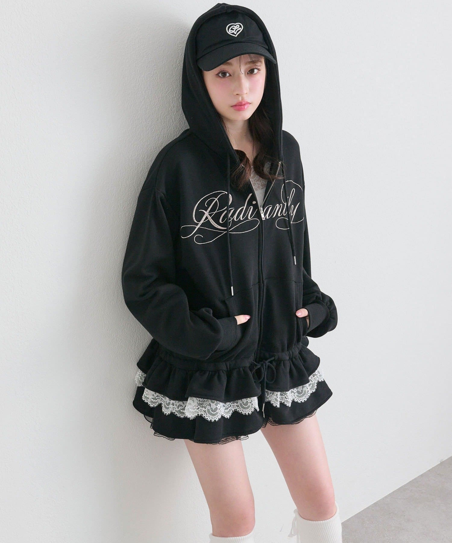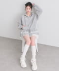 ・カジュアルなZIPパーカーに、裾フリルをプラスしたガーリーデザイン。