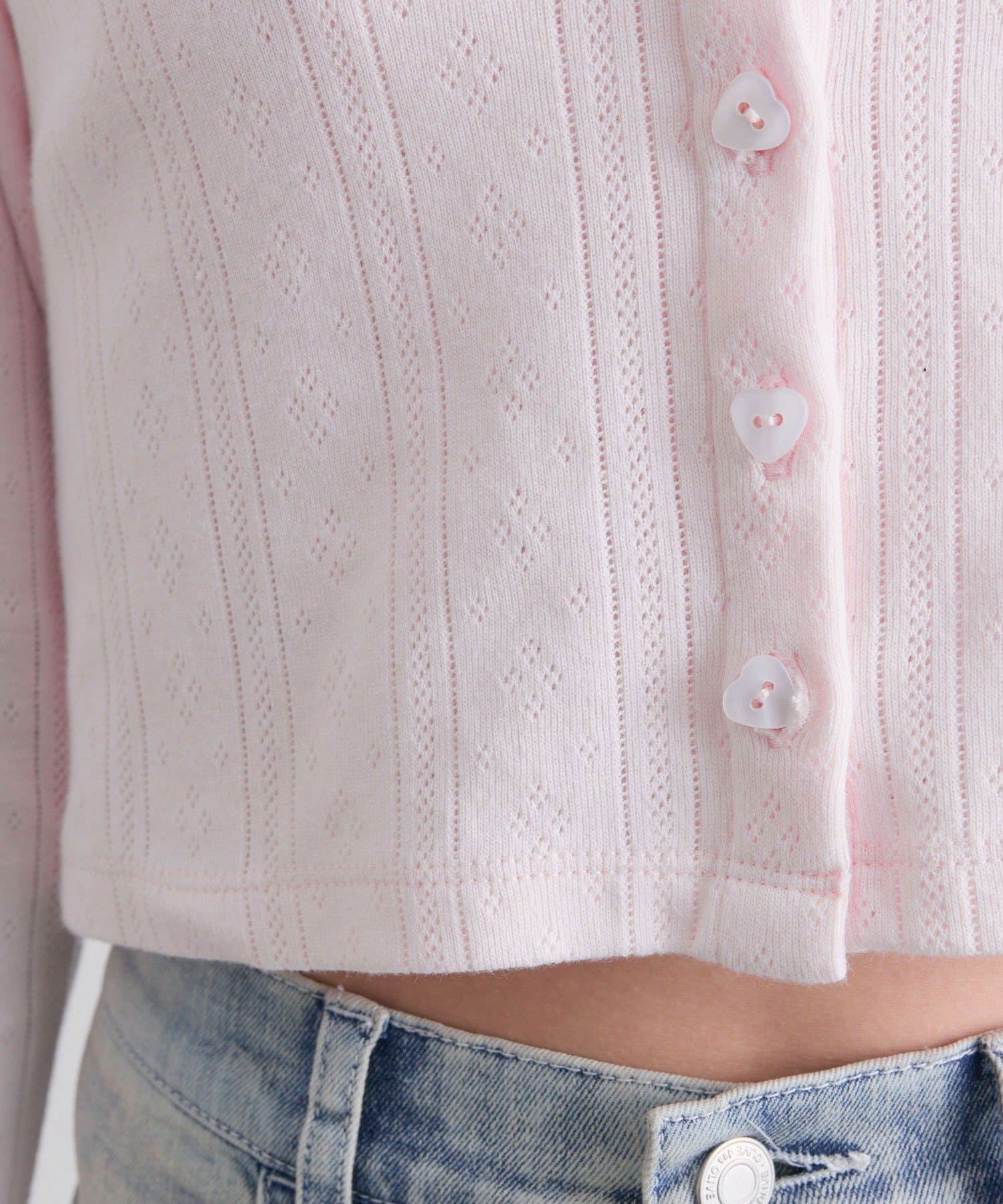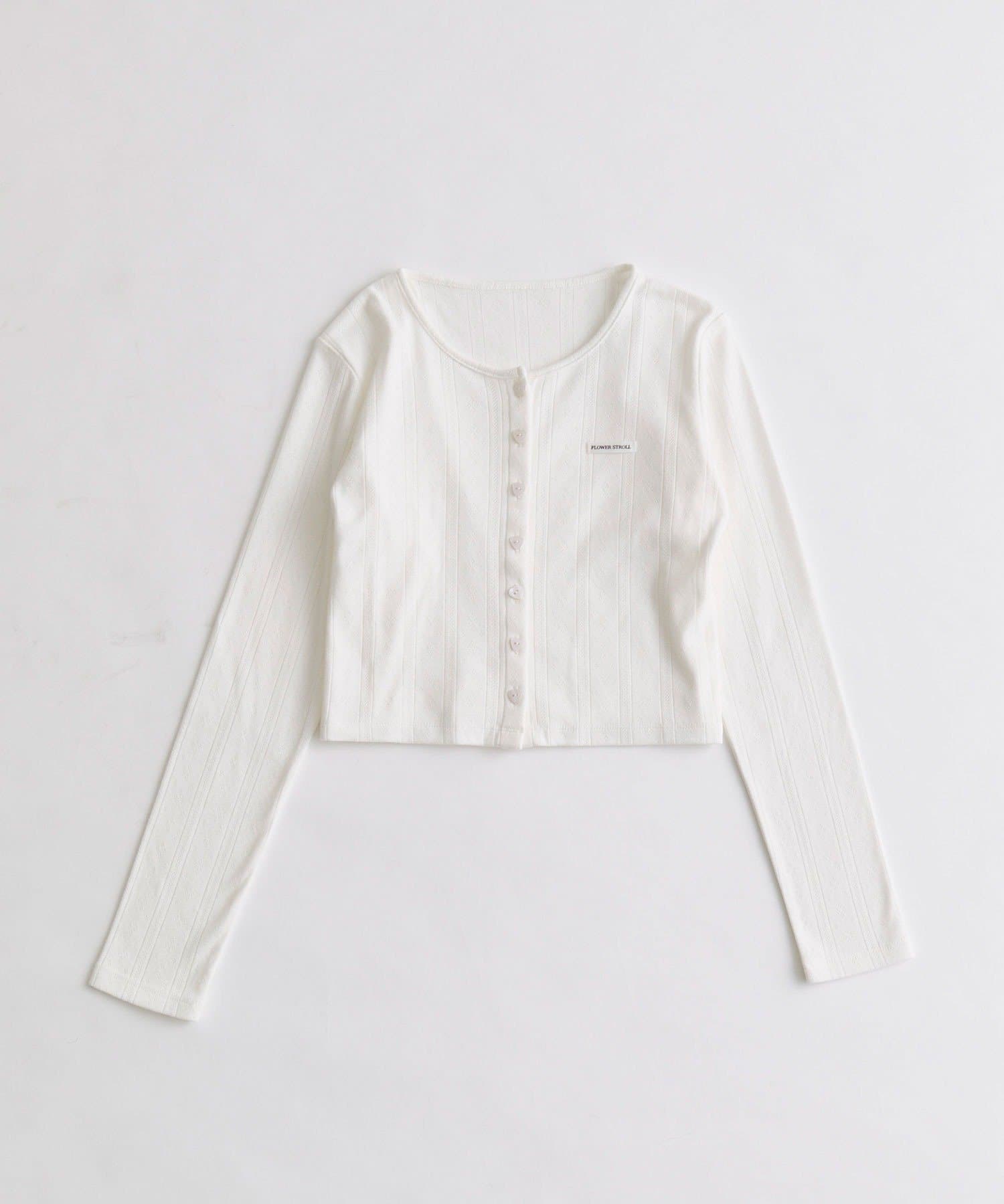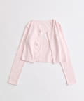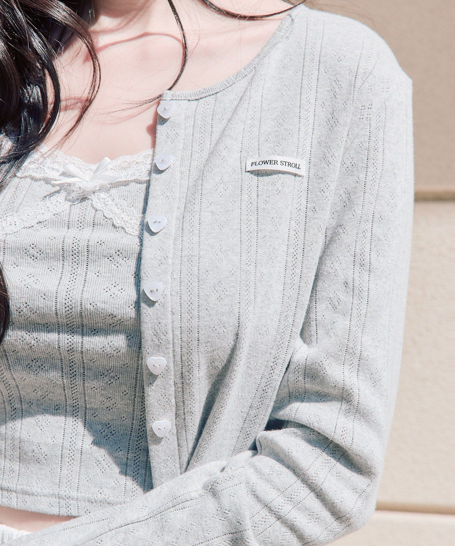 ・カーデのボタンはハート型でさりげないアクセントになり、甘さをプラスします。
