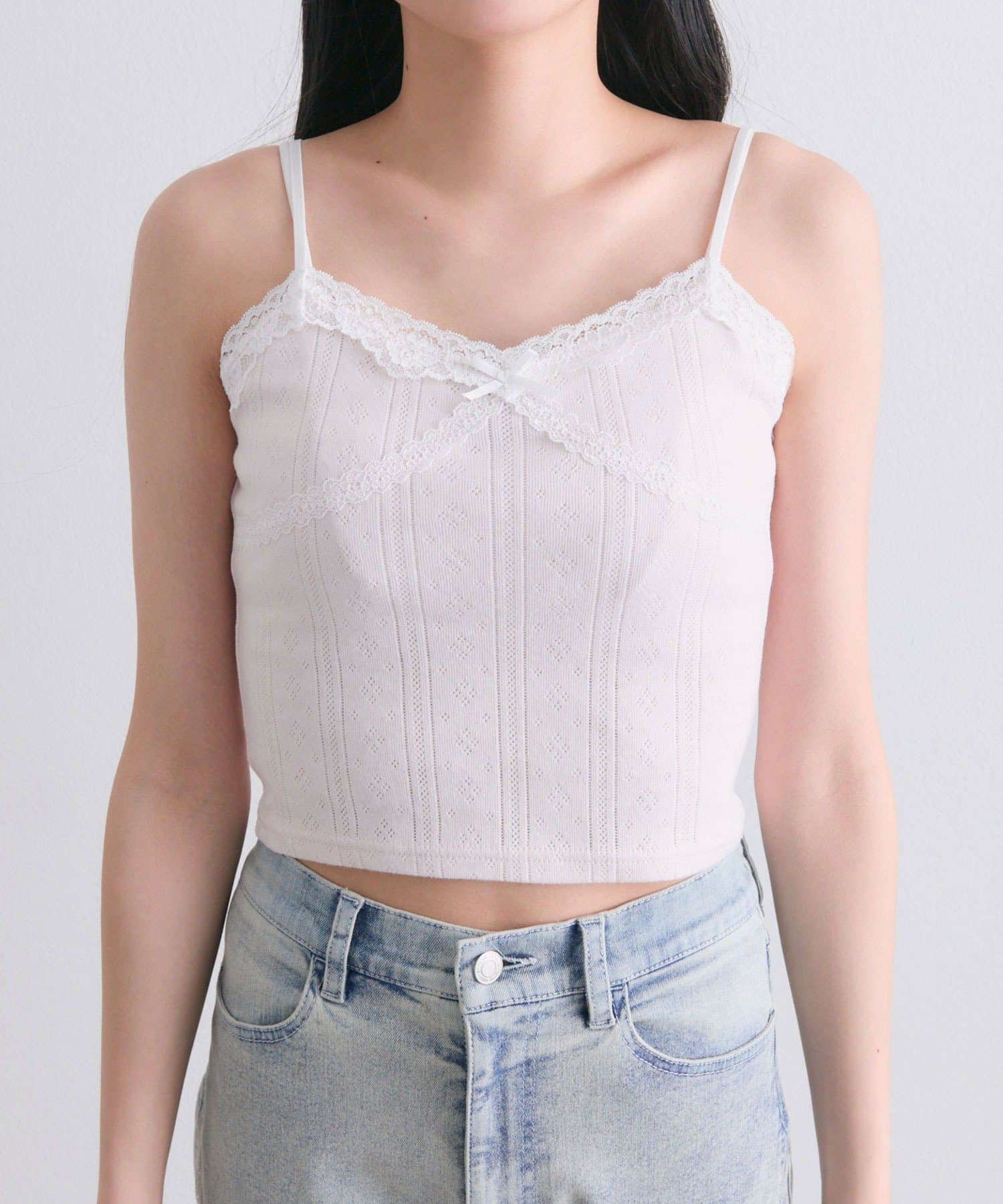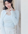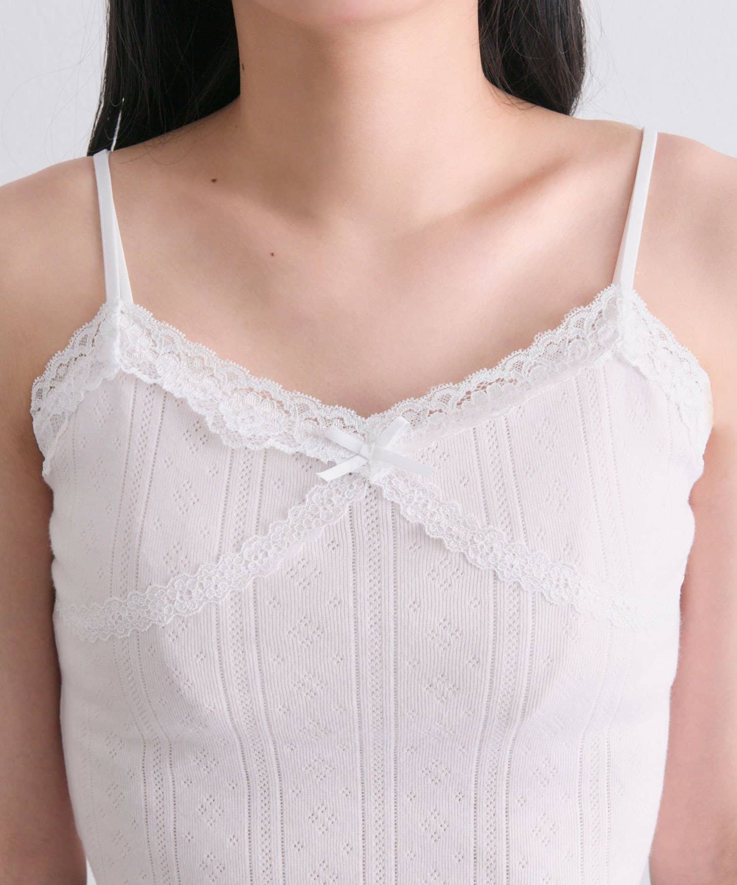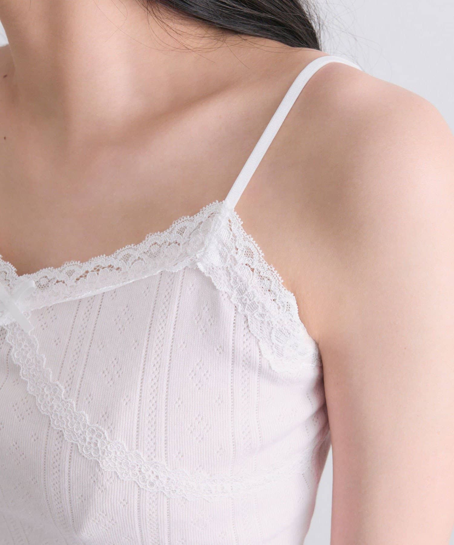 ・繊細な透かし編みのカーディガンと、レースたっぷりのキャミソールがセットになったアイテム。