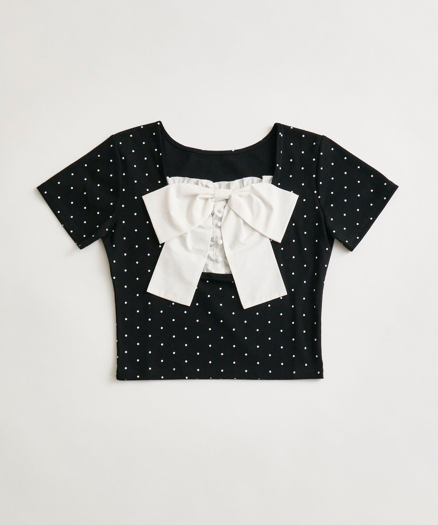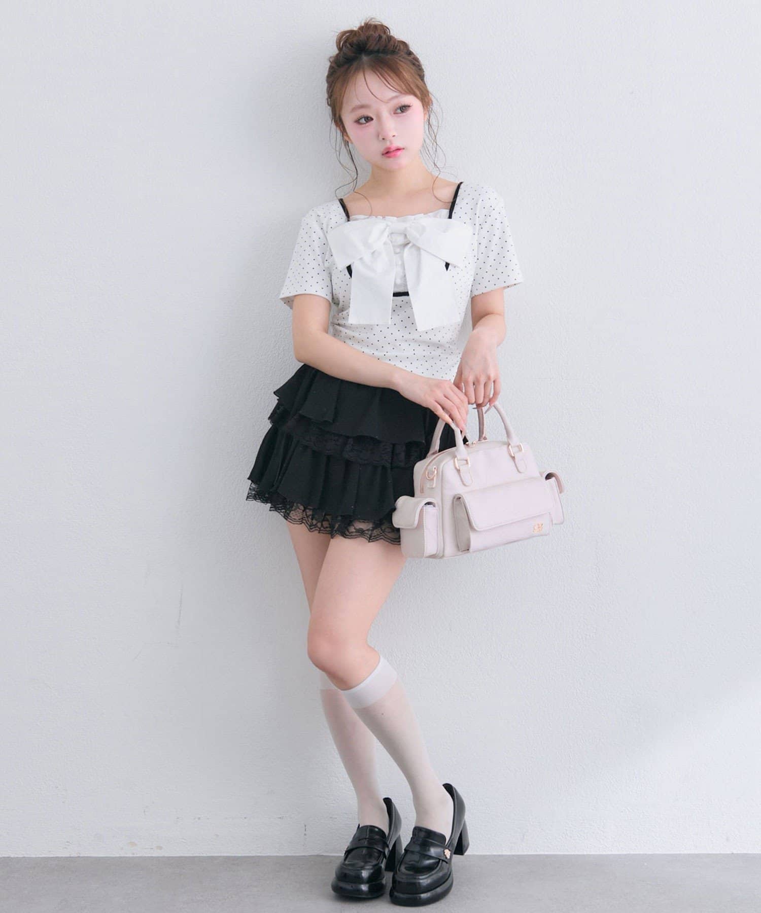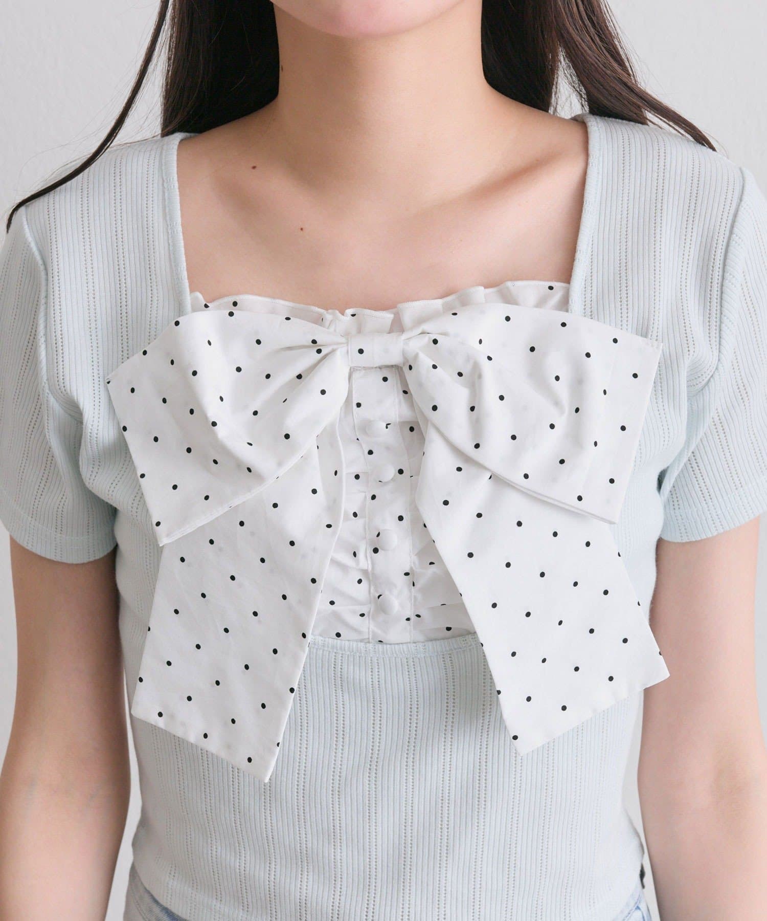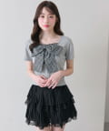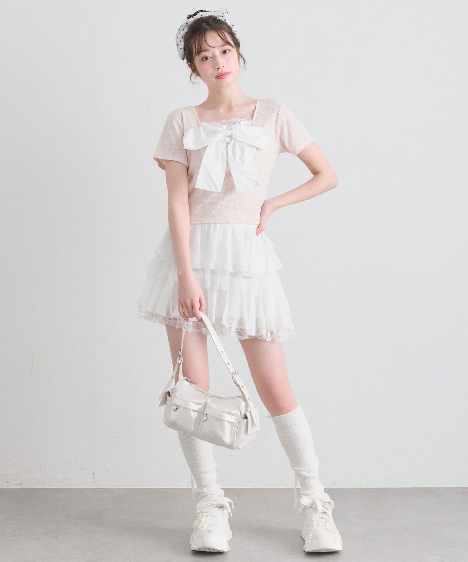 ・存在感たっぷりなリボンとレイヤード見えする異素材の組み合わせがかわいいデザイン。
