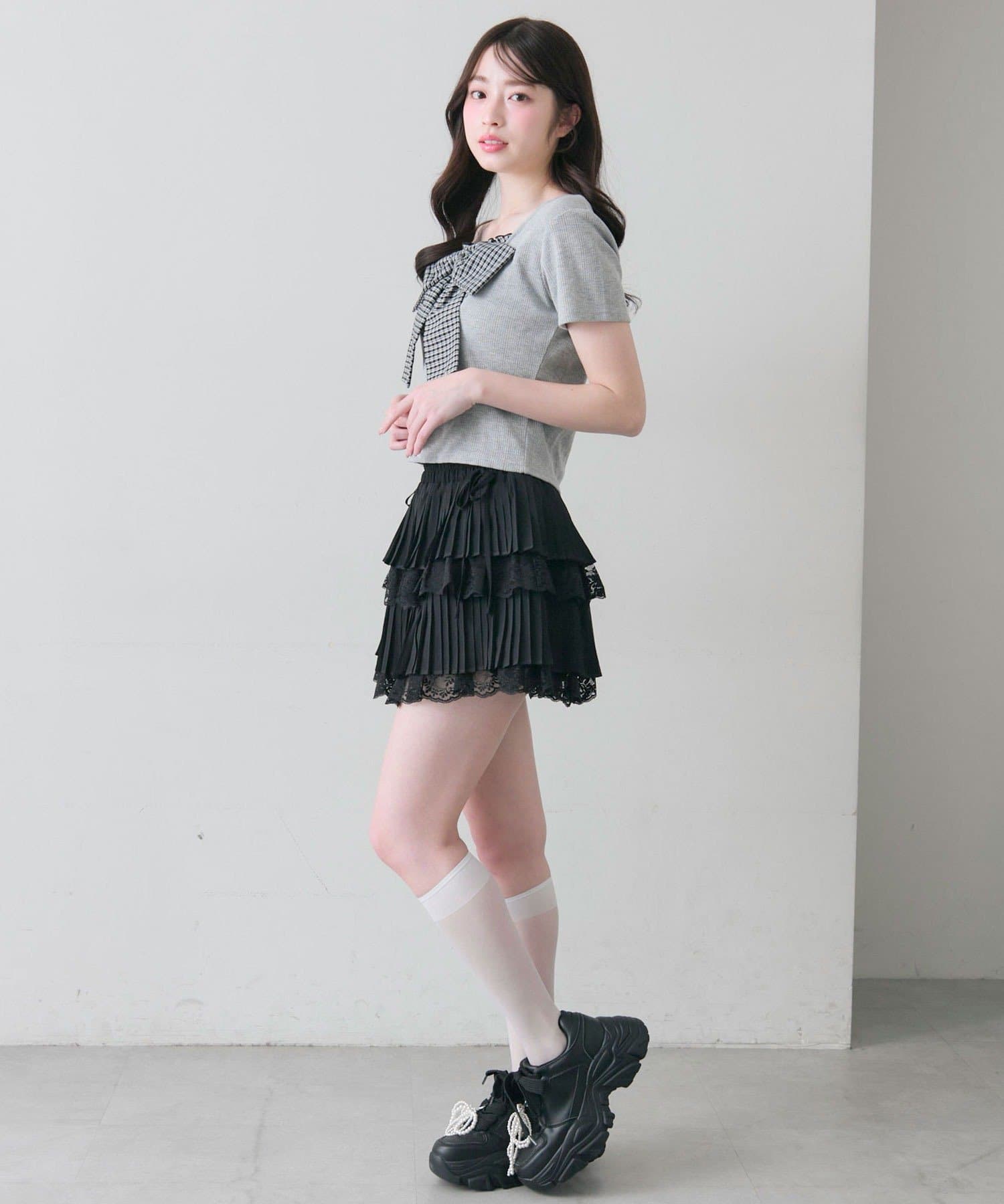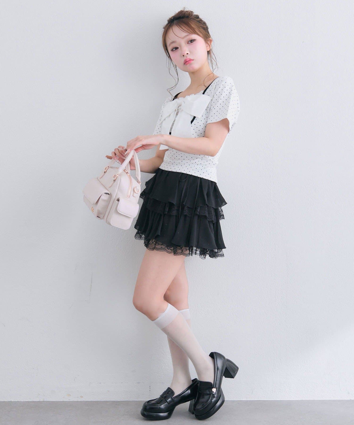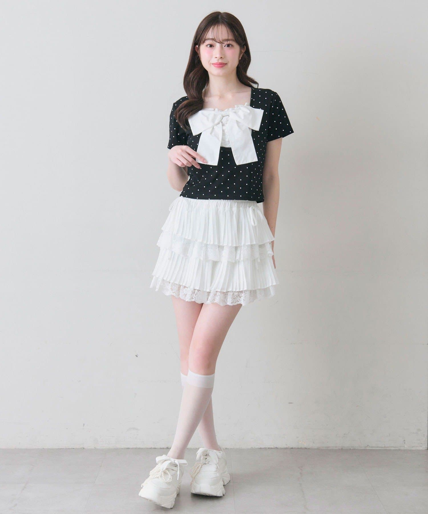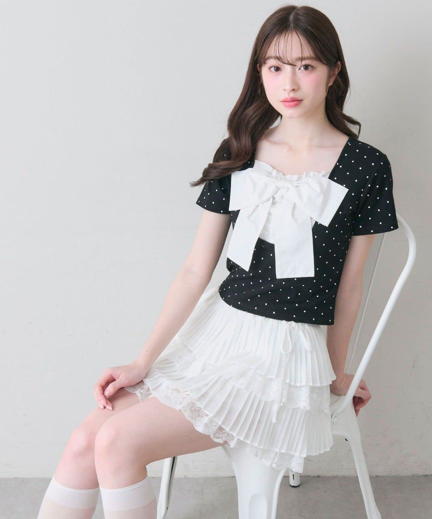 ・存在感たっぷりなリボンとレイヤード見えする異素材の組み合わせがかわいいデザイン。