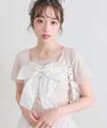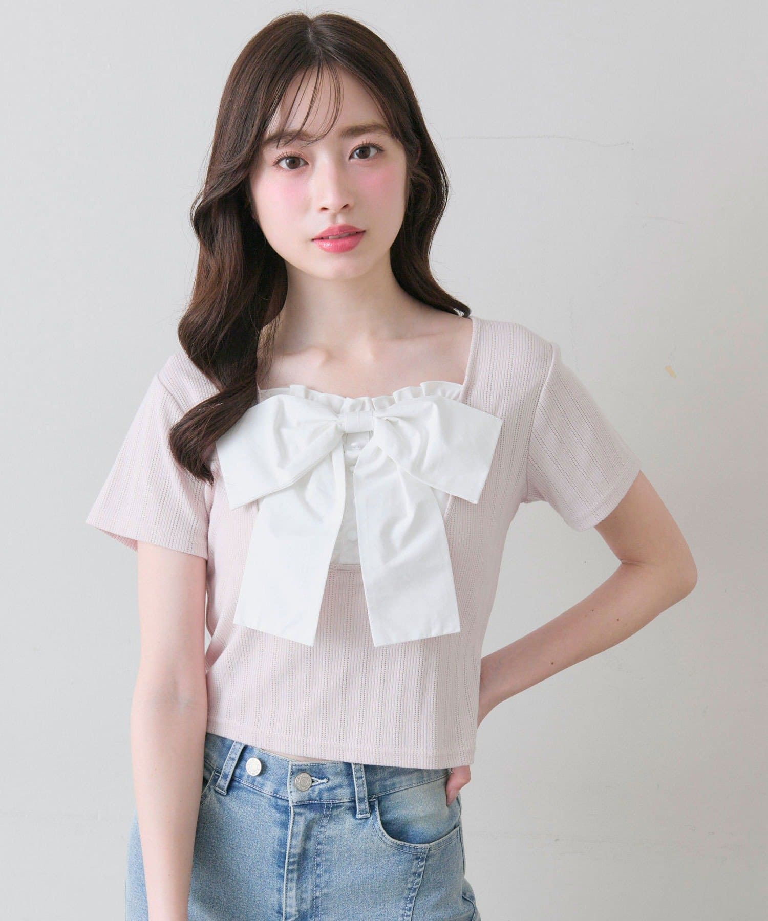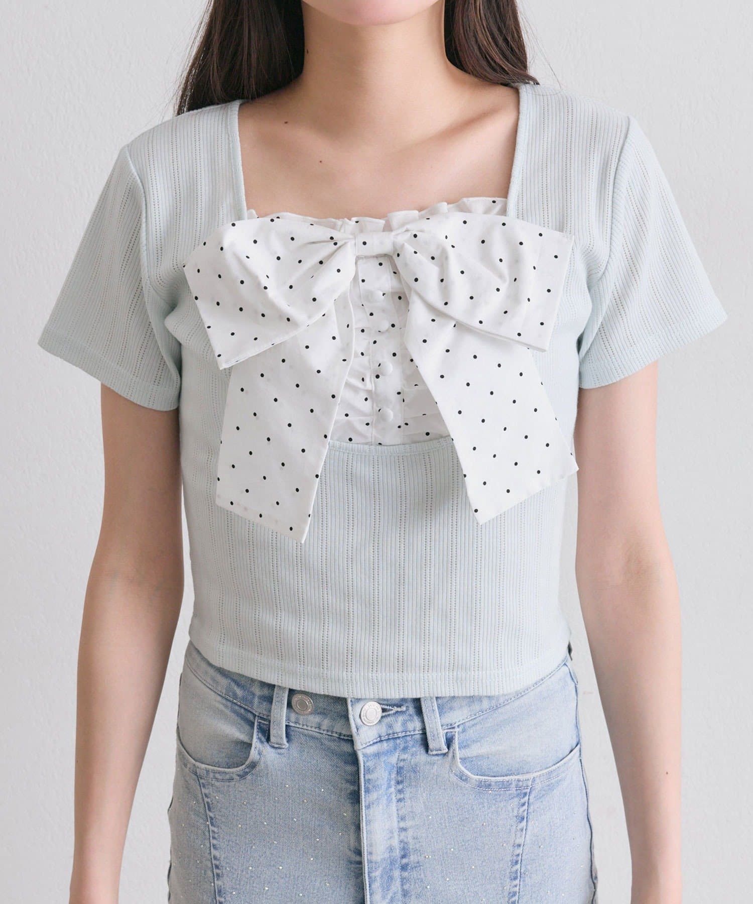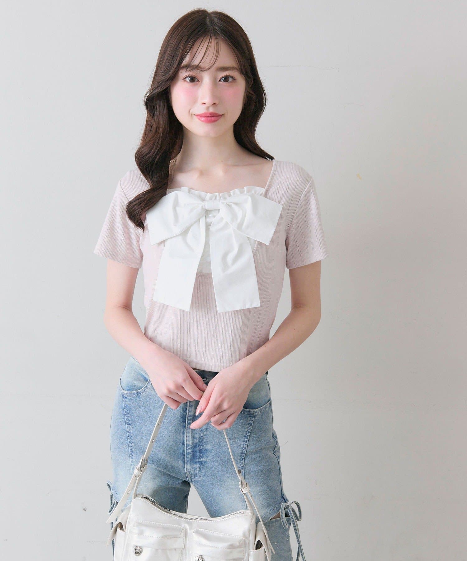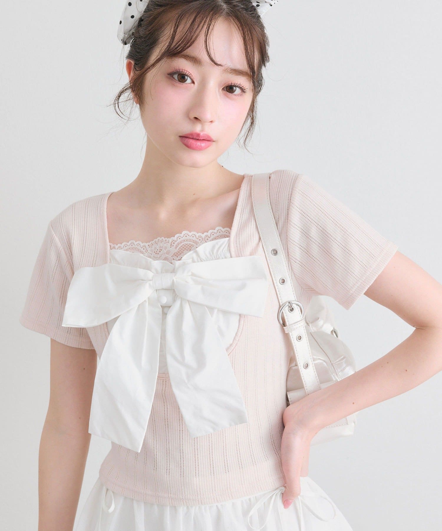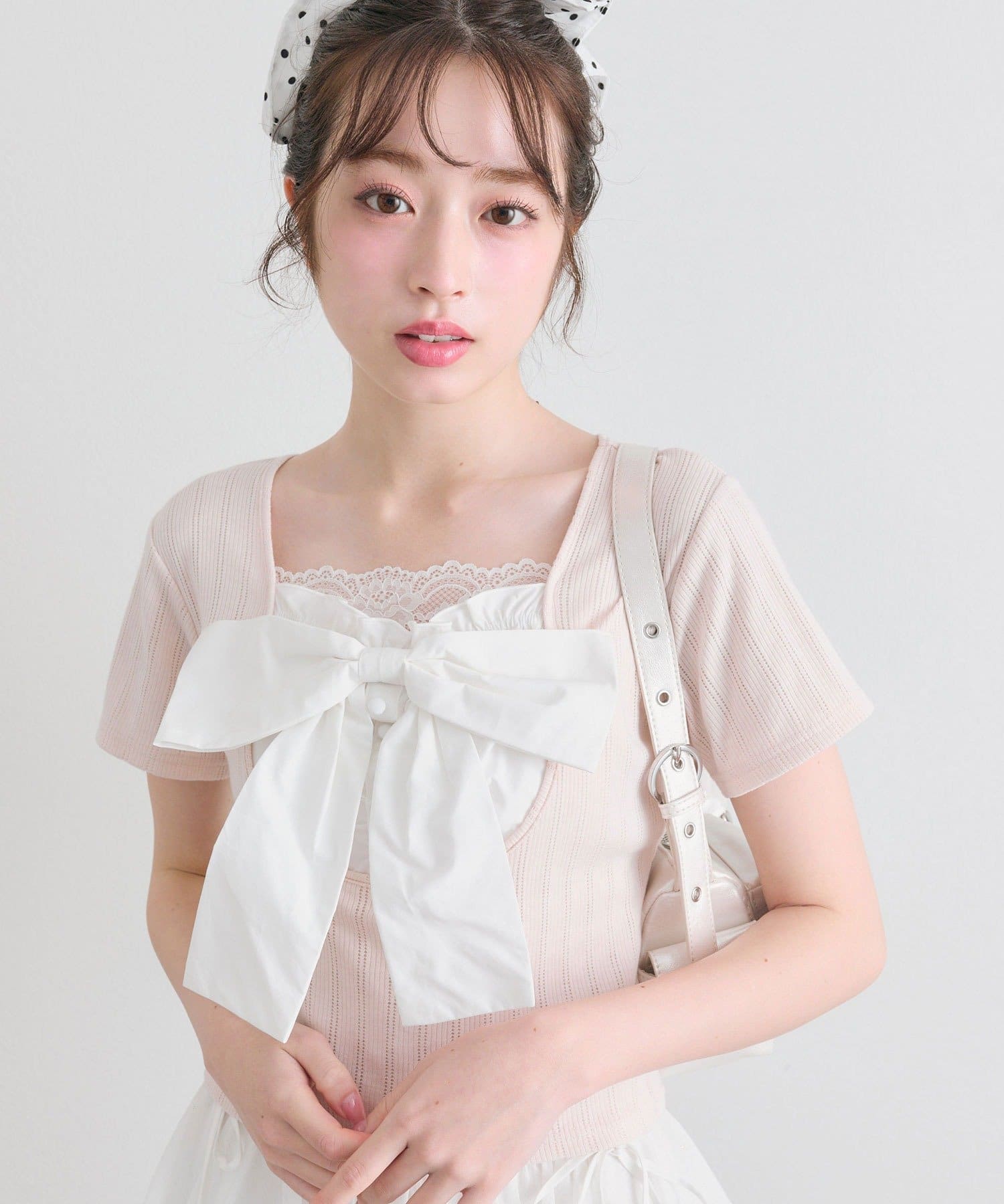 ・存在感たっぷりなリボンとレイヤード見えする異素材の組み合わせがかわいいデザイン。