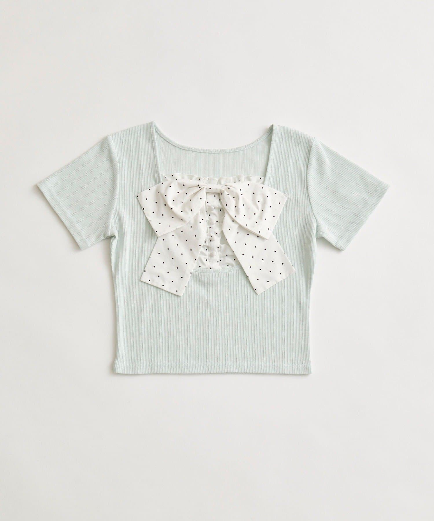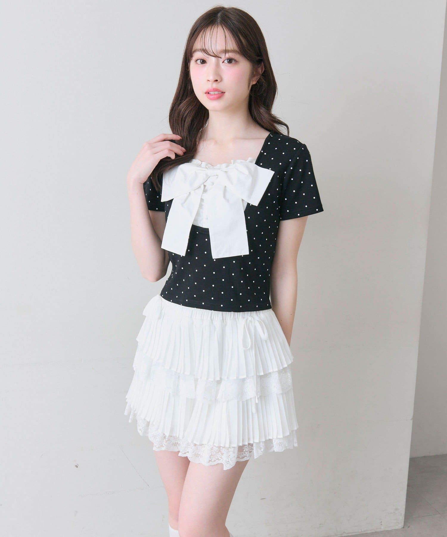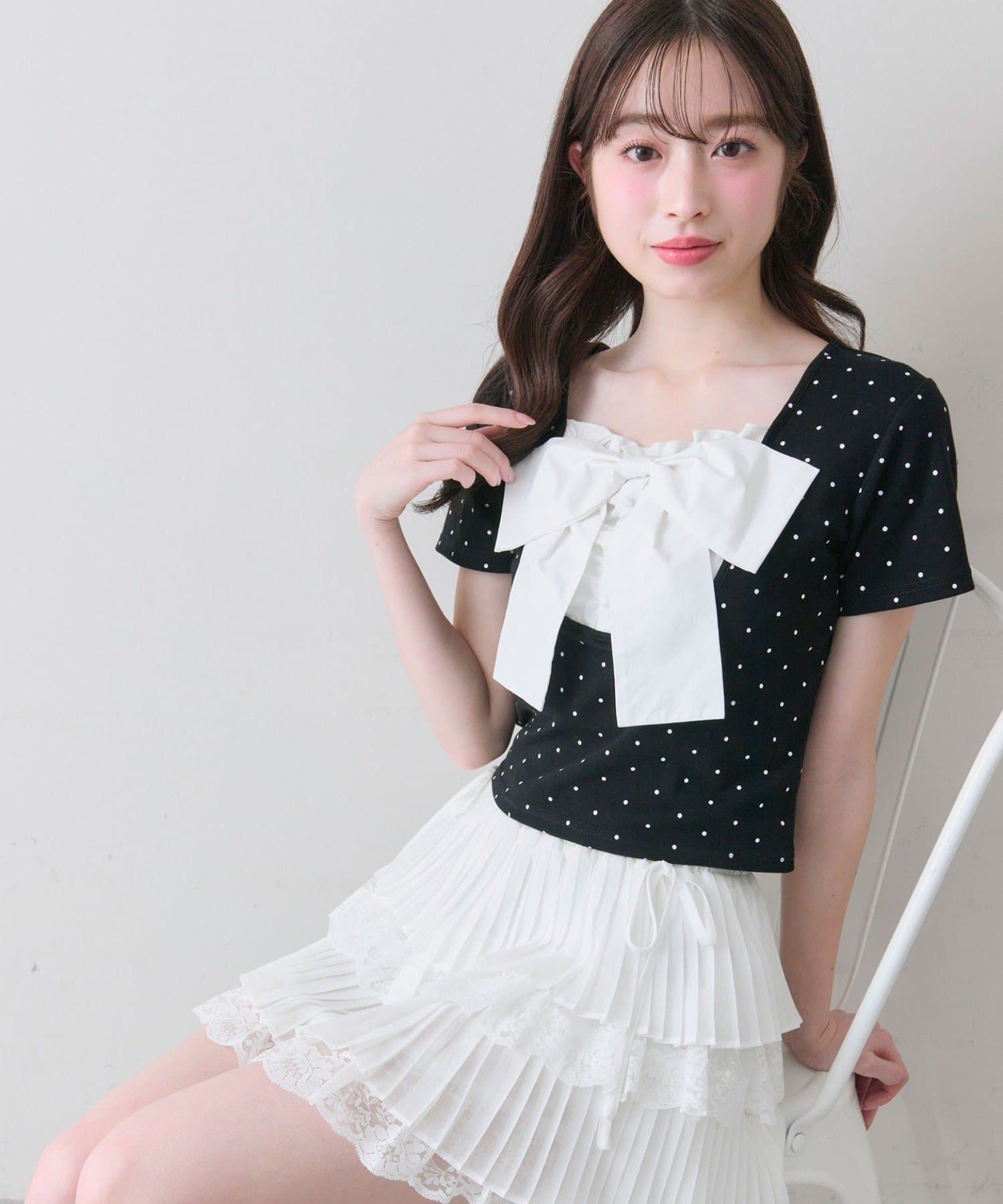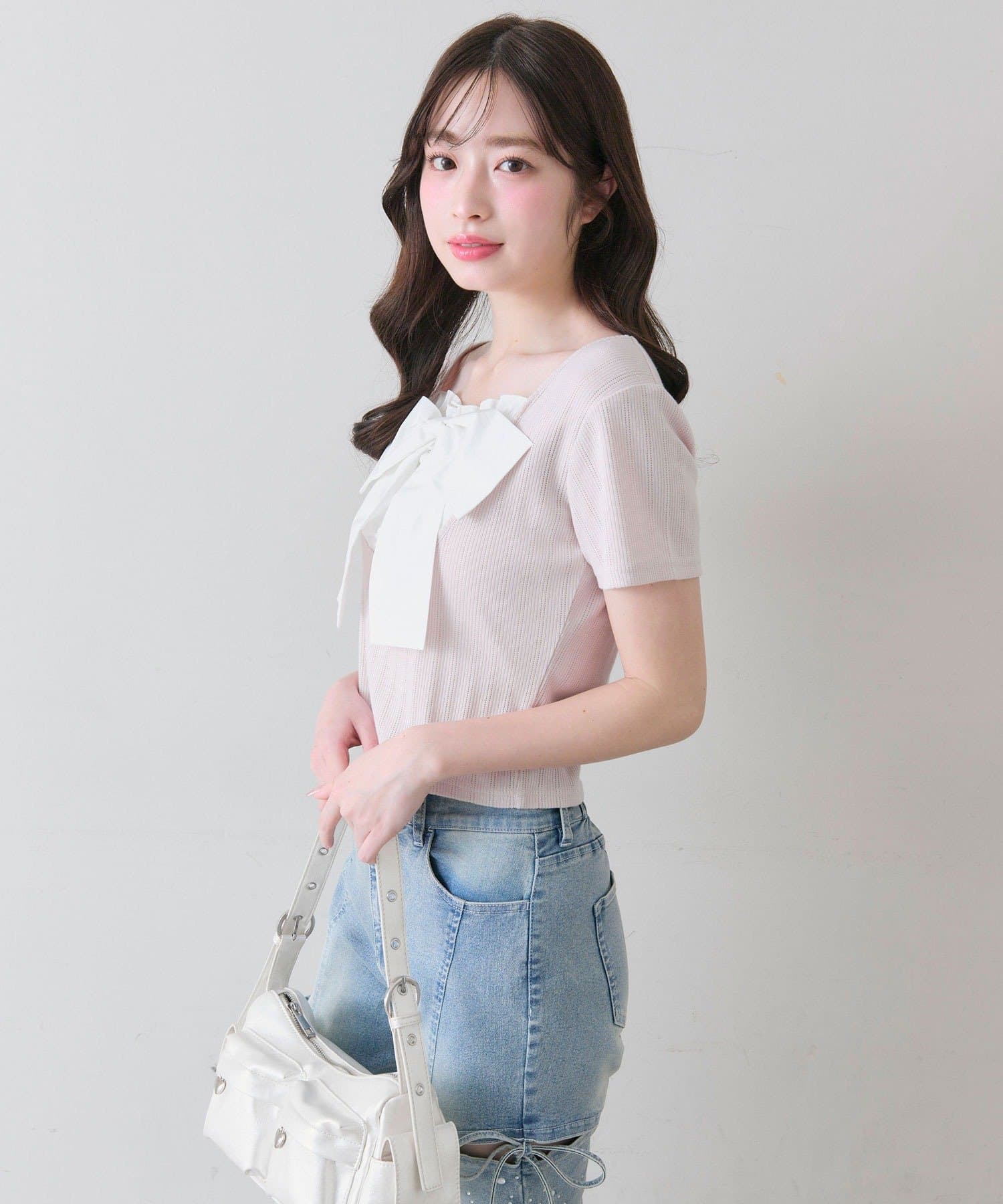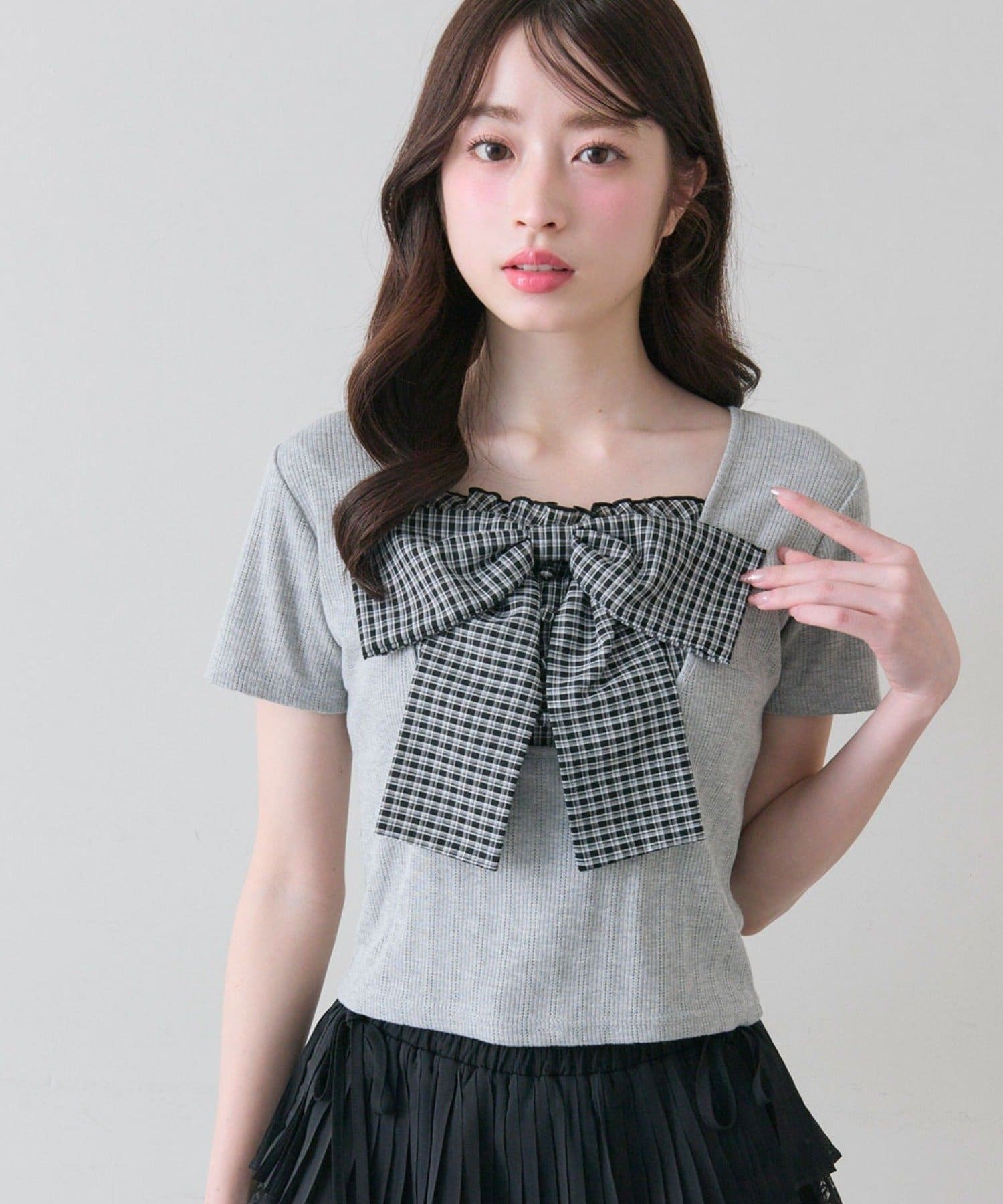 ・存在感たっぷりなリボンとレイヤード見えする異素材の組み合わせがかわいいデザイン。