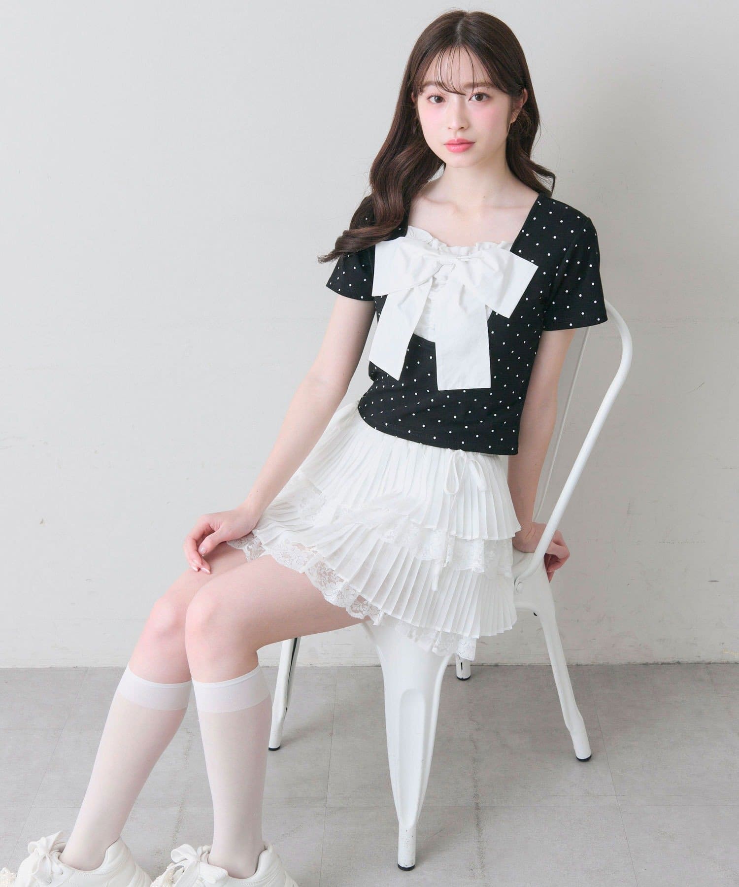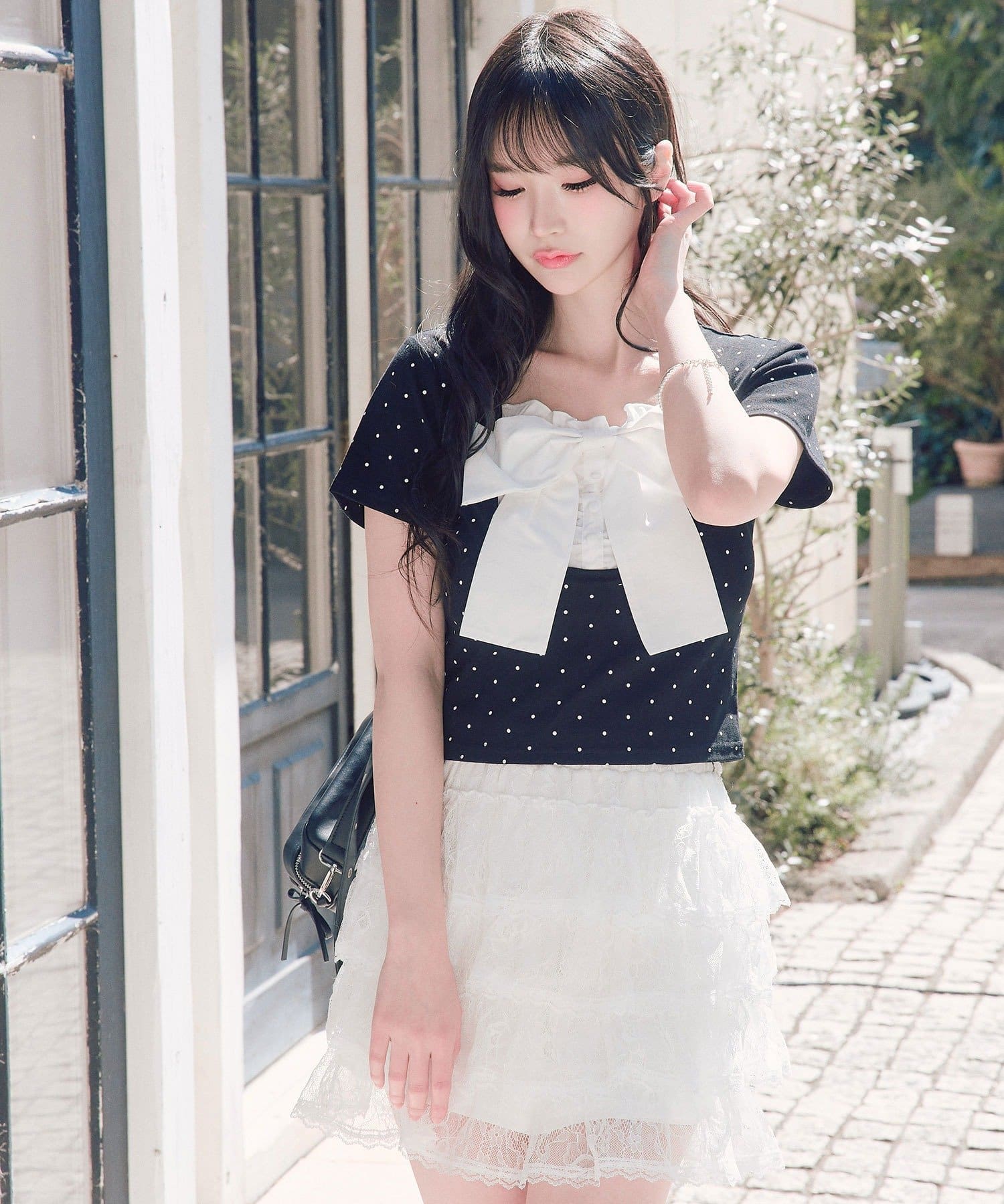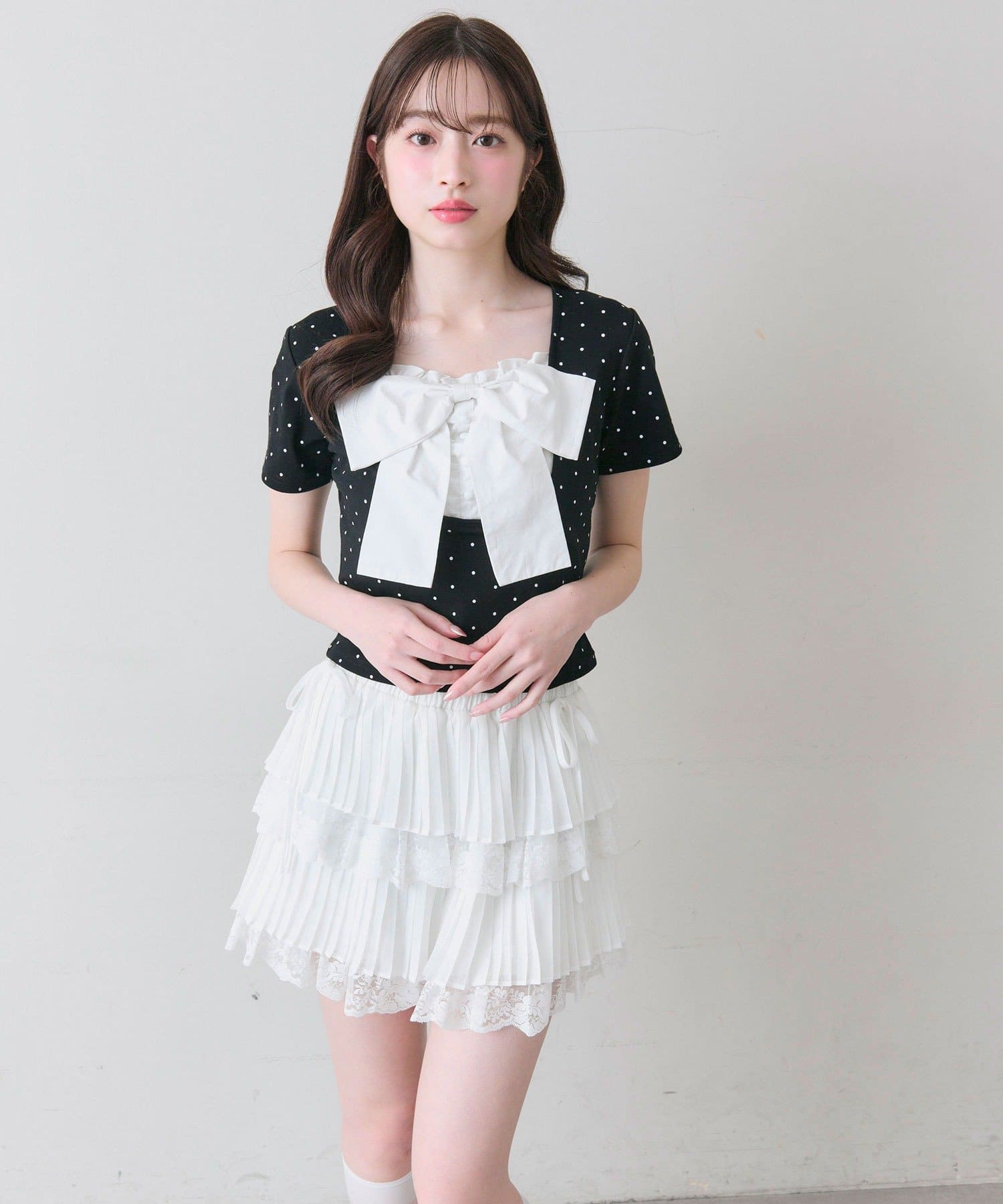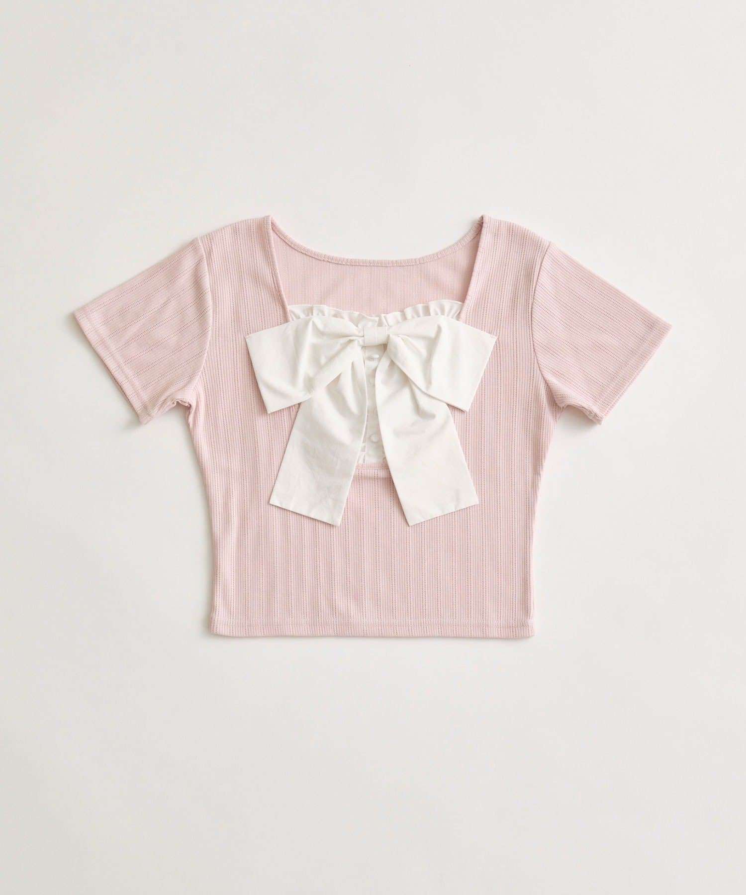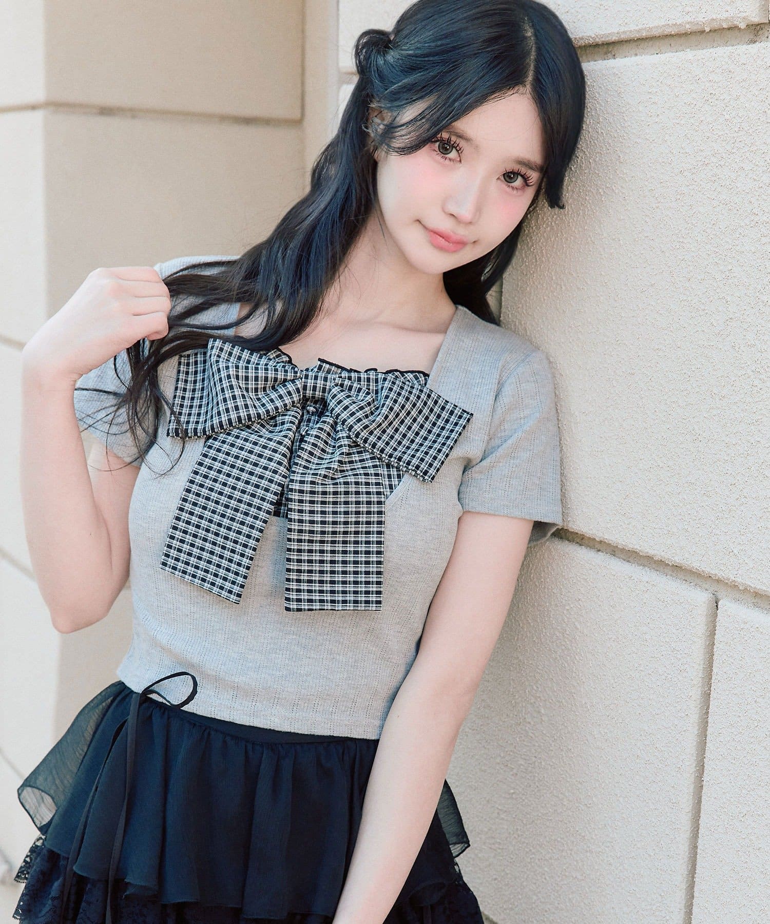 ・存在感たっぷりなリボンとレイヤード見えする異素材の組み合わせがかわいいデザイン。
