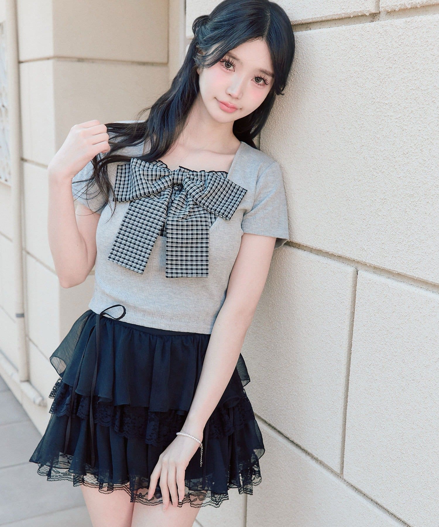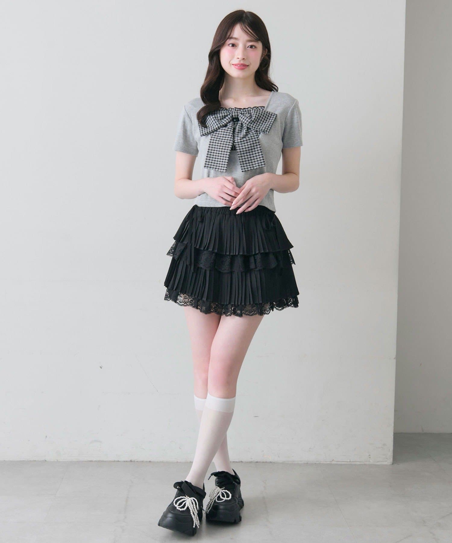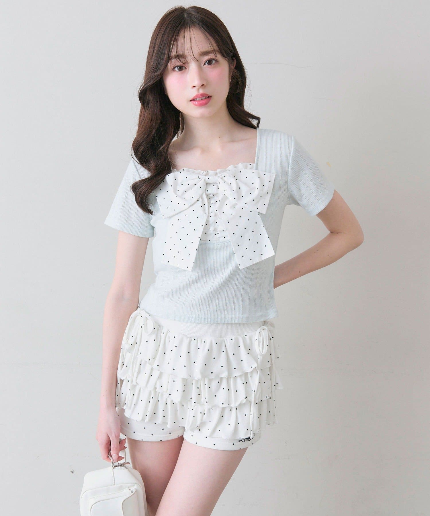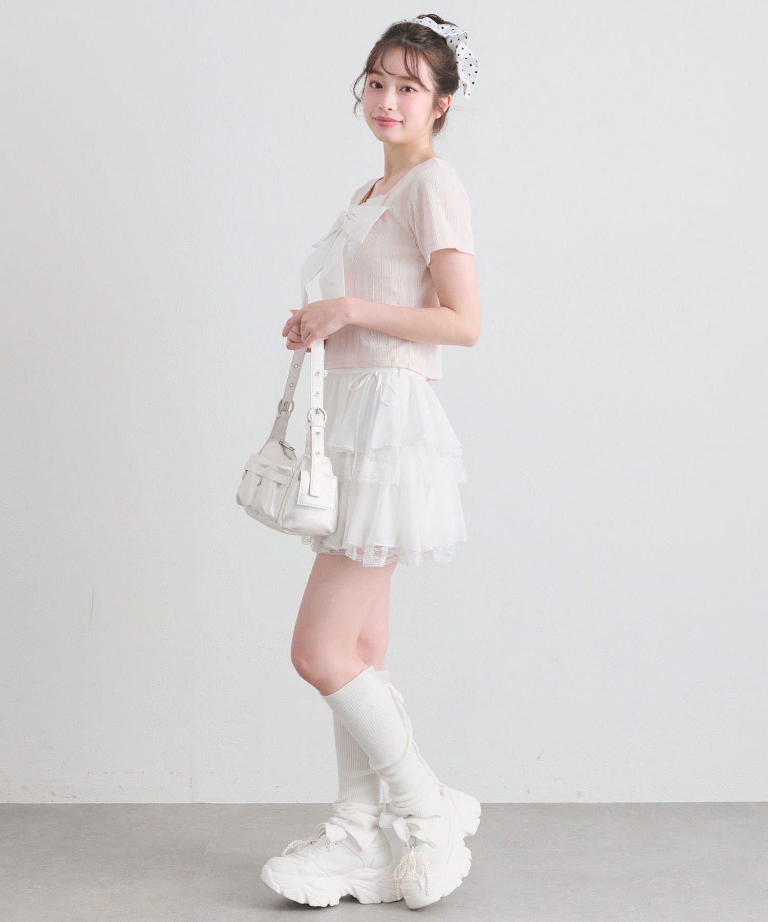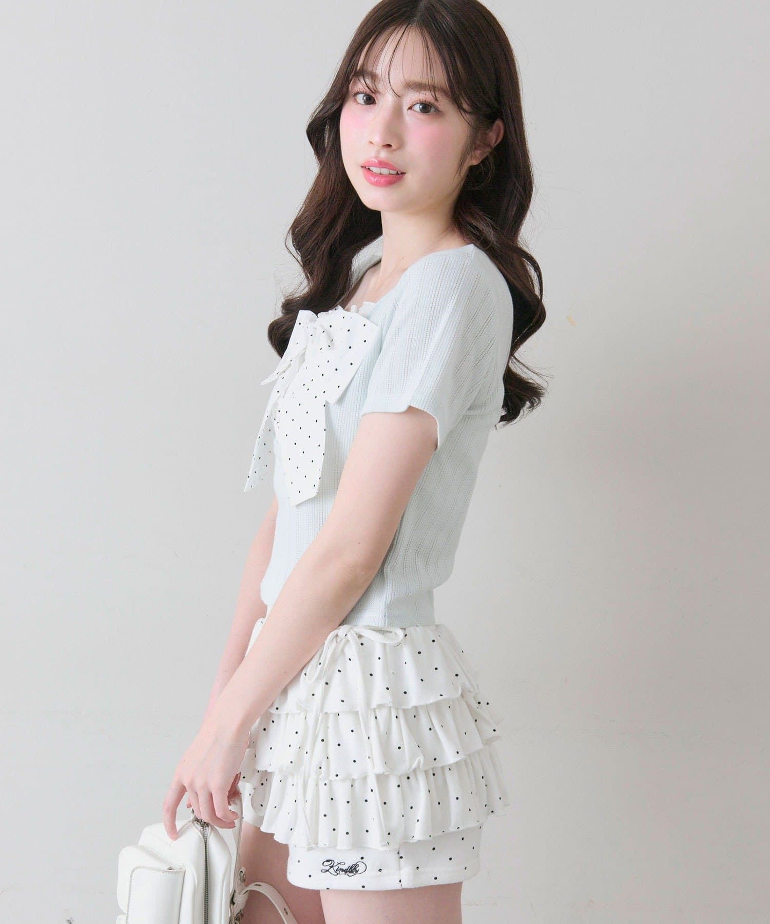 ・存在感たっぷりなリボンとレイヤード見えする異素材の組み合わせがかわいいデザイン。