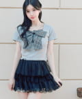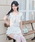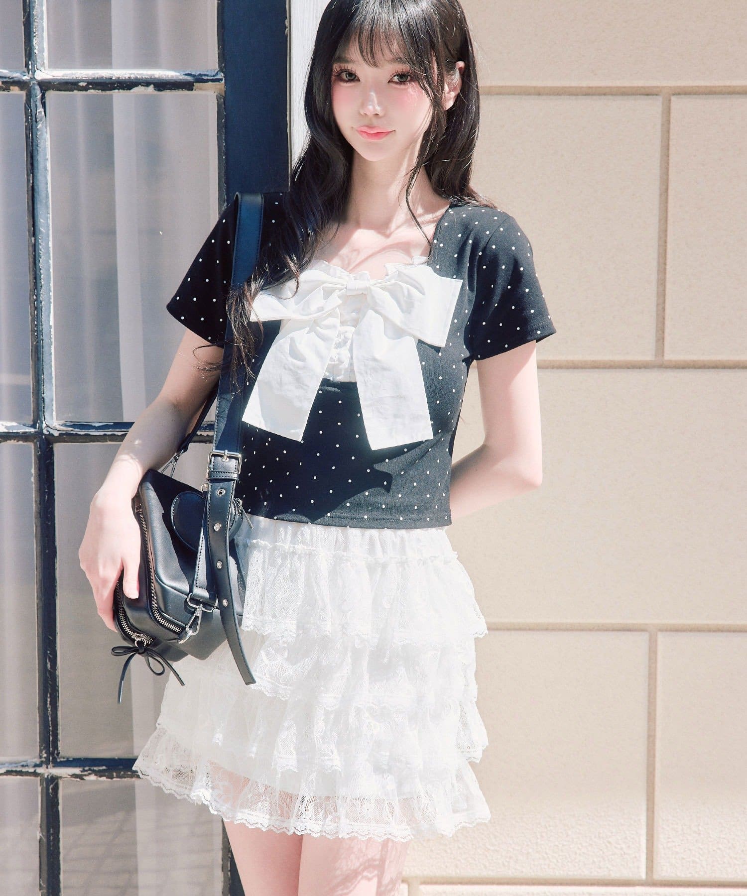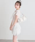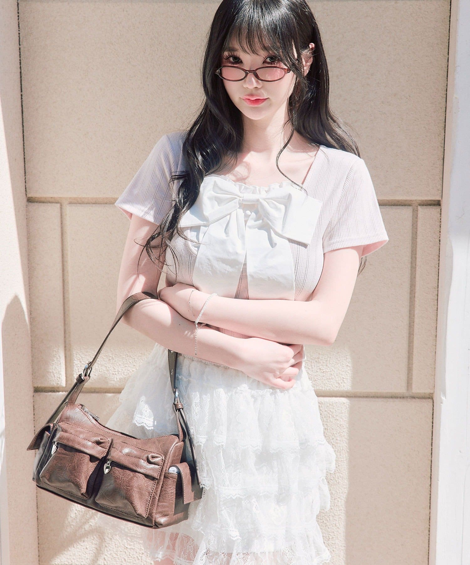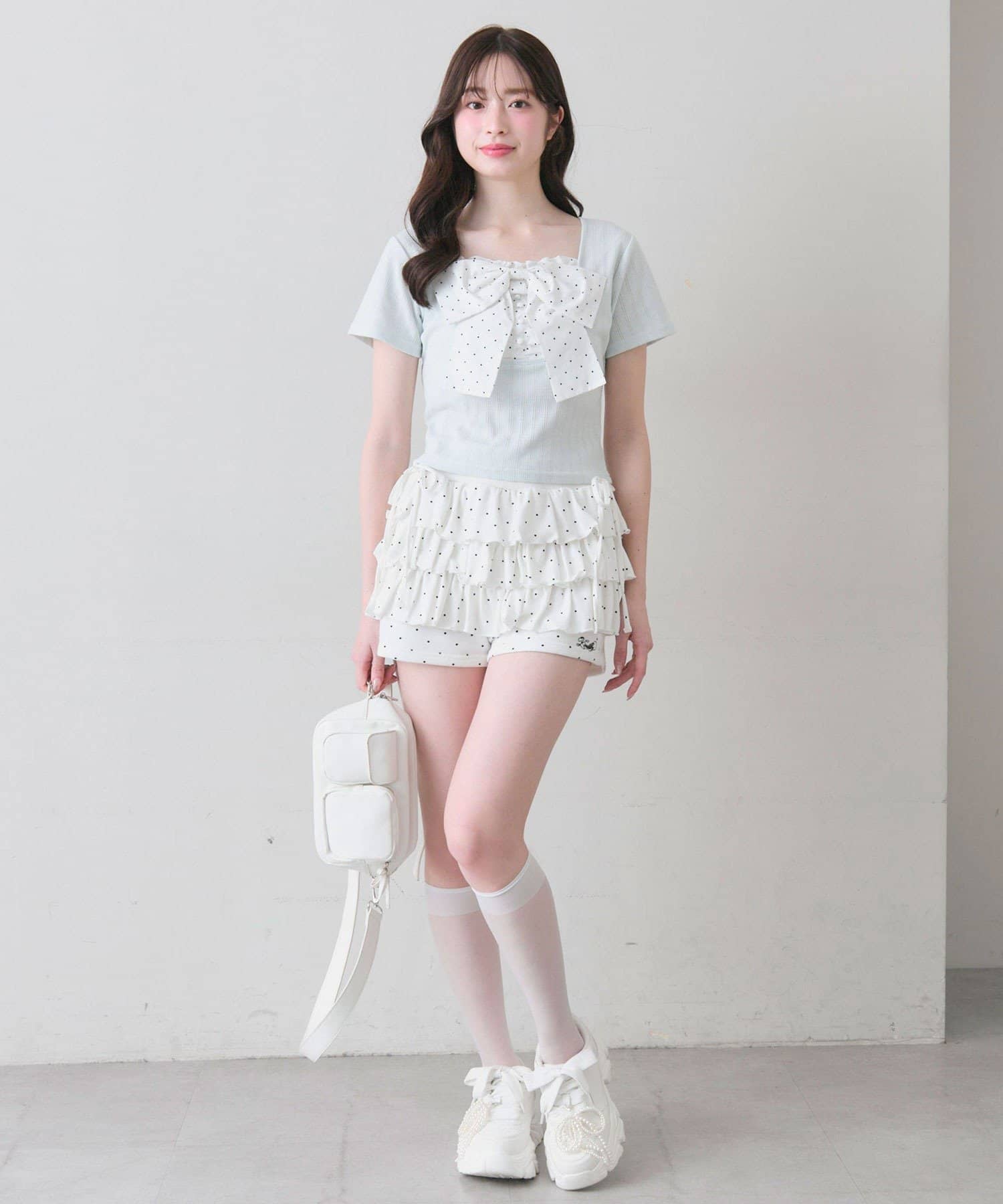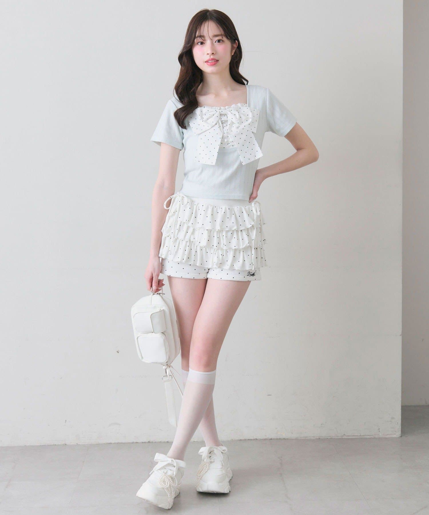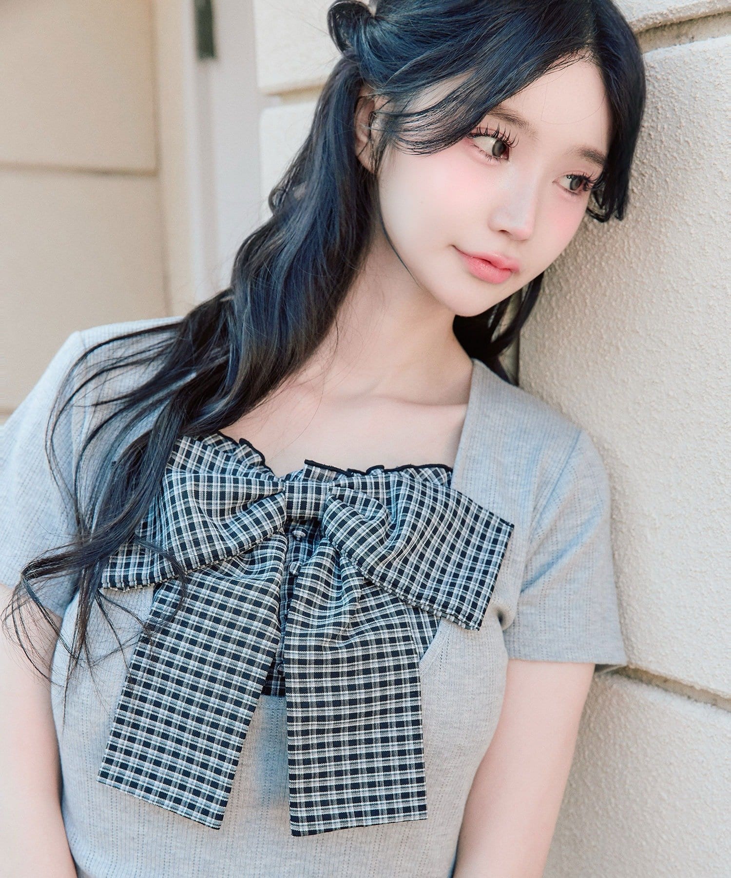 ・存在感たっぷりなリボンとレイヤード見えする異素材の組み合わせがかわいいデザイン。