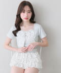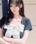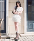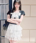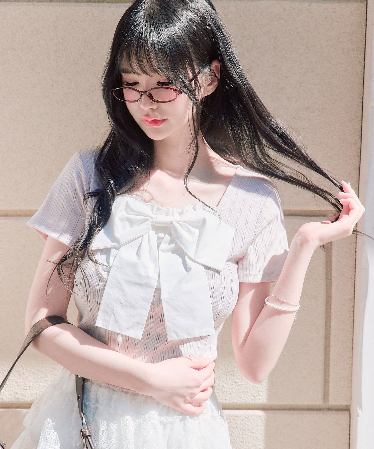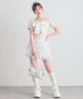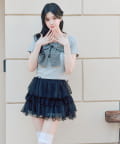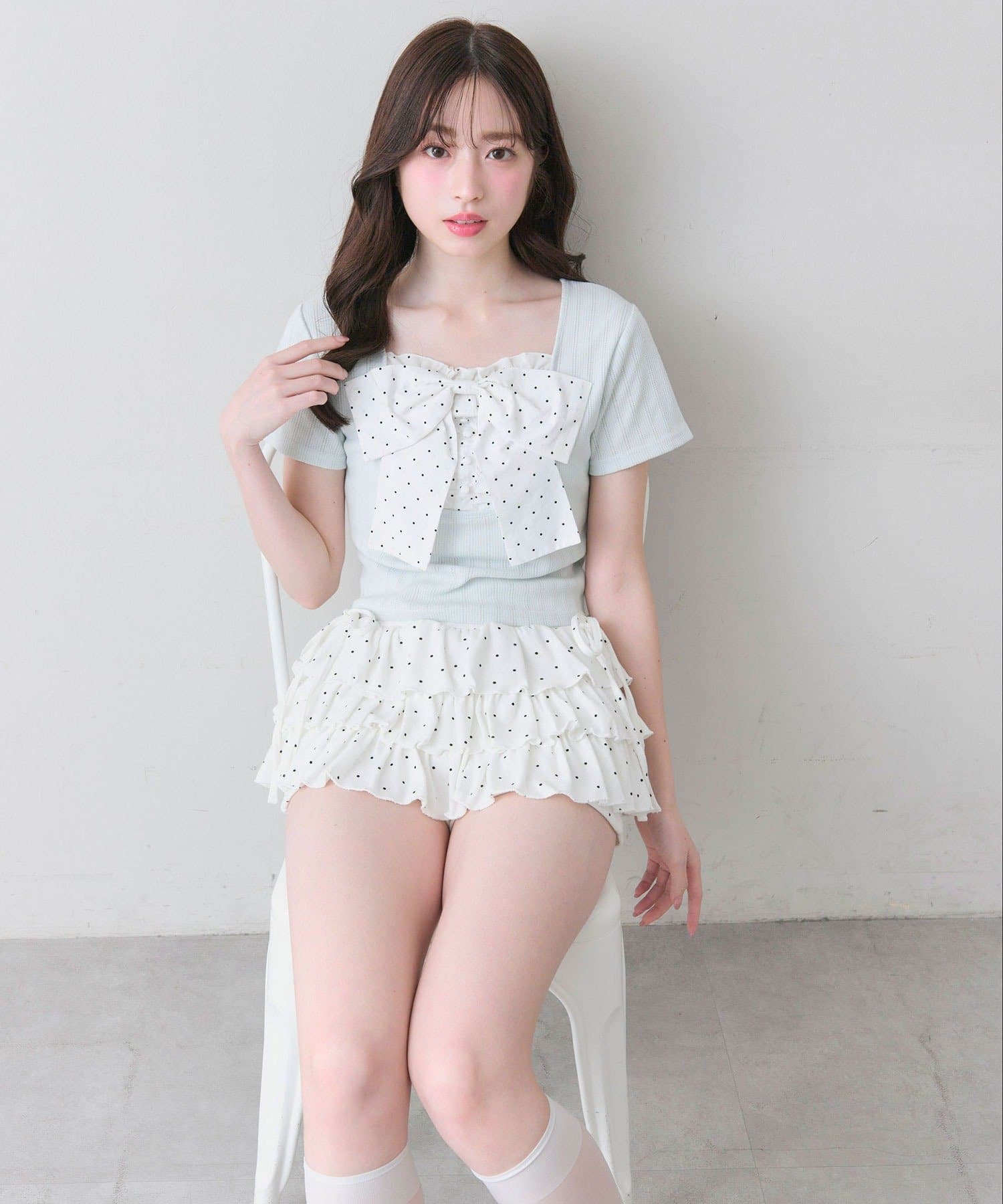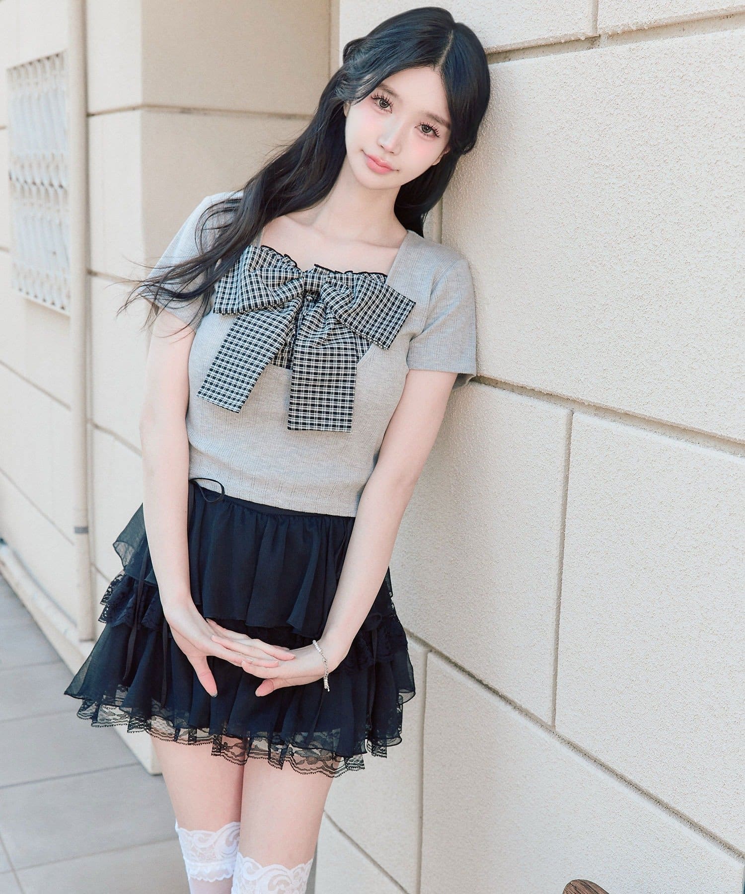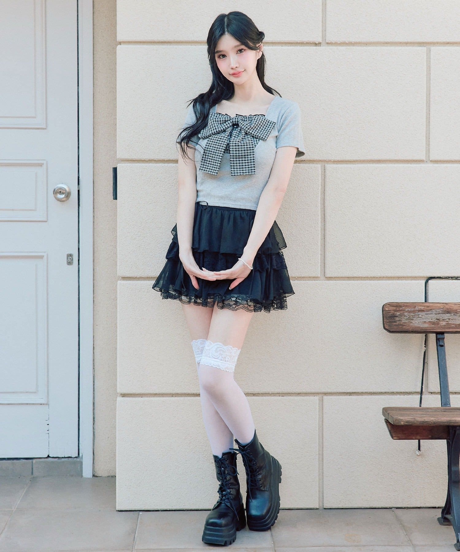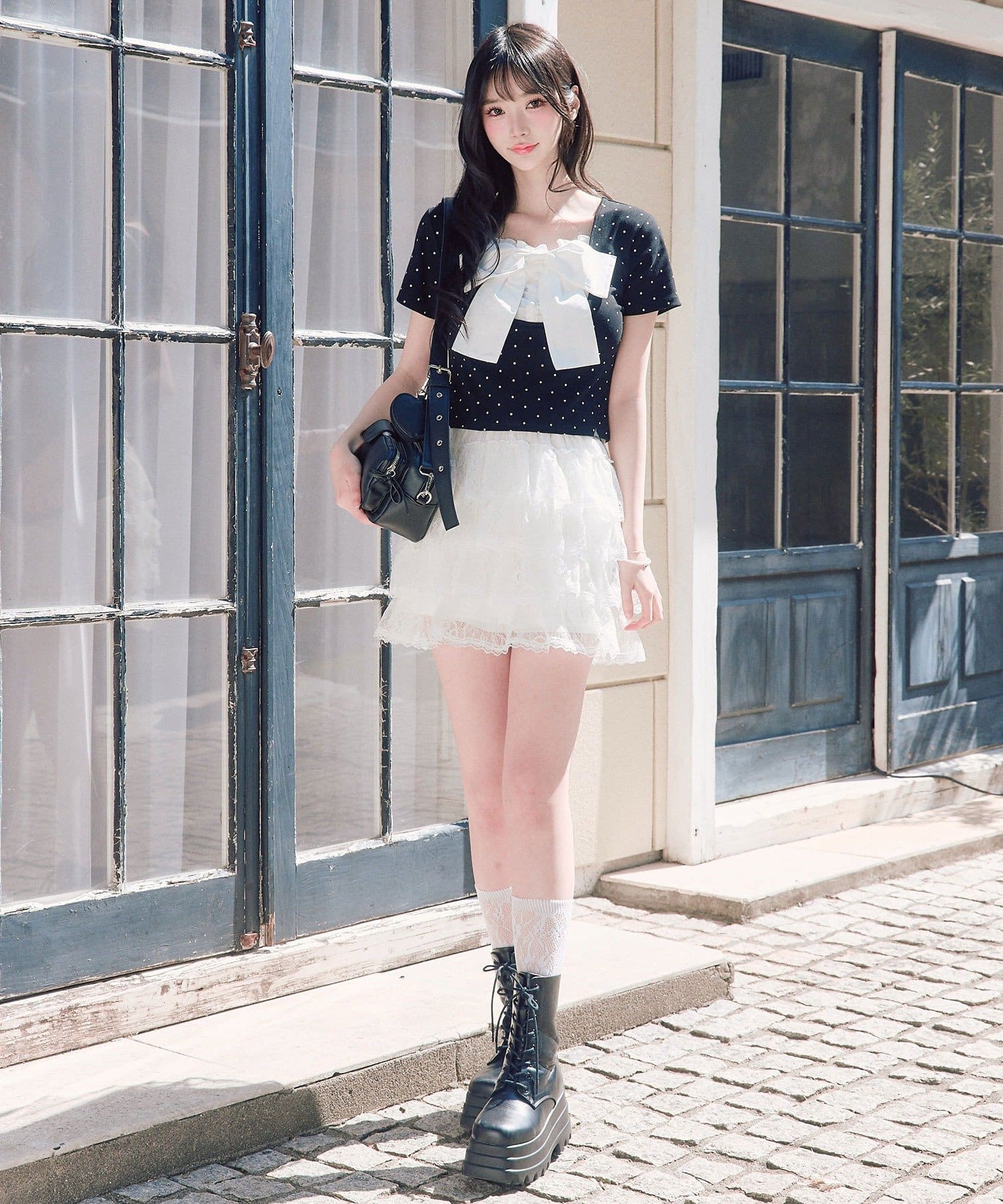 ・存在感たっぷりなリボンとレイヤード見えする異素材の組み合わせがかわいいデザイン。
