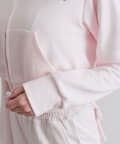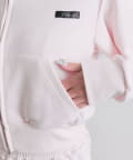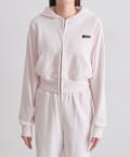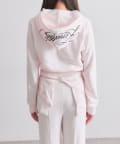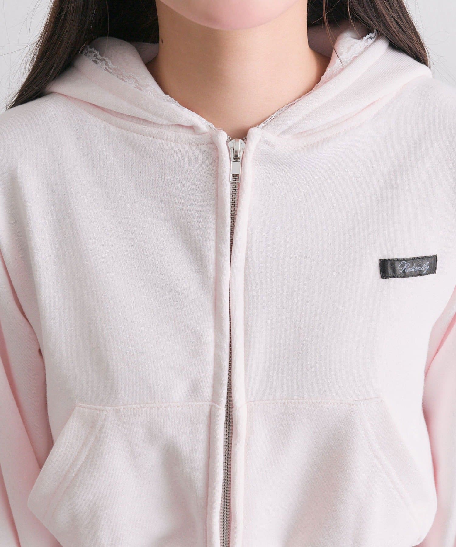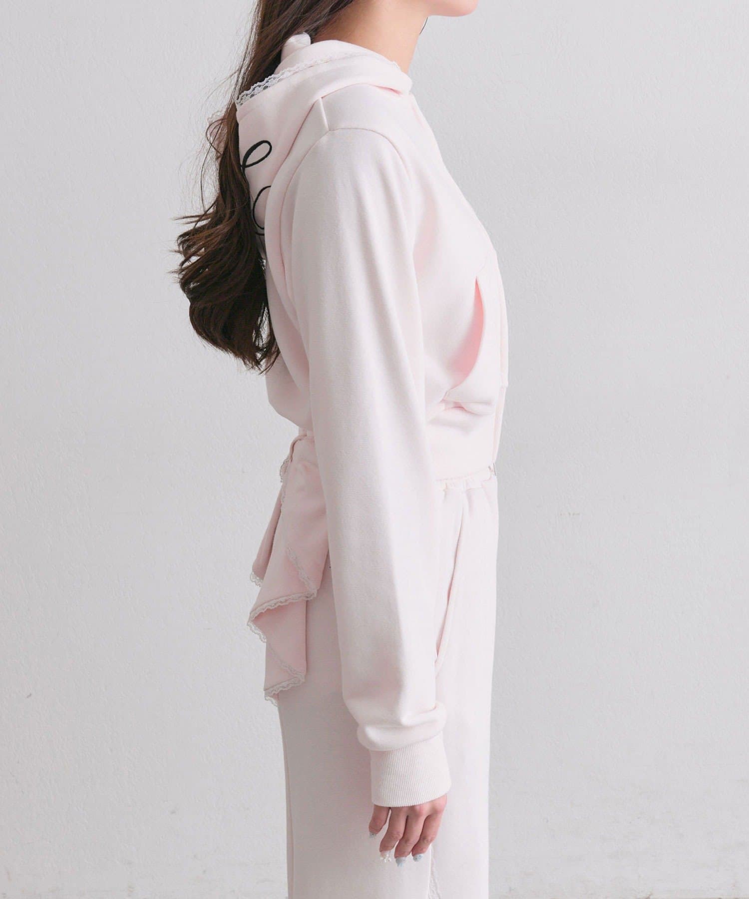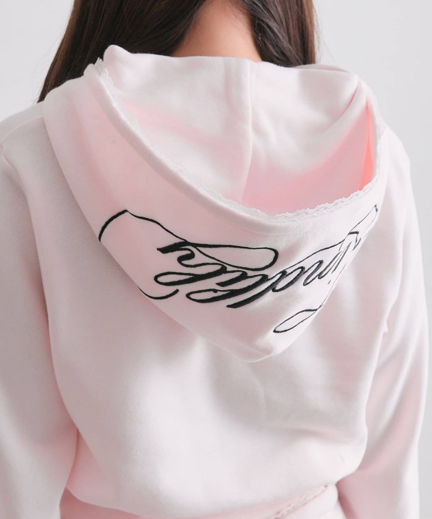 ・フードにロゴ刺繍やレースを施し、カジュアルアイテムながら甘さもあるデザイン。