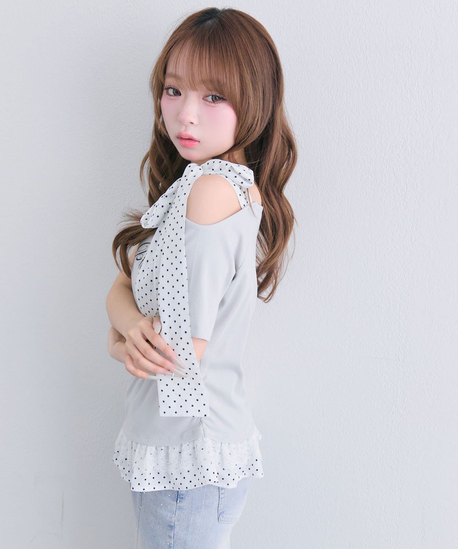 ・ワンショルですがリボンで肌が見えすぎず、程よい肌見せが叶います。