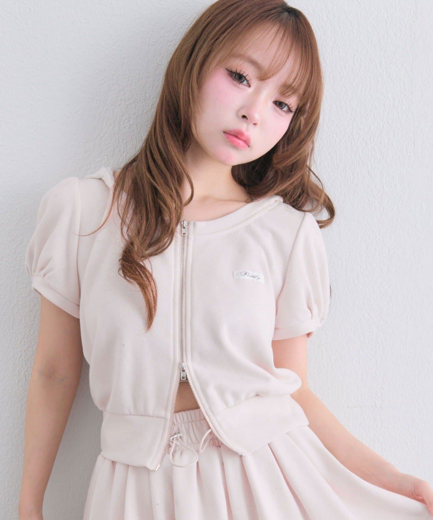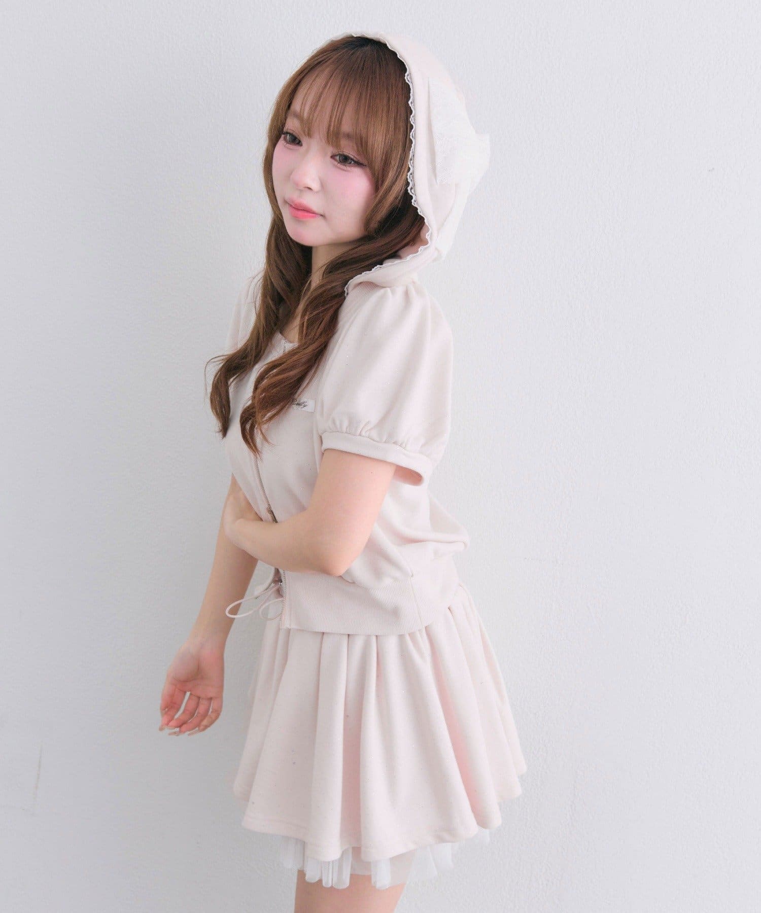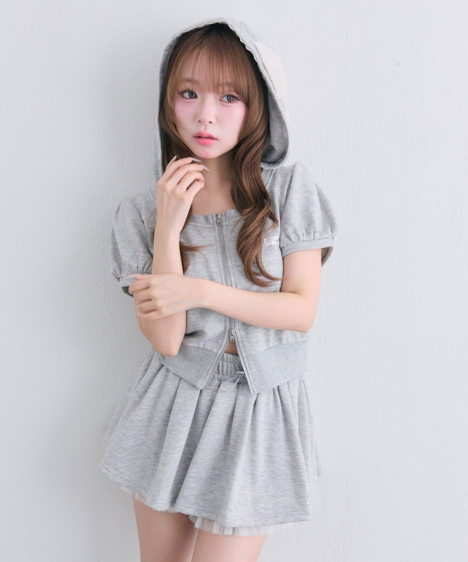 リボンフード半袖ジップパーカー
